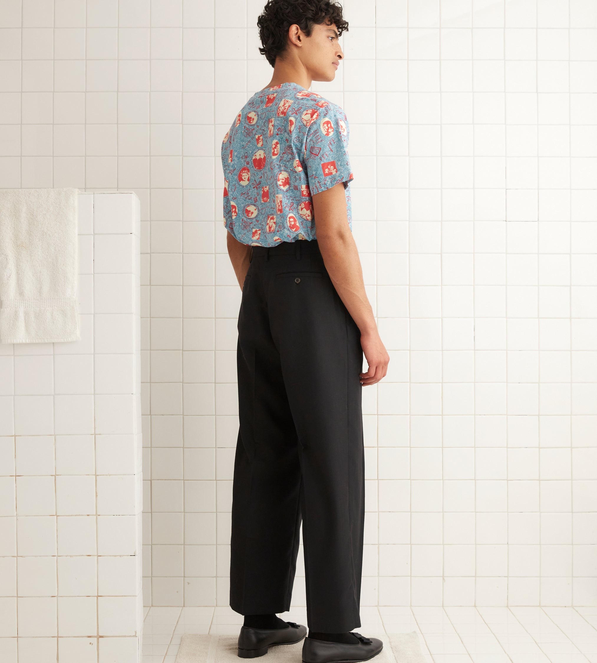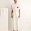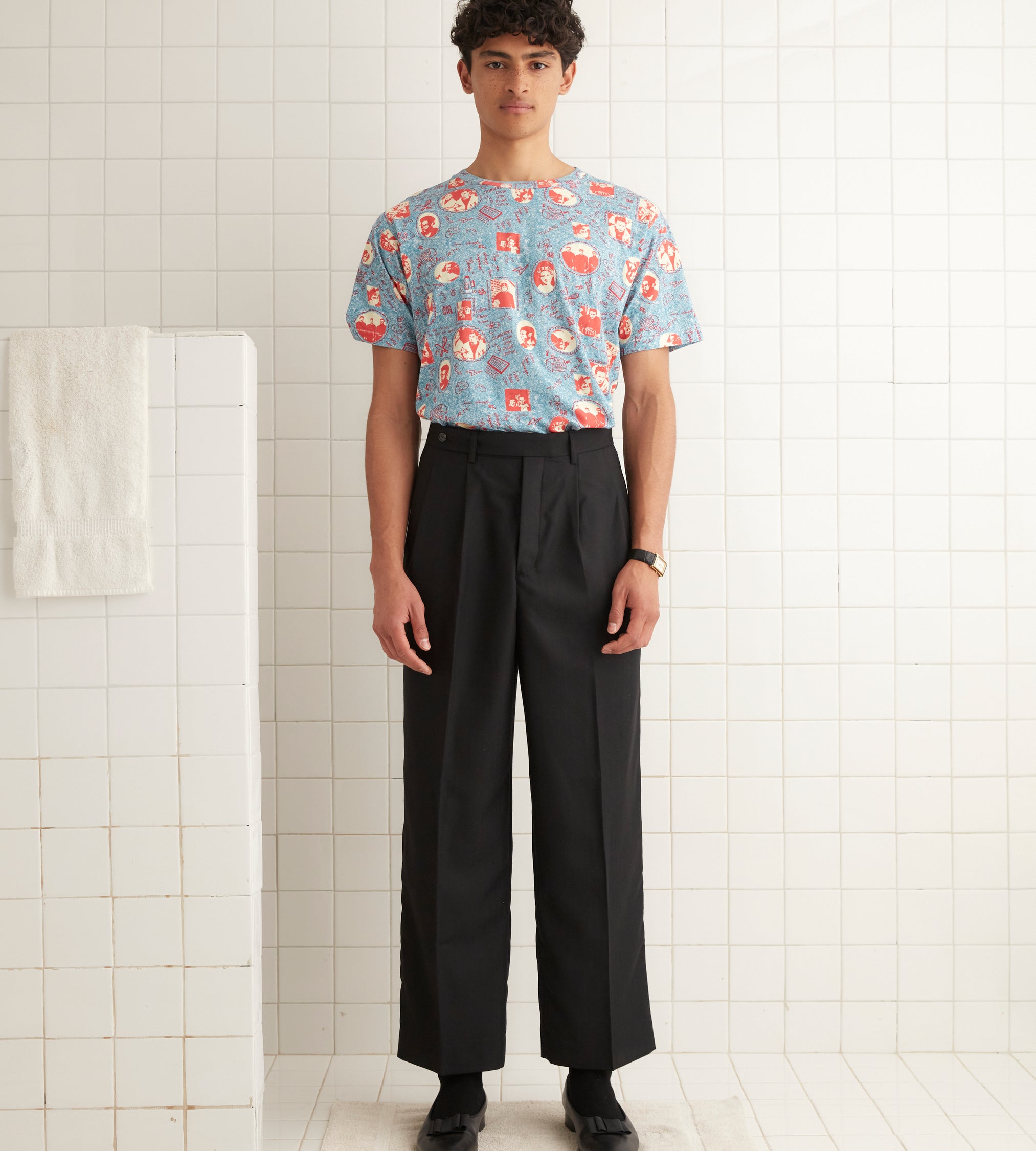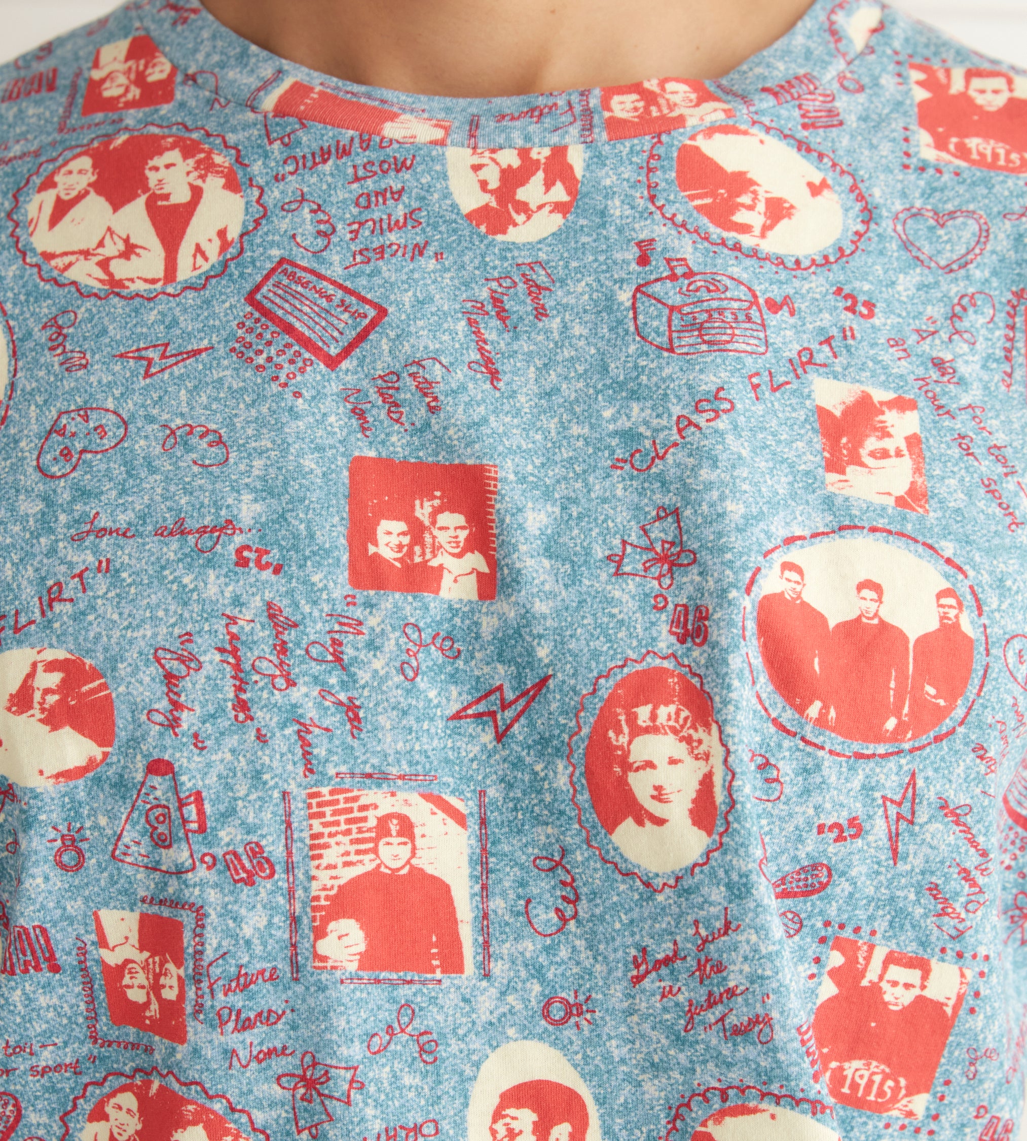 This tee is inspired by printed fabric from the 1950s-1960s. We reproduced the fabric, which was made to look like a signed yearbook page, for this style. The print includes red-and-white vintage photos and handwritten slogans, doodles, and signatures.