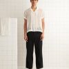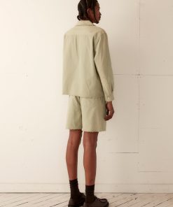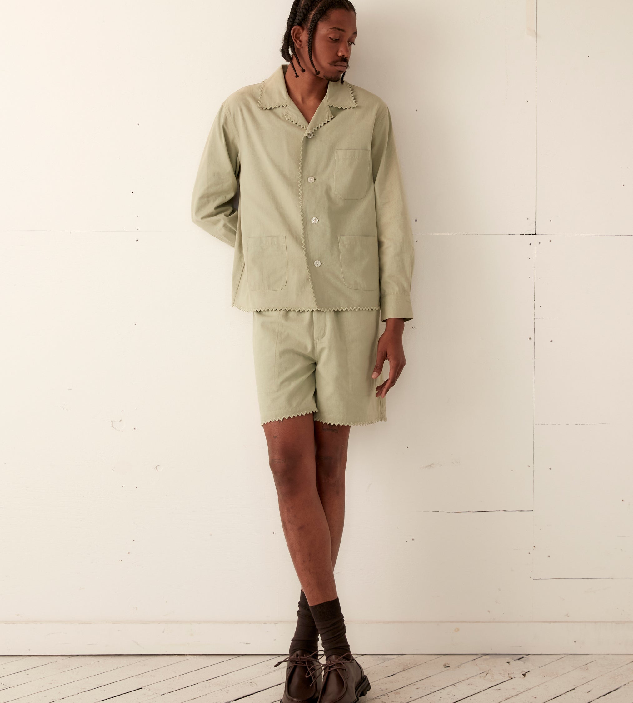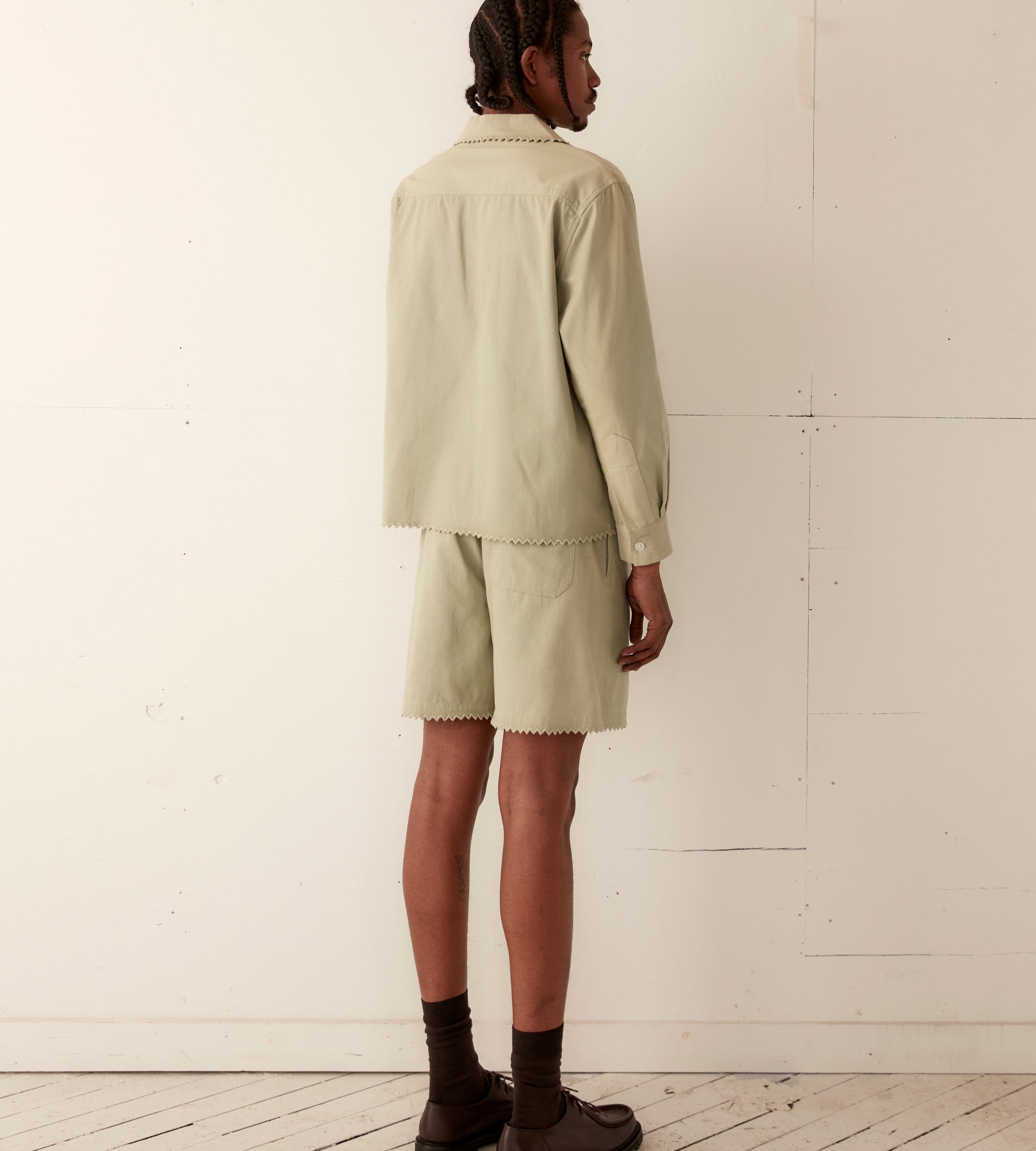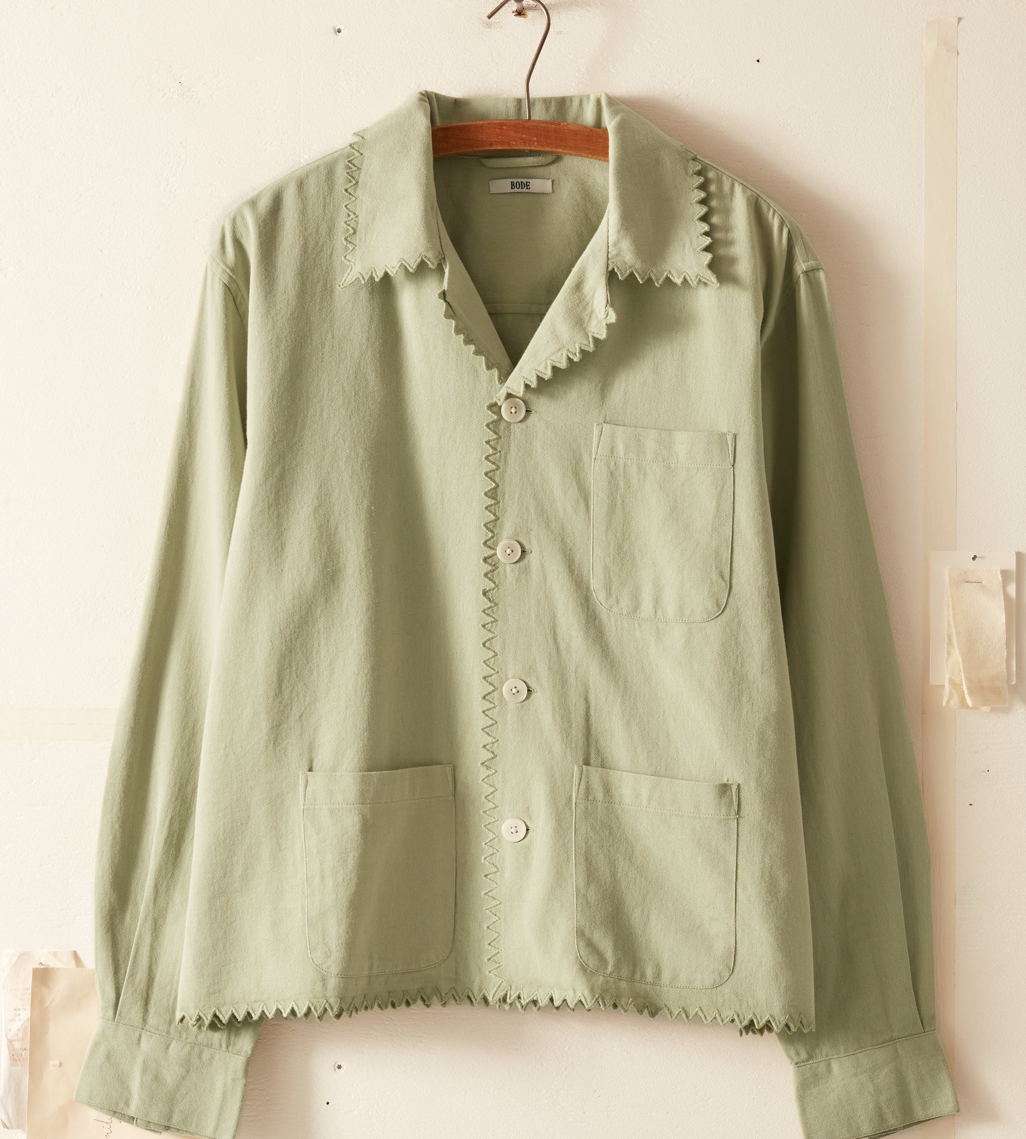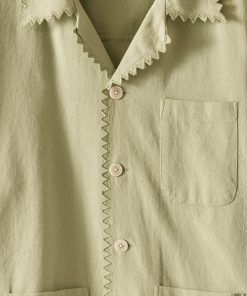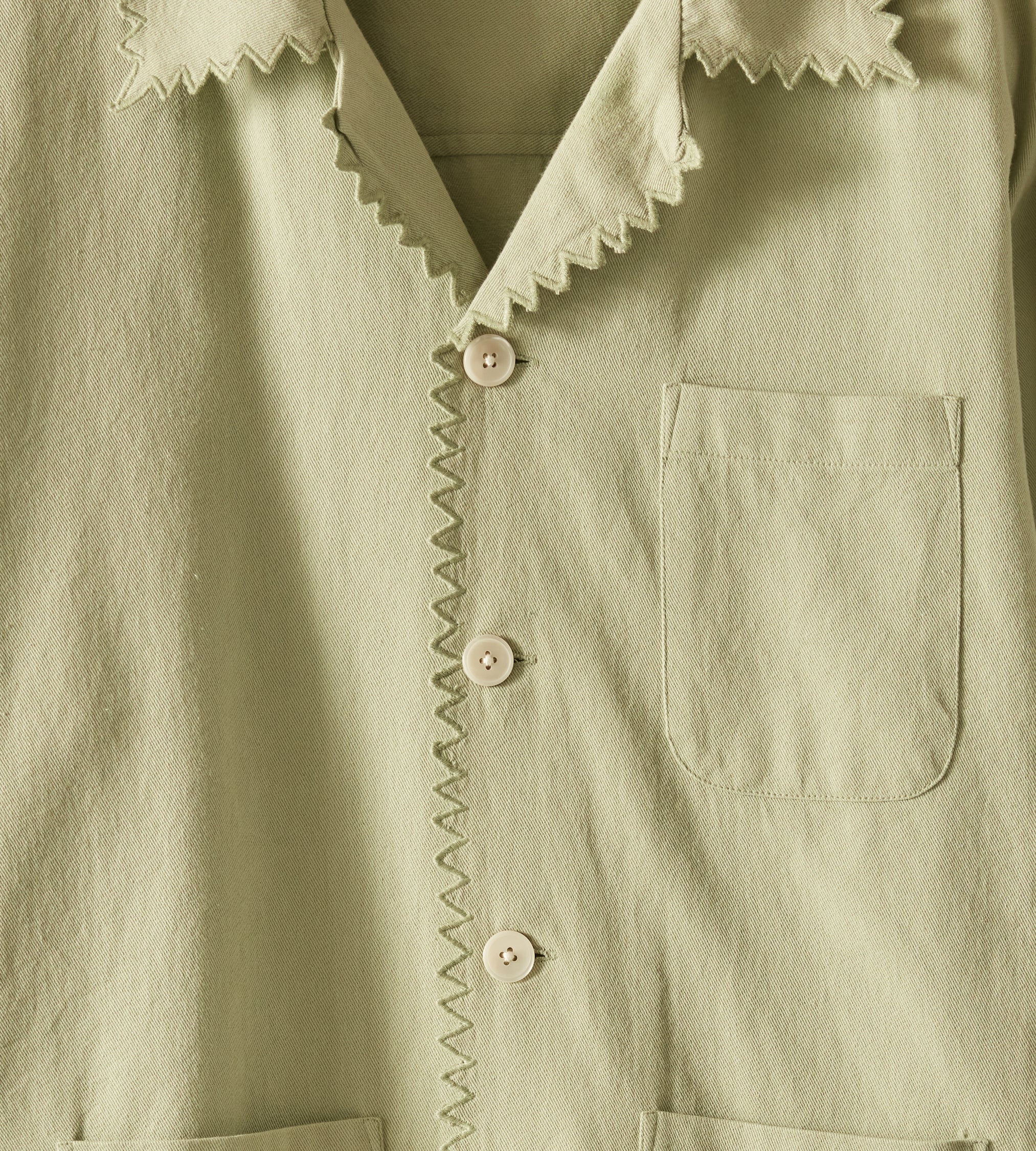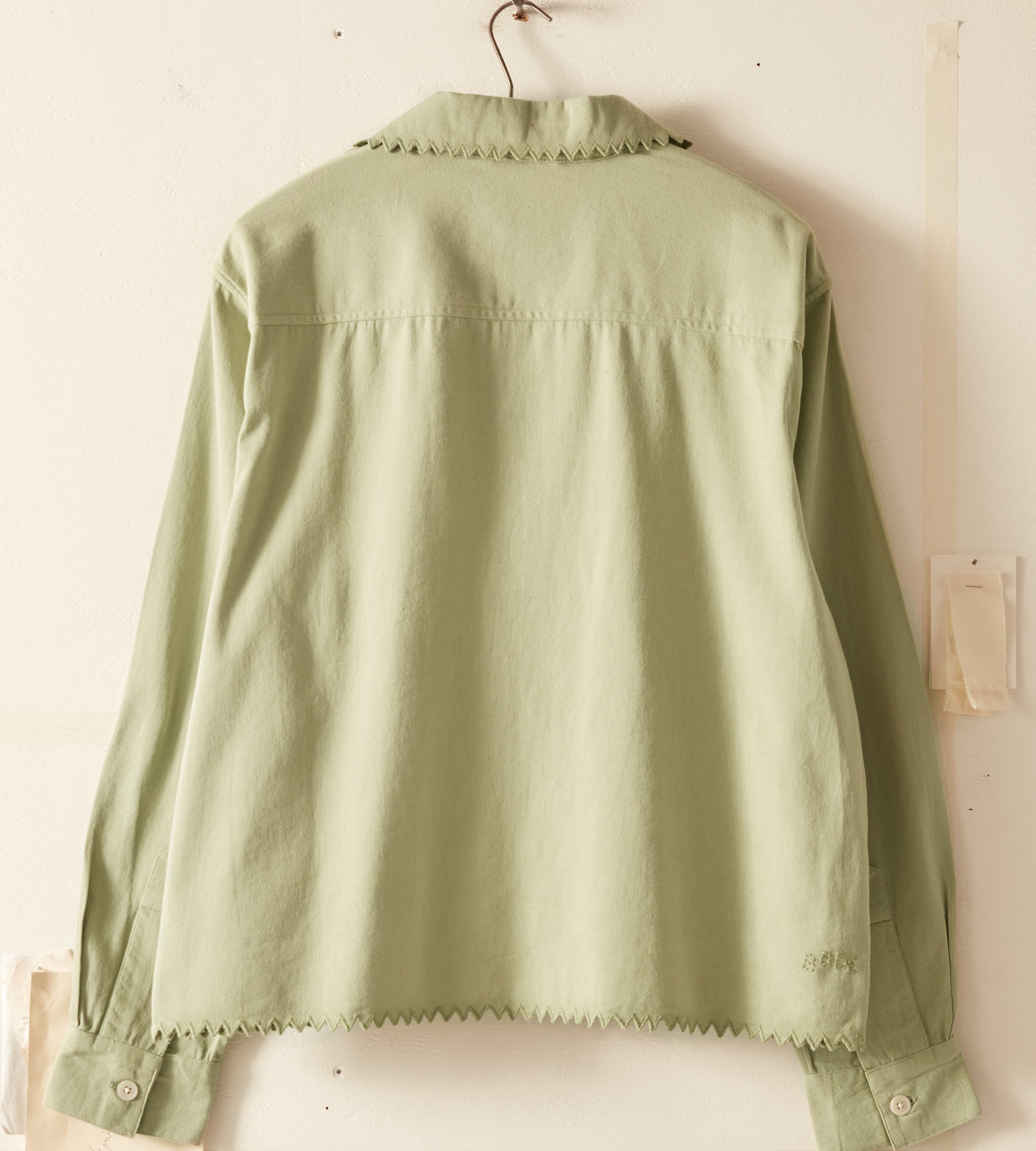 This shirt is inspired by a vintage shirt from the 1940s. The zig-zag seam of the original piece has been reproduced here along the hem, placket, and collar.