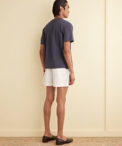These shorts are inspired by a vintage shirt from the 1940s. The zig-zag seam of the original piece has been reproduced here along the hem. The shorts have a short inseam and a wide leg opening.