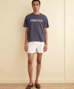 These shorts are inspired by a vintage shirt from the 1940s. The zig-zag seam of the original piece has been reproduced here along the hem. The shorts have a short inseam and a wide leg opening.
