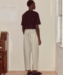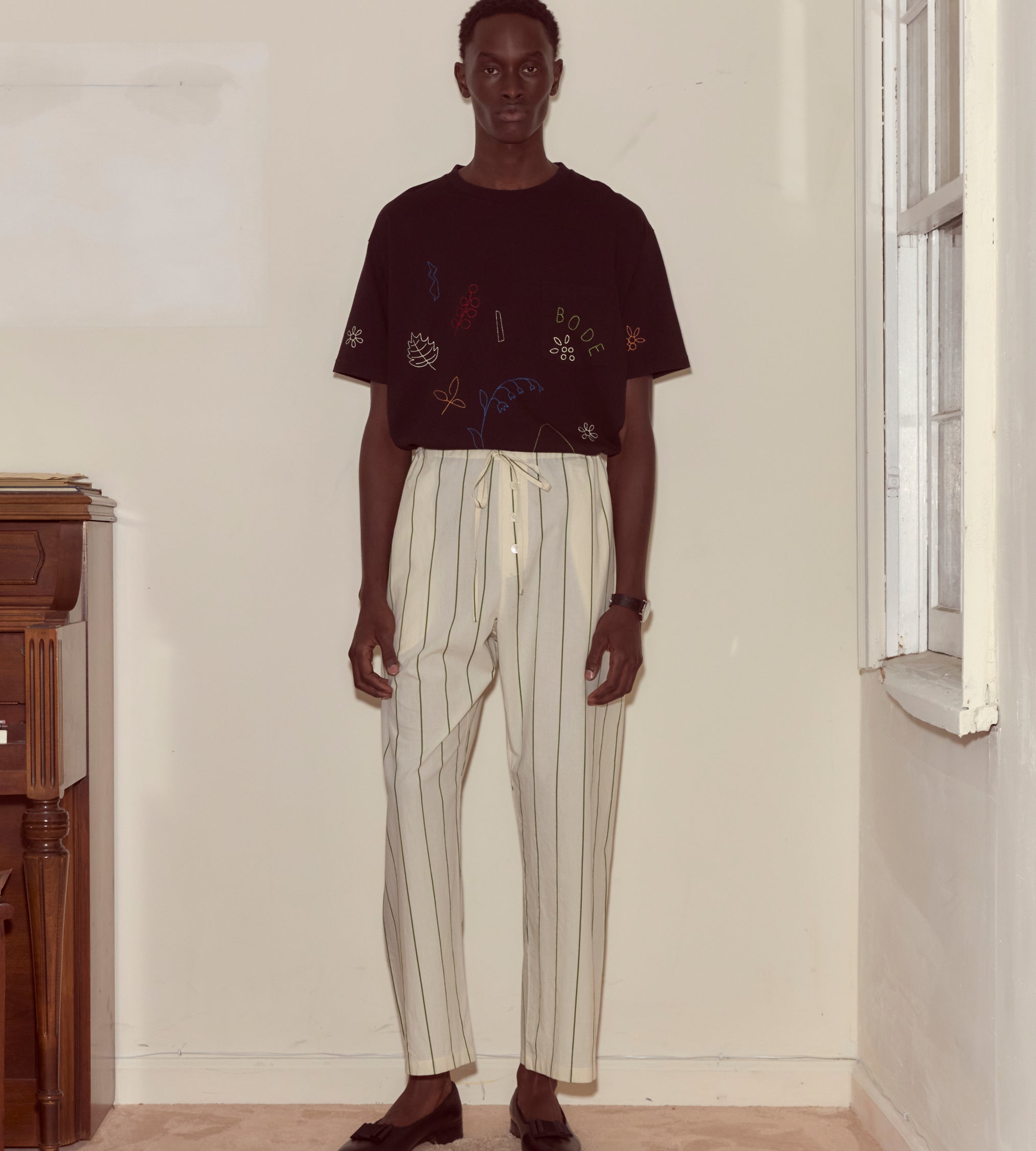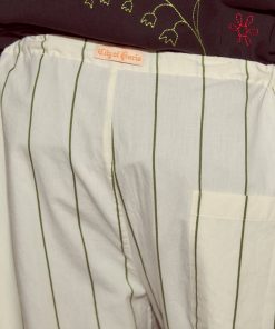 These pajama pants are inspired by fabric from a shirting sample book, c.1930s. The book would have been used in tailor shops and department stores to display shirting options for customers. We reproduced one of the striped swatches for this style.