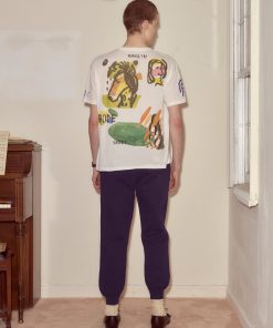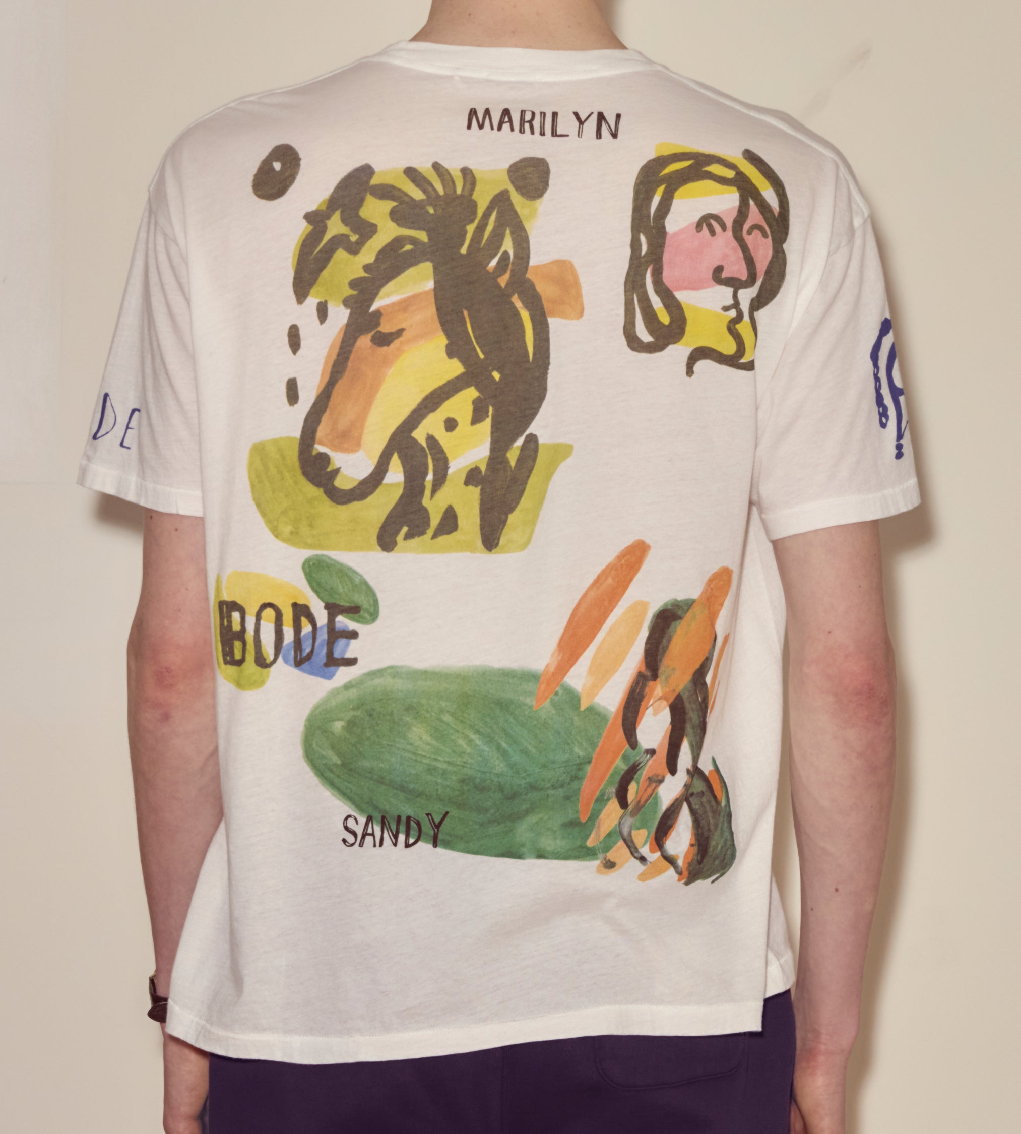 Moose Charlap and his writing partner, Eddie Lawrence, shared an eye for Modernist art, and both filled their homes with art purchased from young artists in Paris. This tee, with its abstract colorblocking and handwritten “Eddie and Moose,” “Marilyn and Sandy,” is an imagined souvenir from their travels—Moose with his wife Sandy and Eddie with his wife Marilyn.