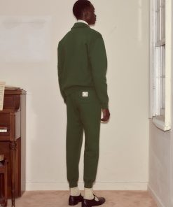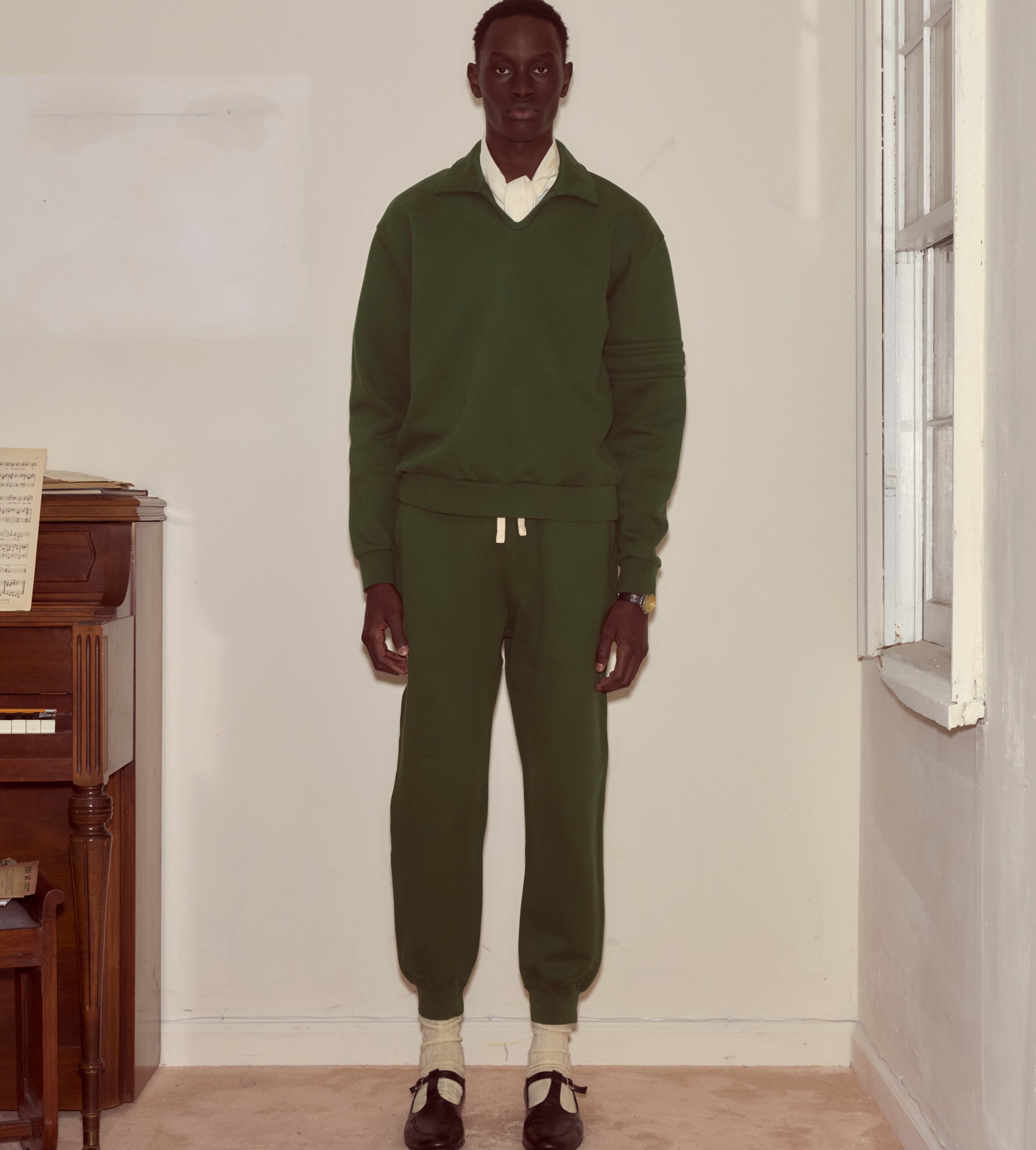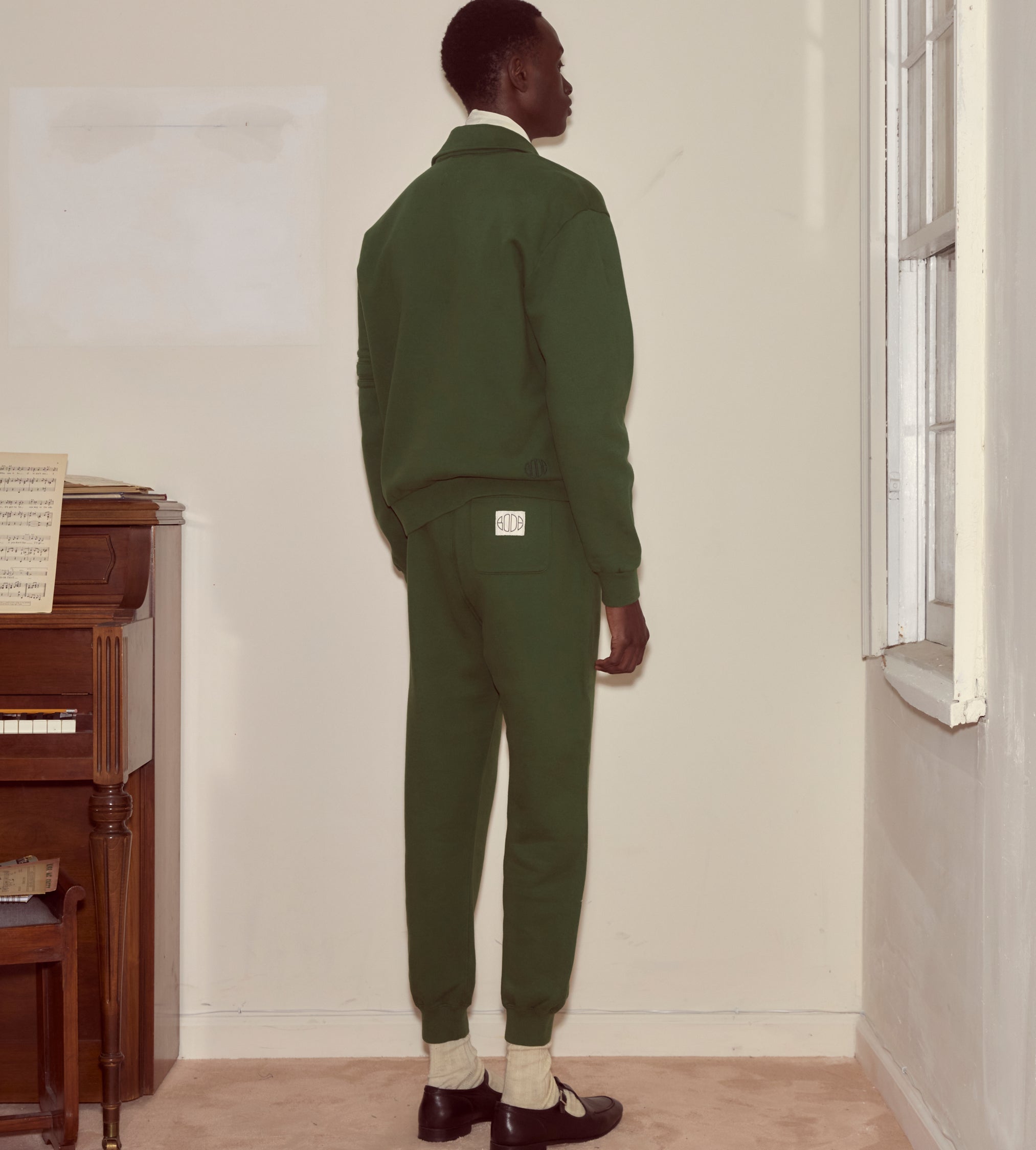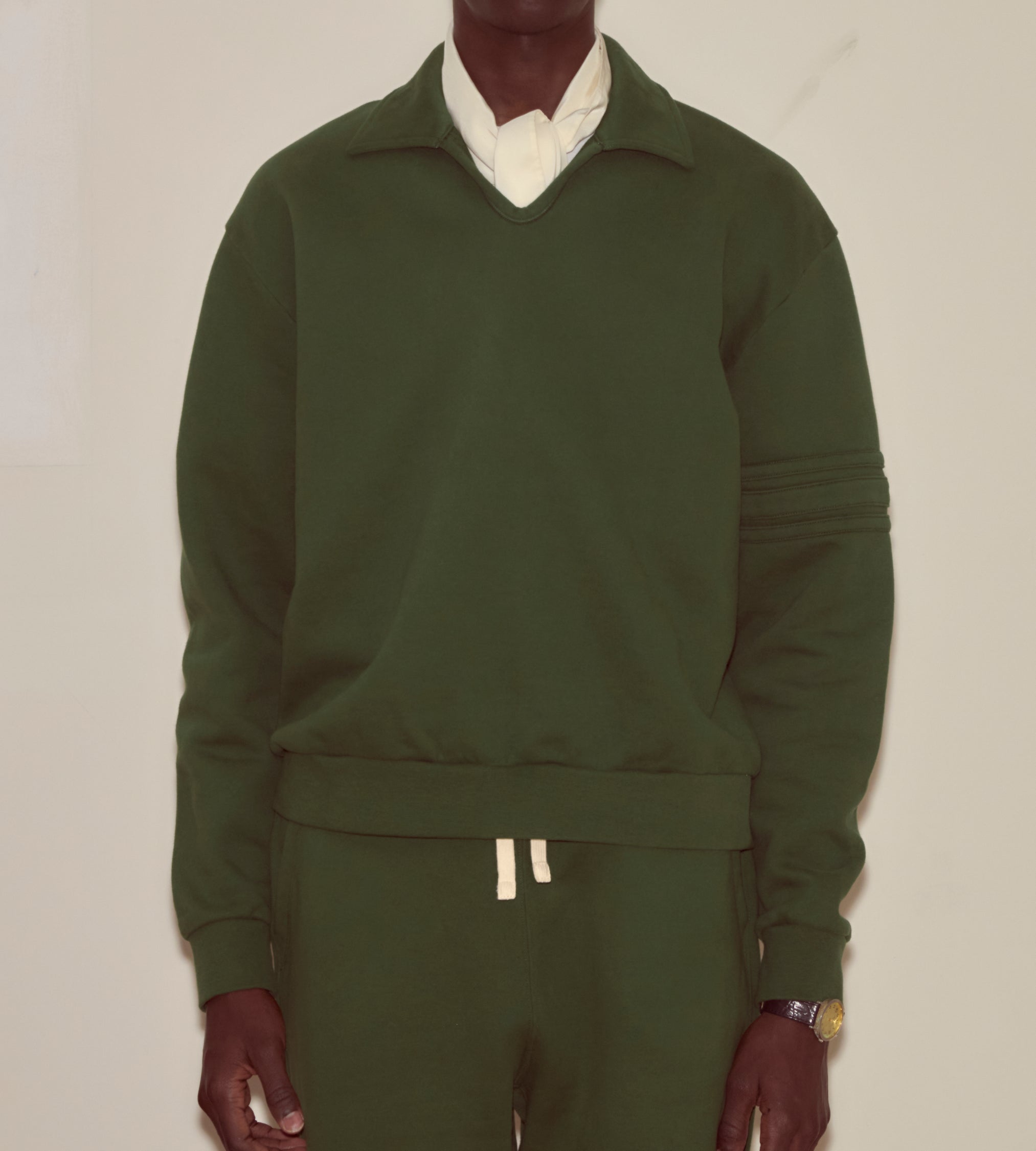 This pullover is made from midweight cotton fleece. It features a tonal double-stripe appliqué around one arm.