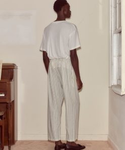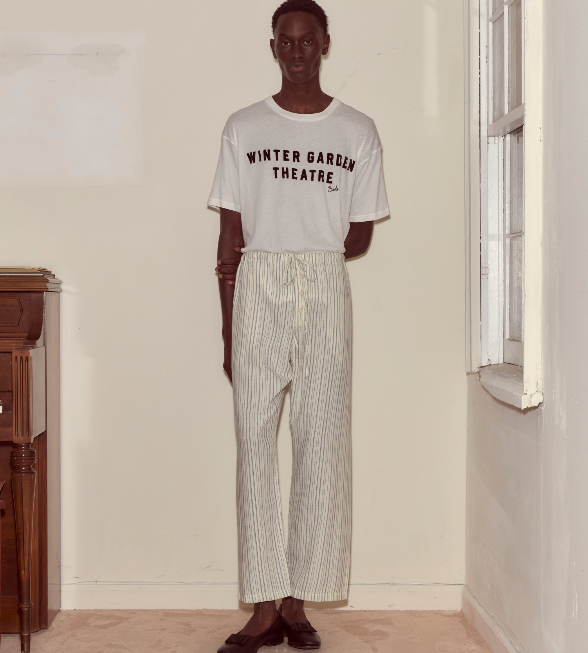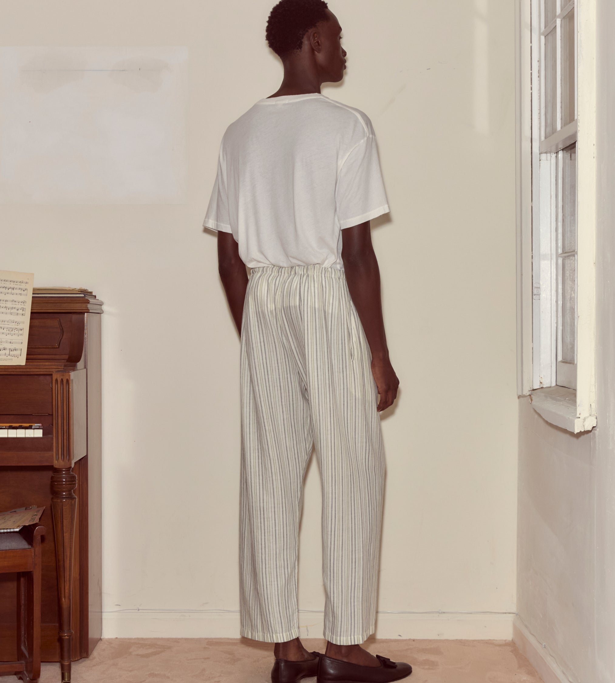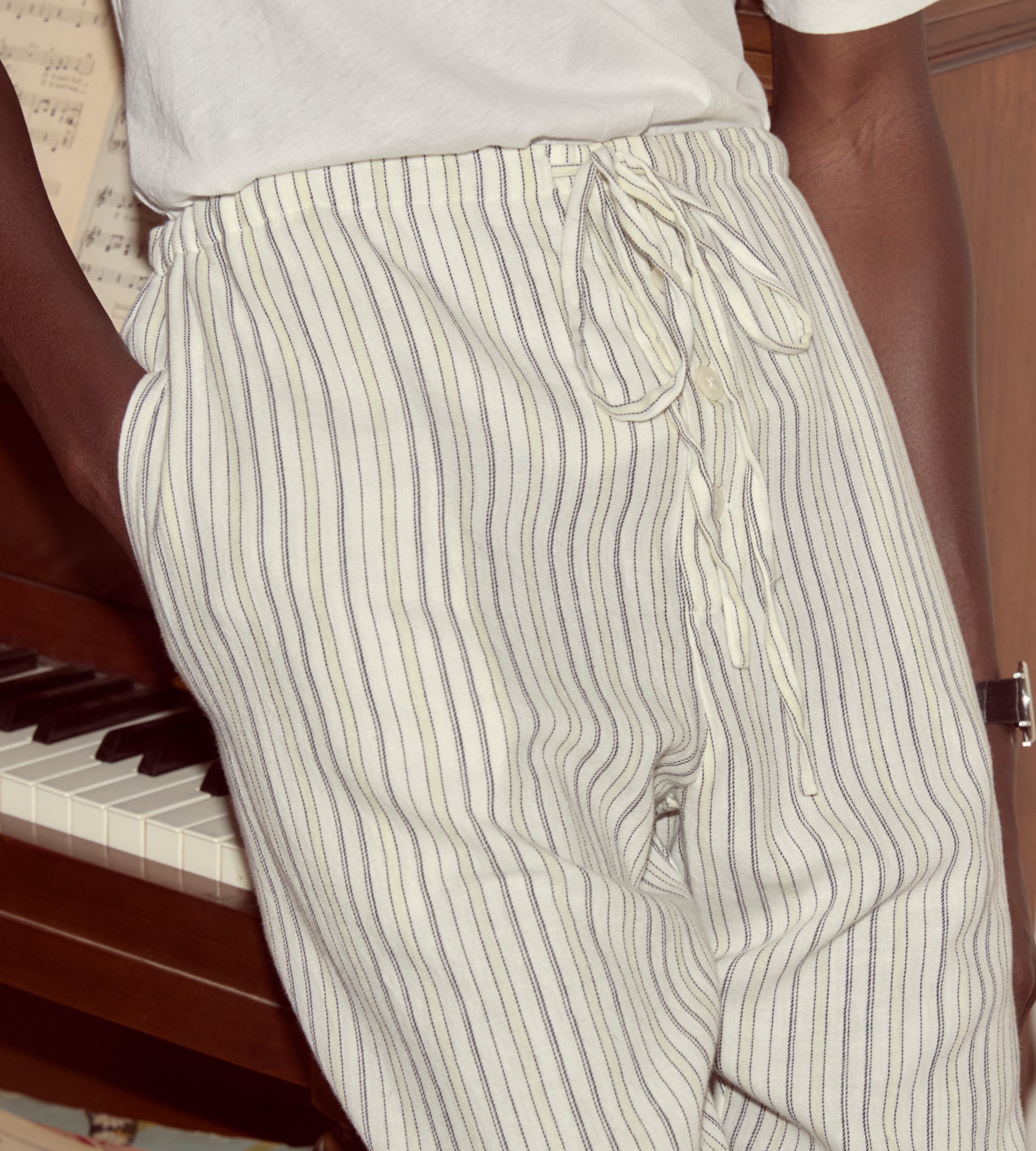 These flannel pajama pants are woven with a pale yellow and black stripe. They are cut in a classic silhouette, with an adjustable drawstring waist.