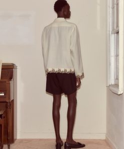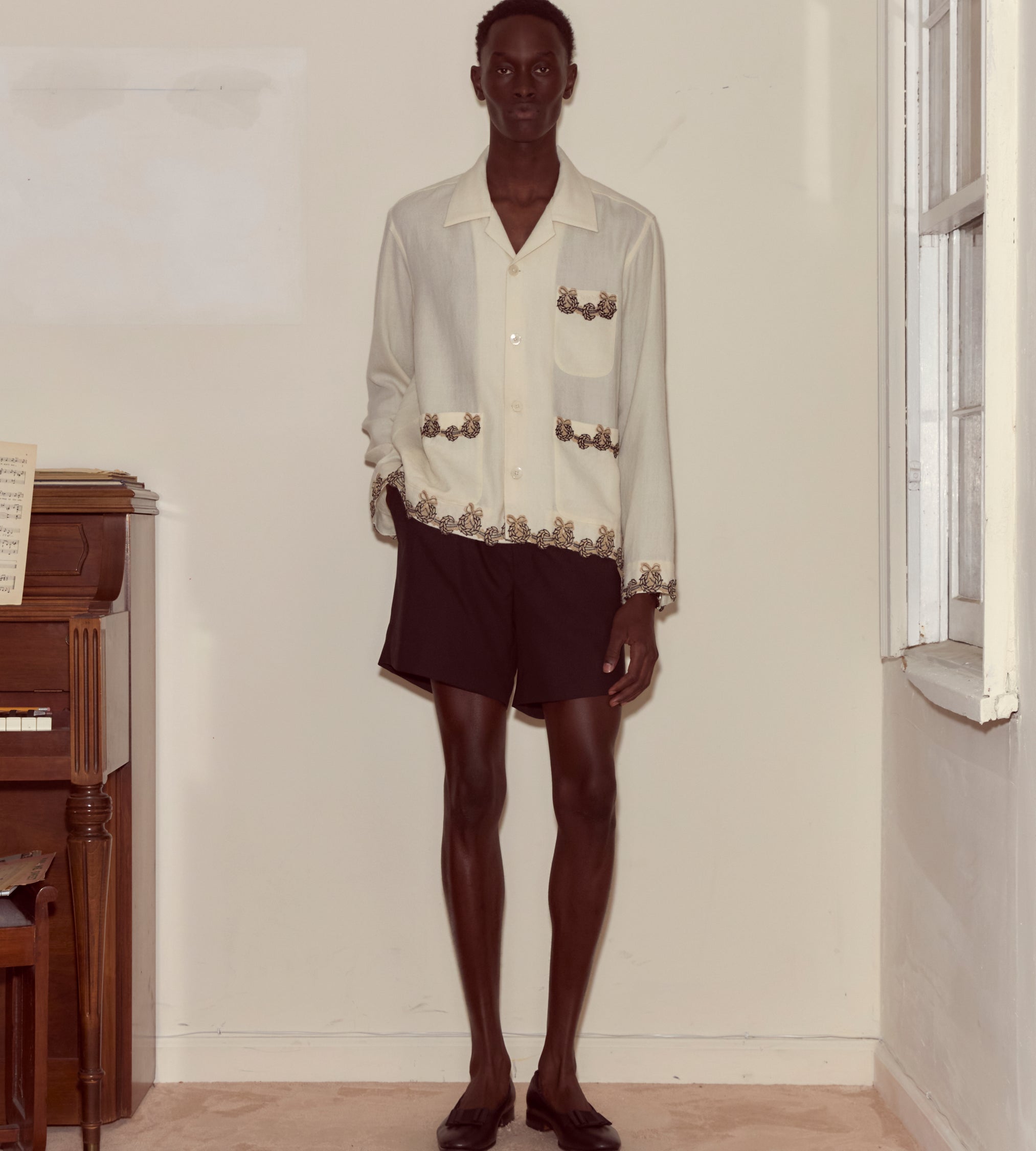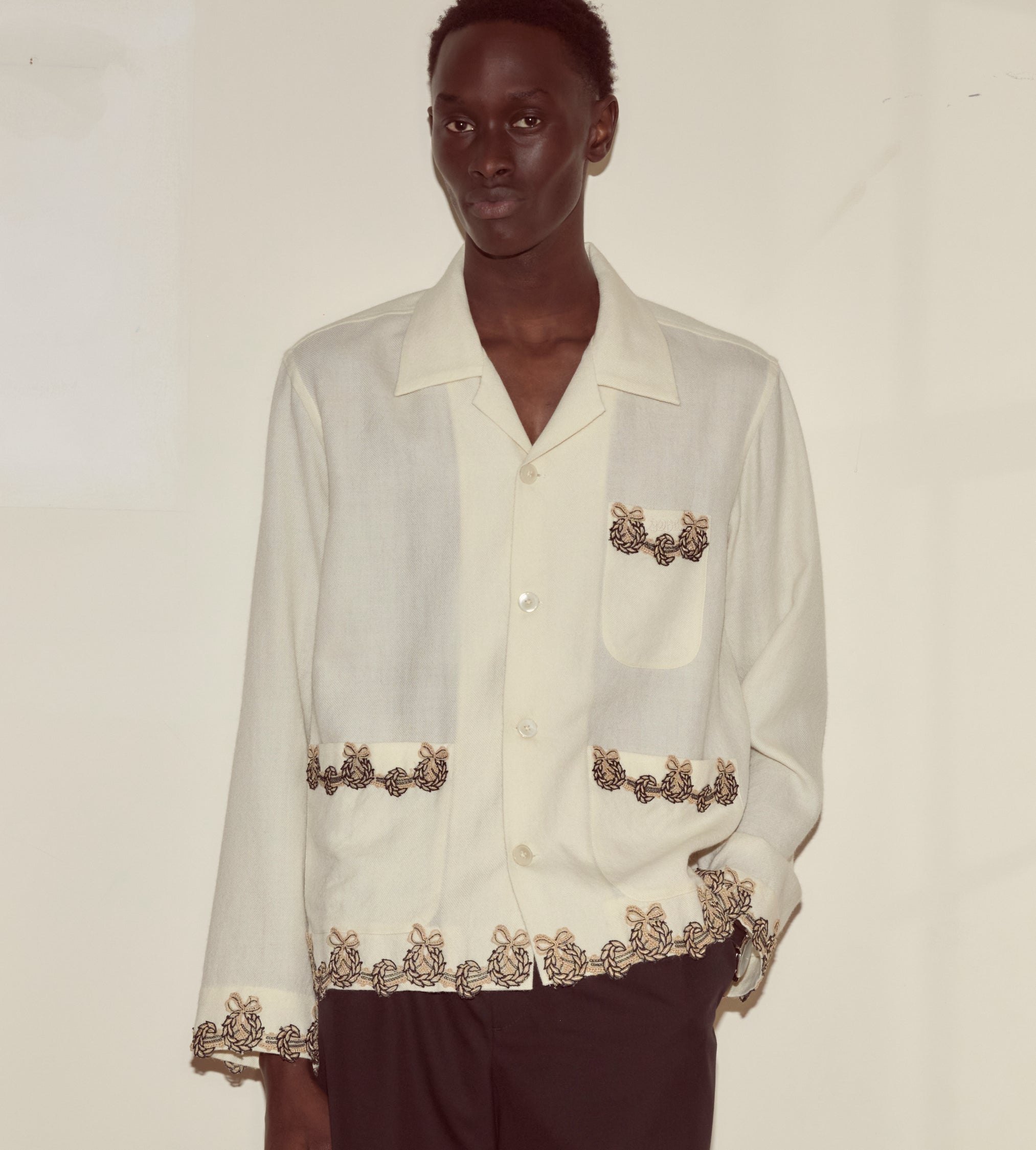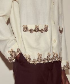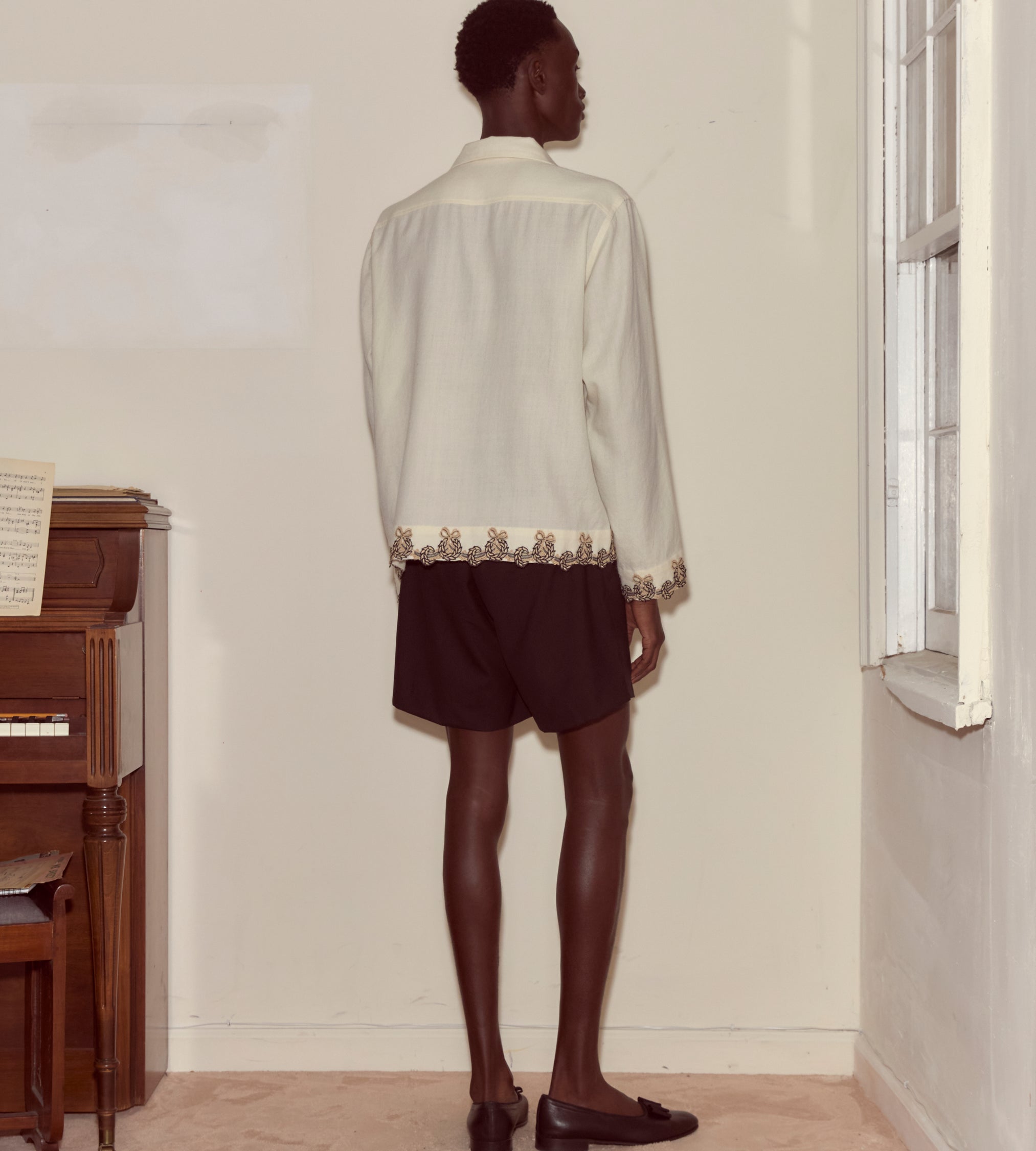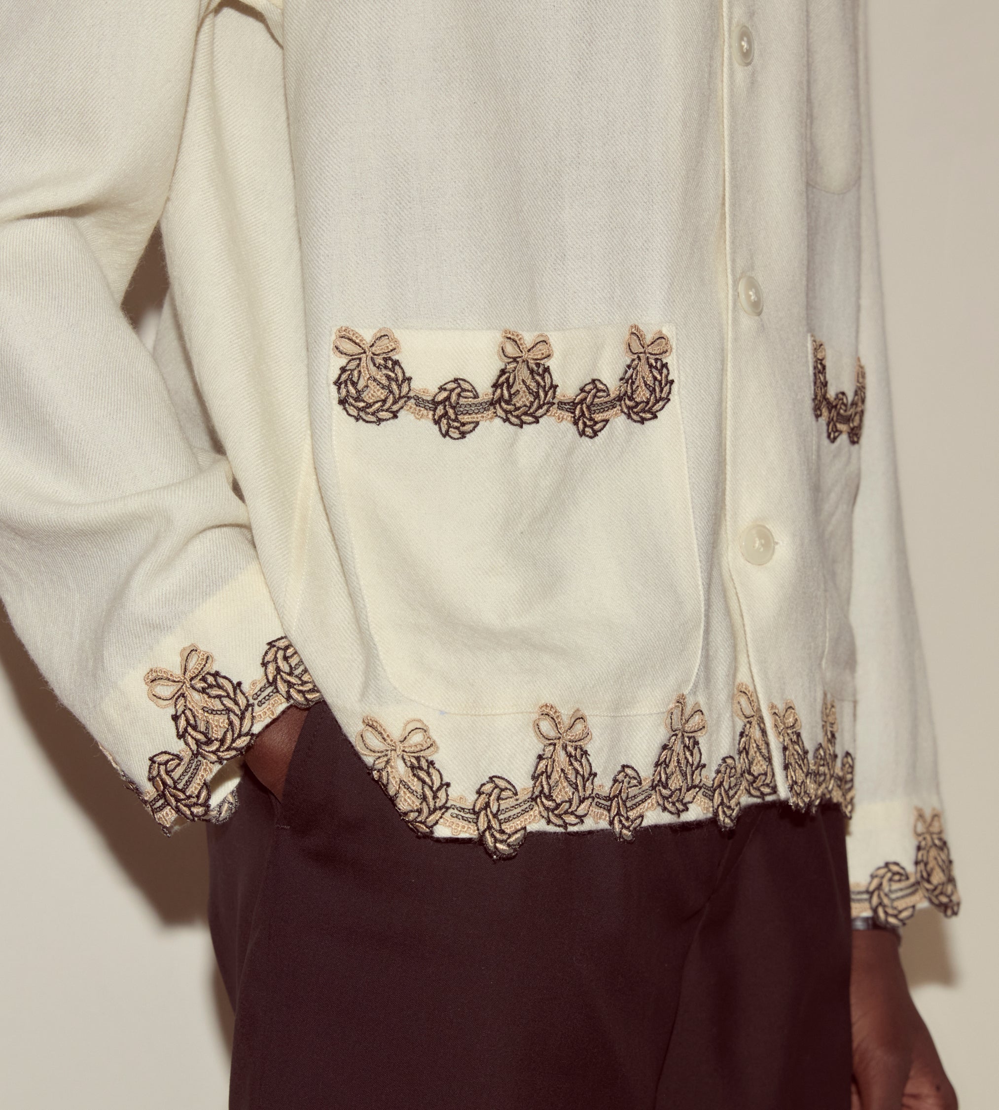 This shirt is embellished with a wreath-and-garland trim, a reproduction of vintage passementerie bought in Paris. It is cut from soft flannel.