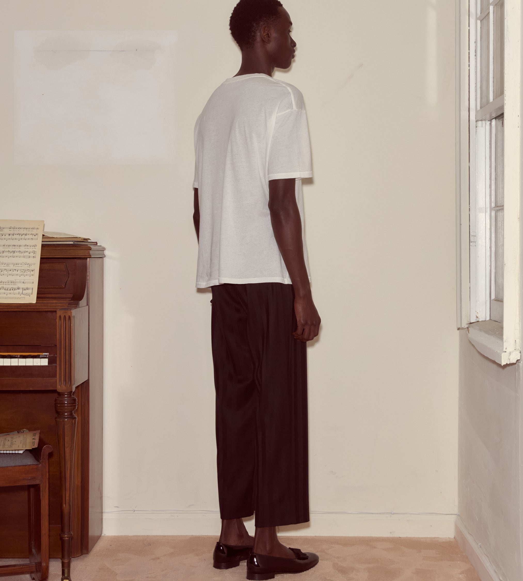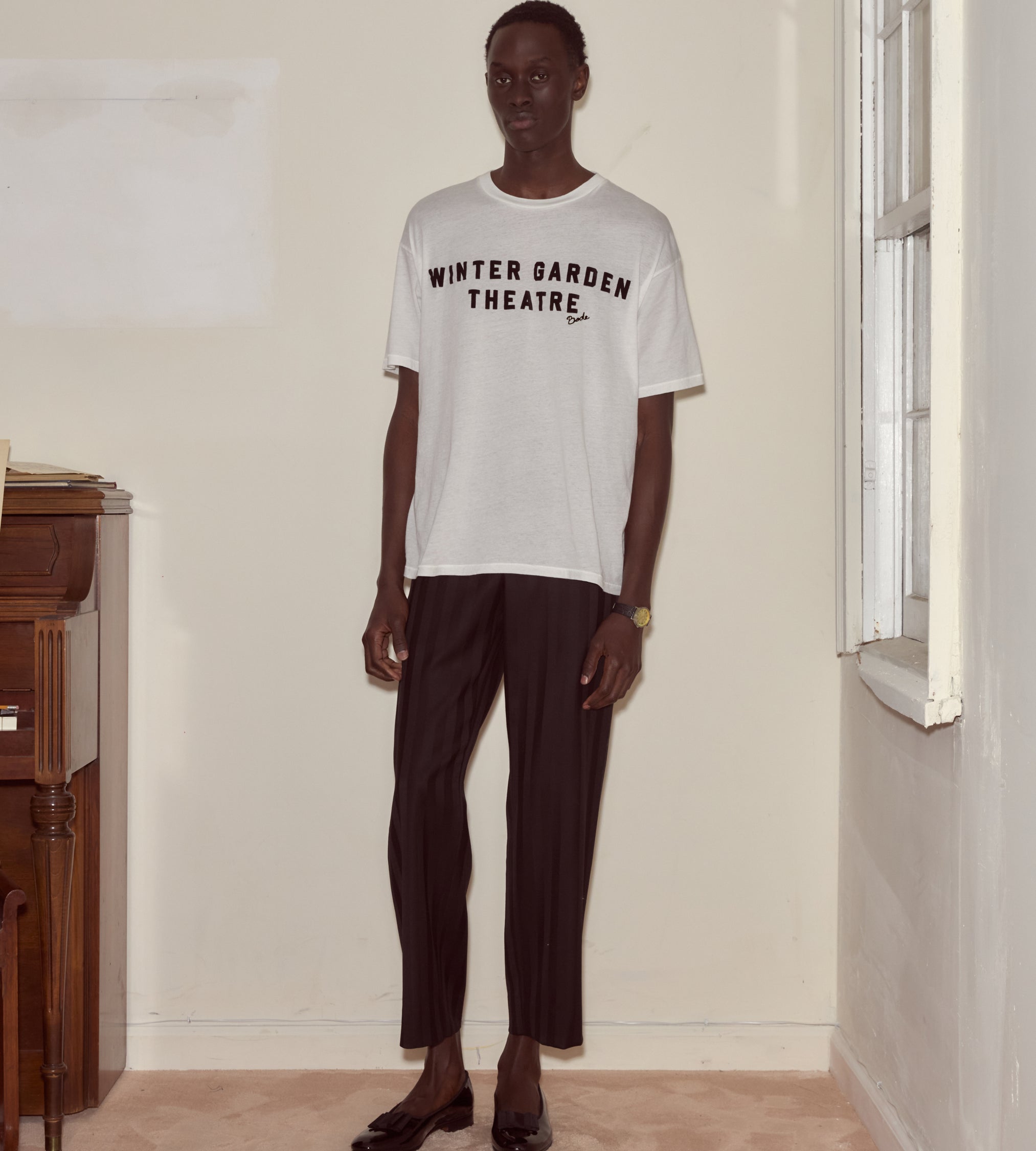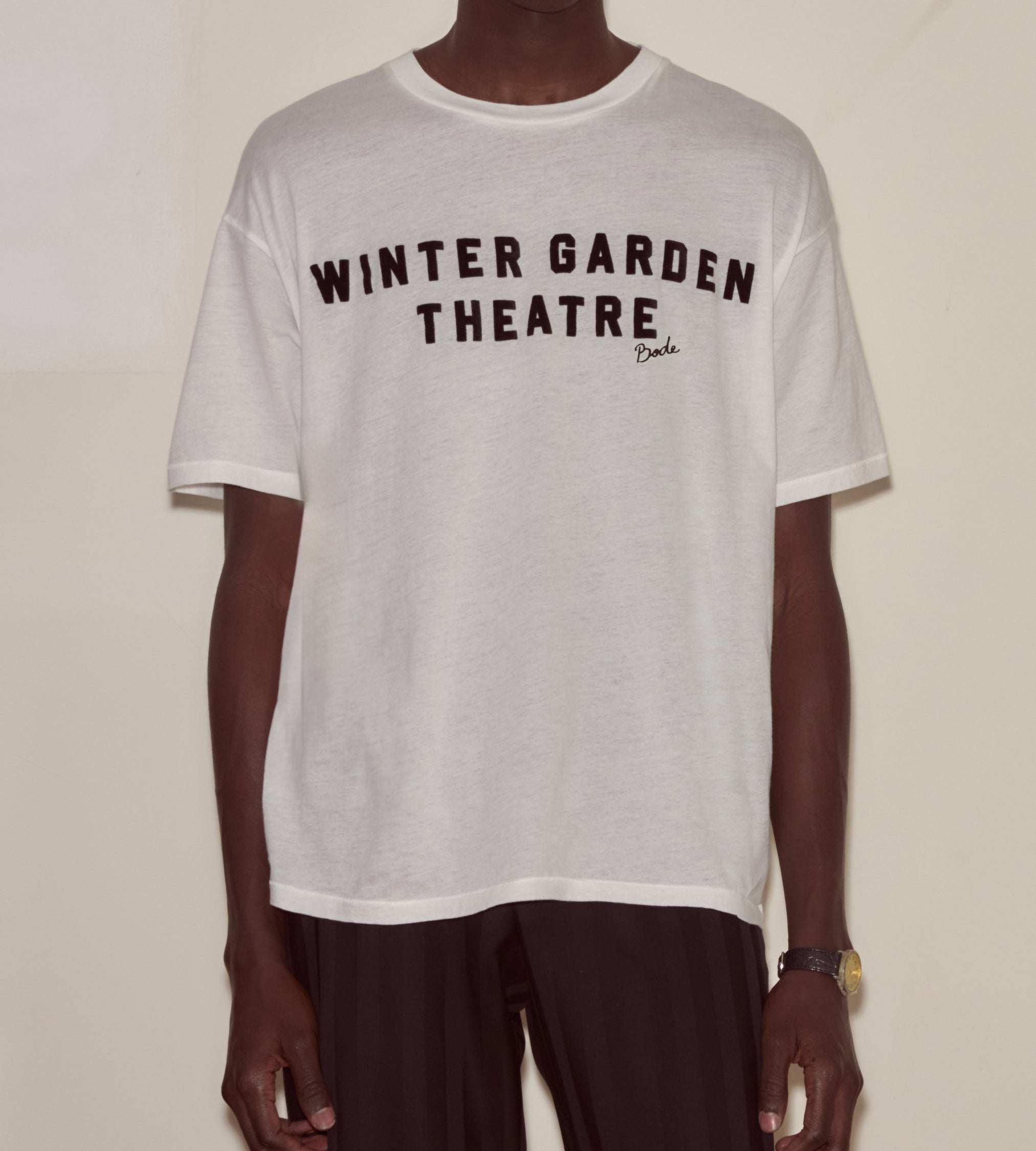 Peter Pan, with music written by Moose Charlap, opened at the Winter Garden Theatre on Broadway in 1954 after a run in Los Angeles. This boxy tee features the theatre’s name with a small, hand-embroidered “Bode.”