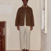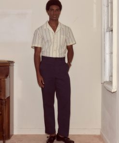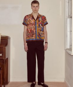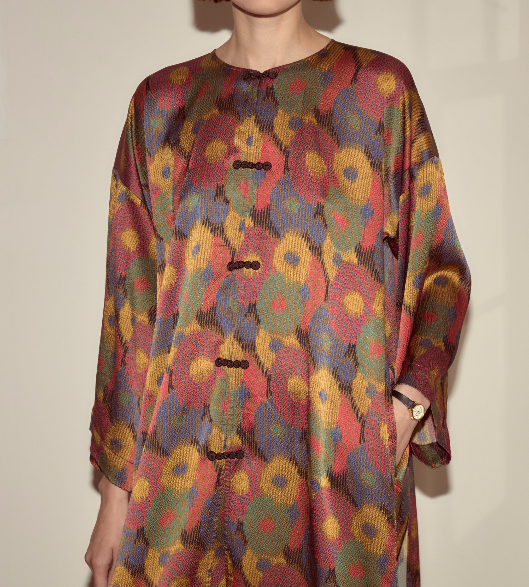 This kaftan is cut from silk seersucker, a distinctive fabric recreated from a French swatchbook, c.1930s. It closes with a series of black frog closures.