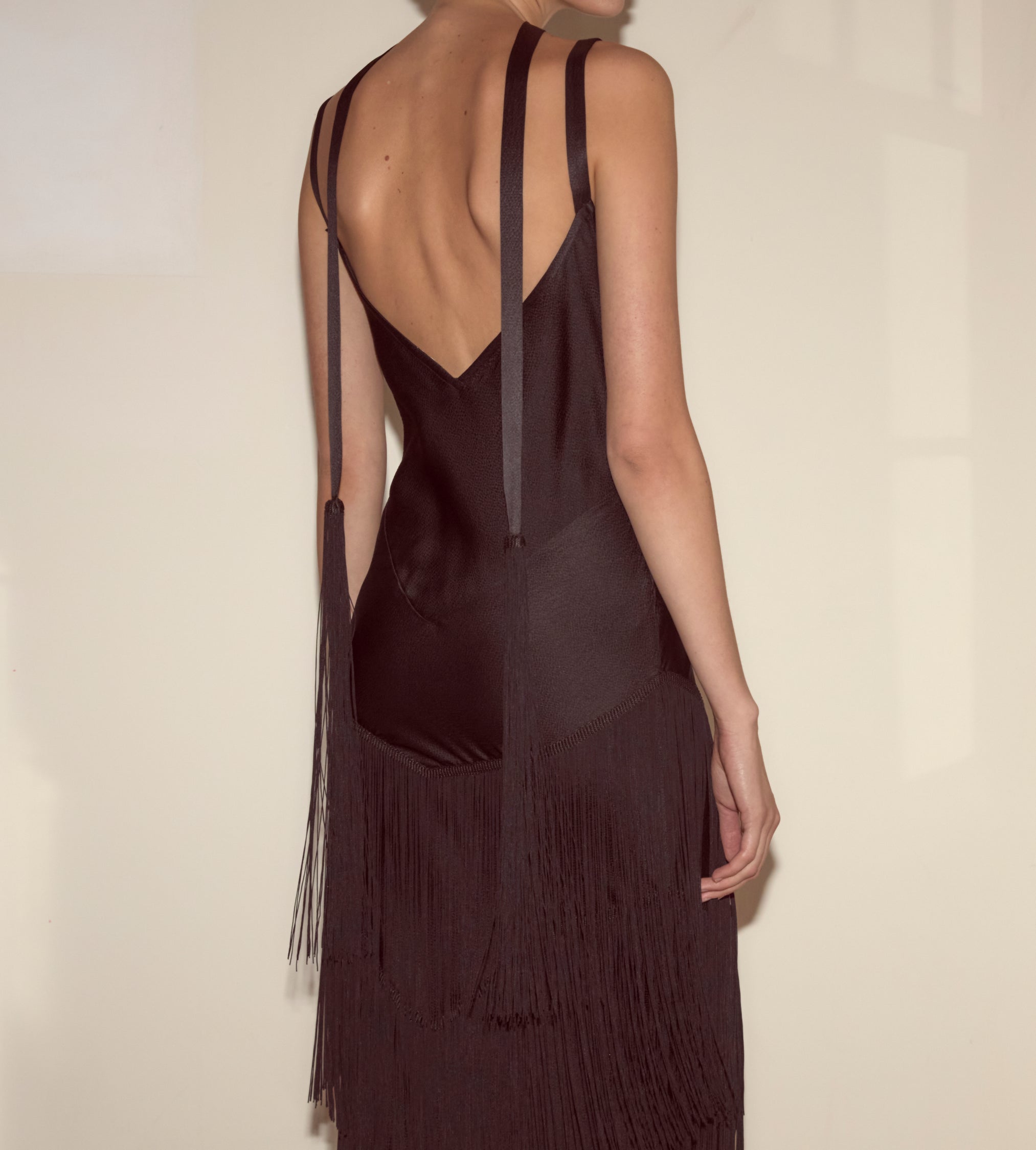 This evening gown is cut on the bias and trimmed with panels of long, swinging fringe. Made from textured silk, it has an accompanying thin silk scarf, finished with tassels.