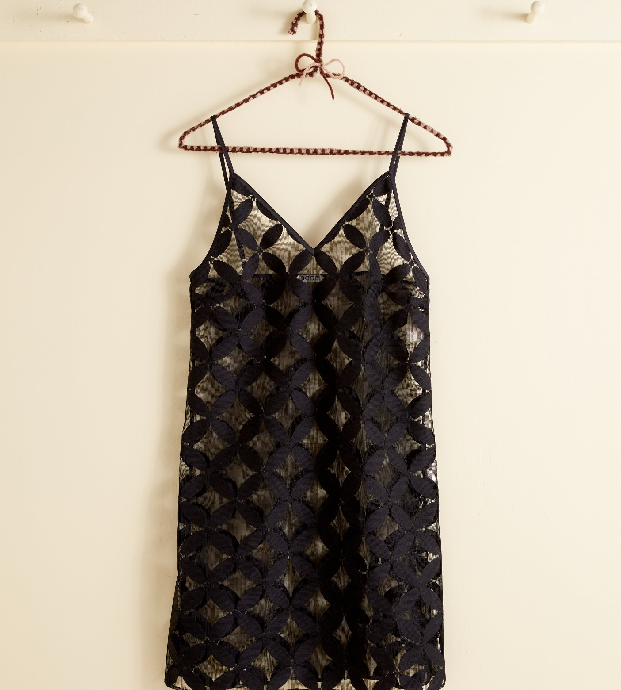 This dress is made from deadstock yardage from the late 20th century. The fabric is woven in a geometric floral pattern over a mesh ground. Hand-mending throughout.