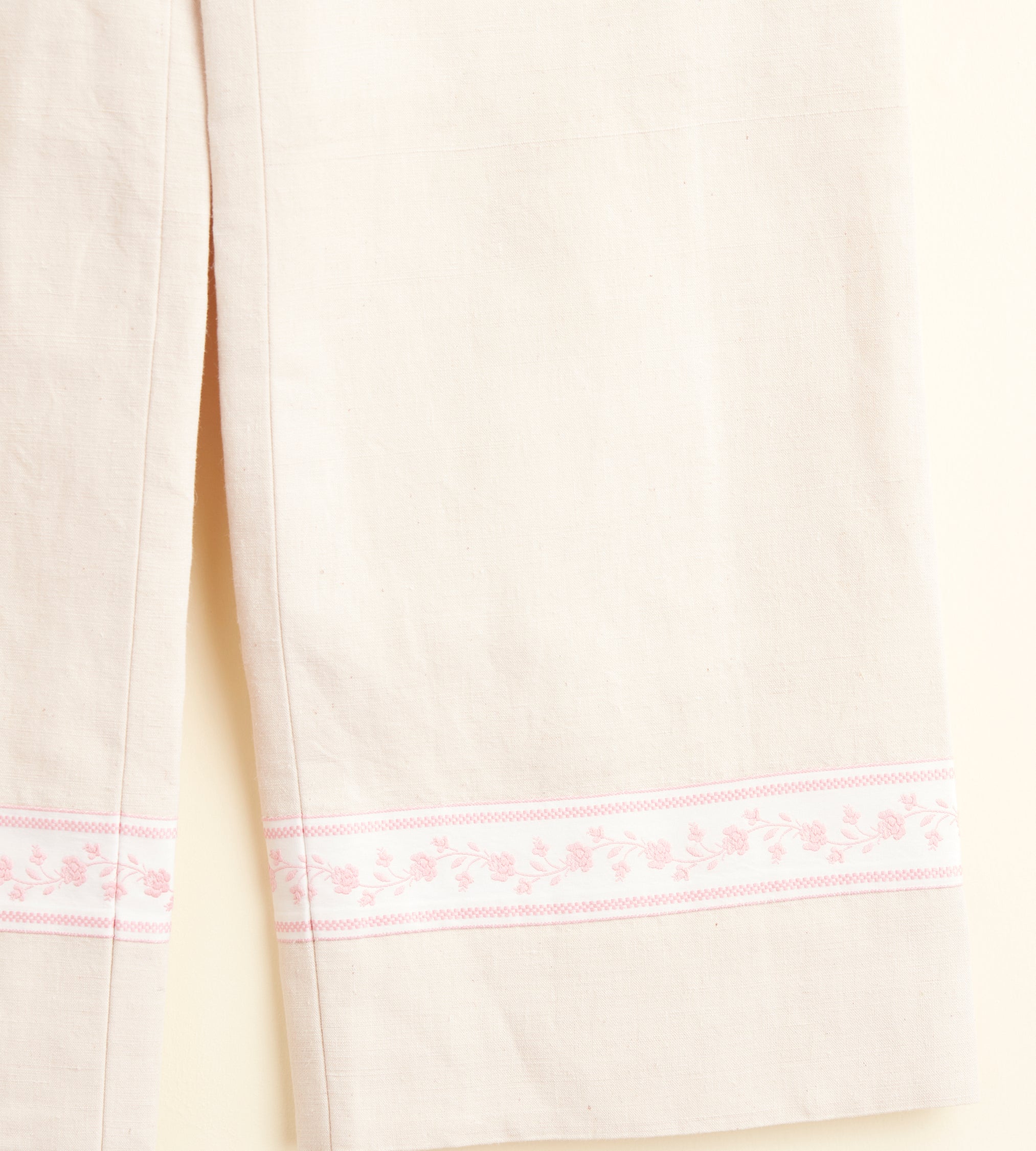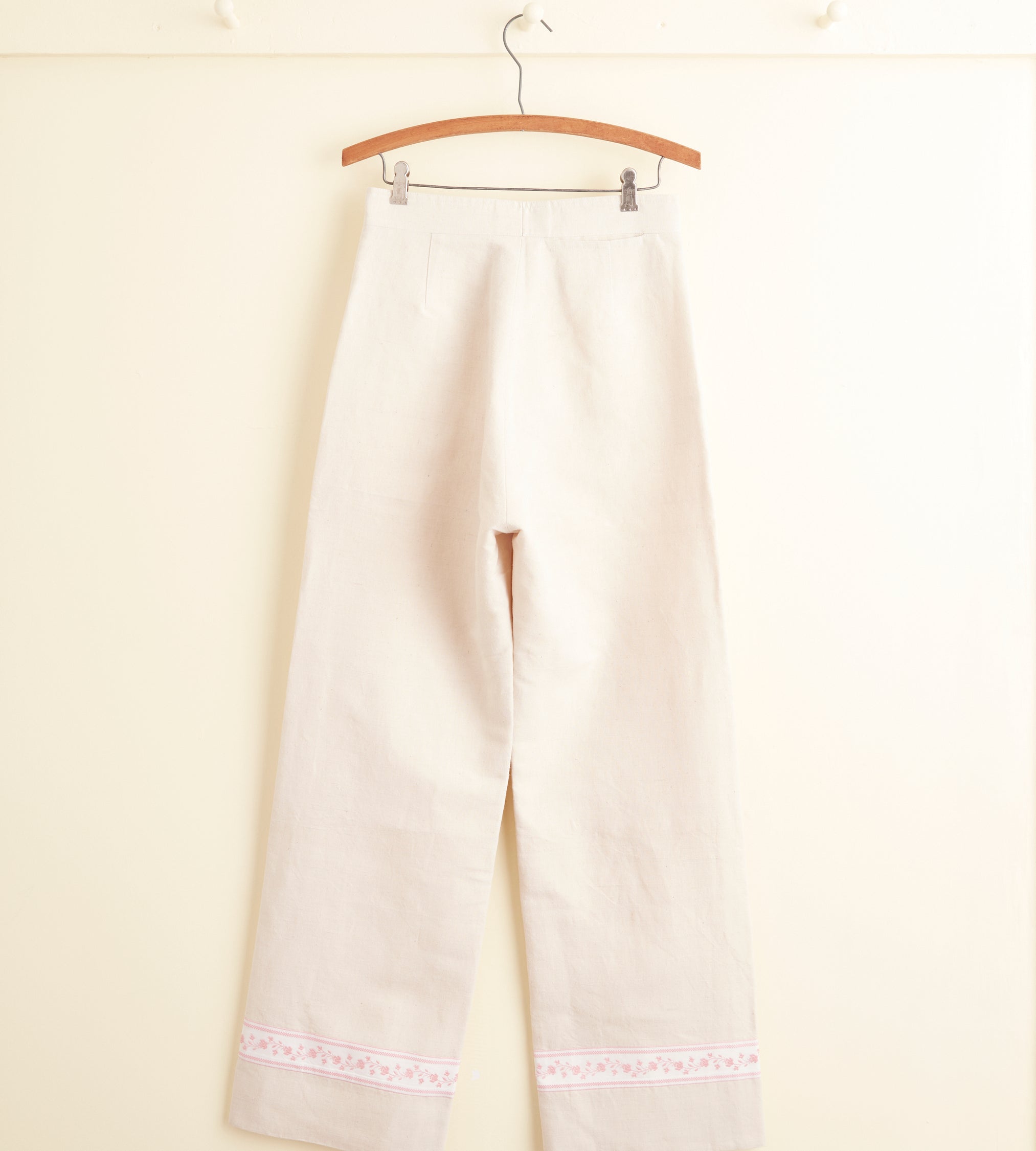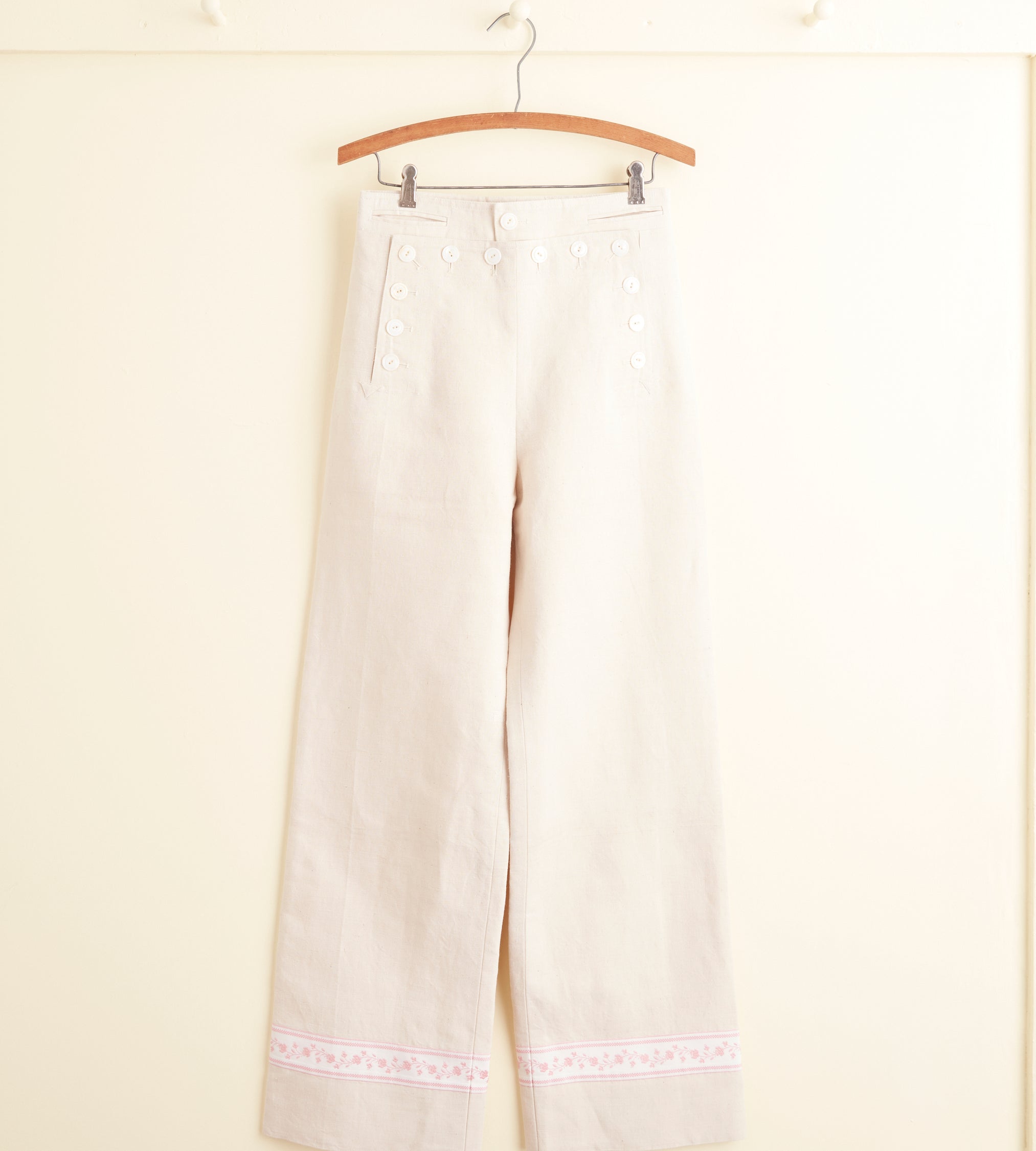 These trousers are made from antique linen, trimmed with pink and white woven trim. They are cut in a silhouette inspired by U.S. Navy pants from the 1940s and finished with pearl buttons sourced from a now-defunct button factory in Iowa. Hand-mending throughout.