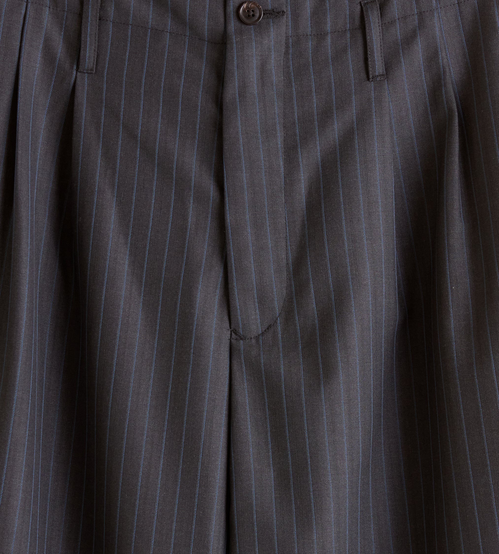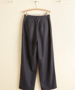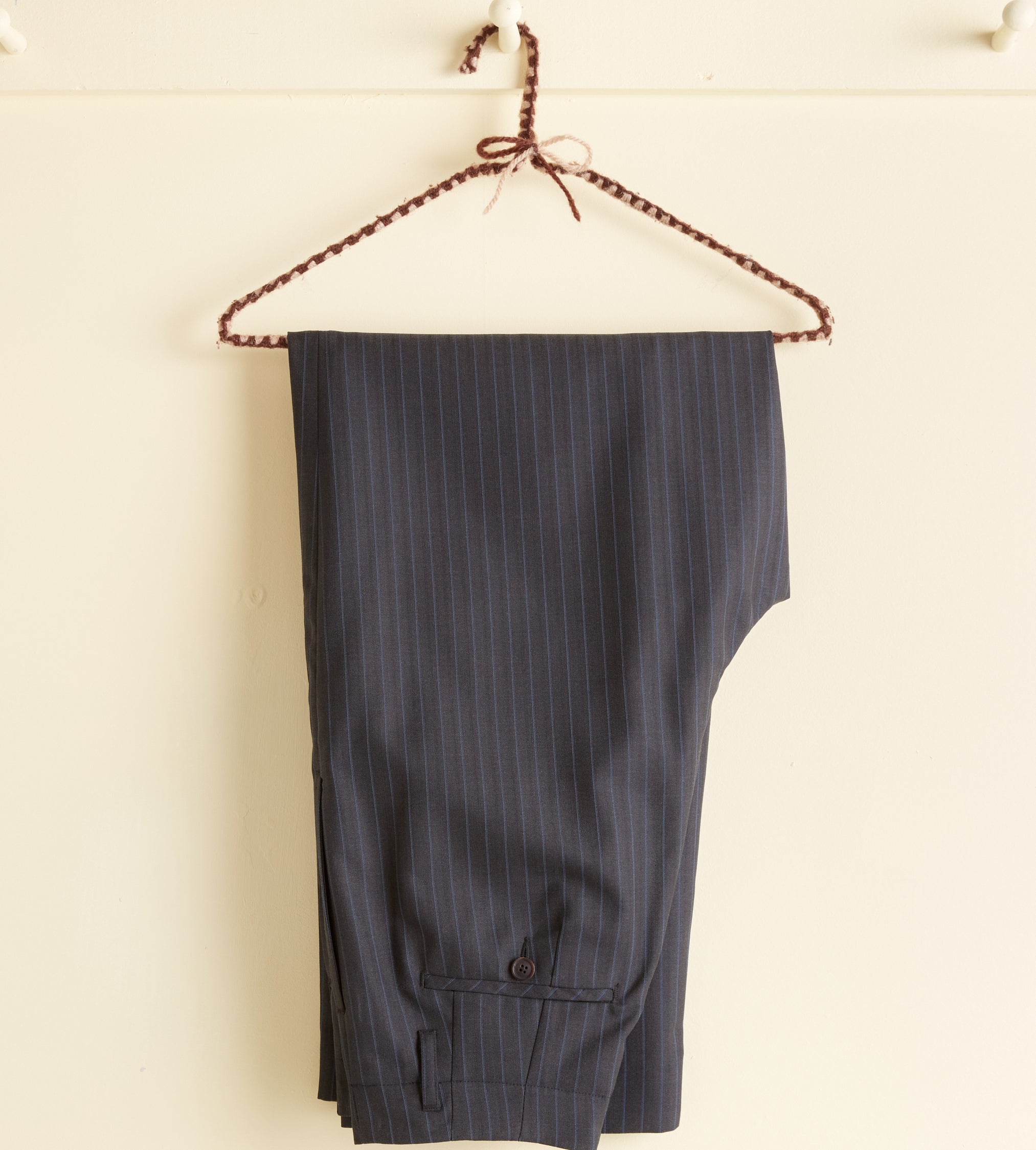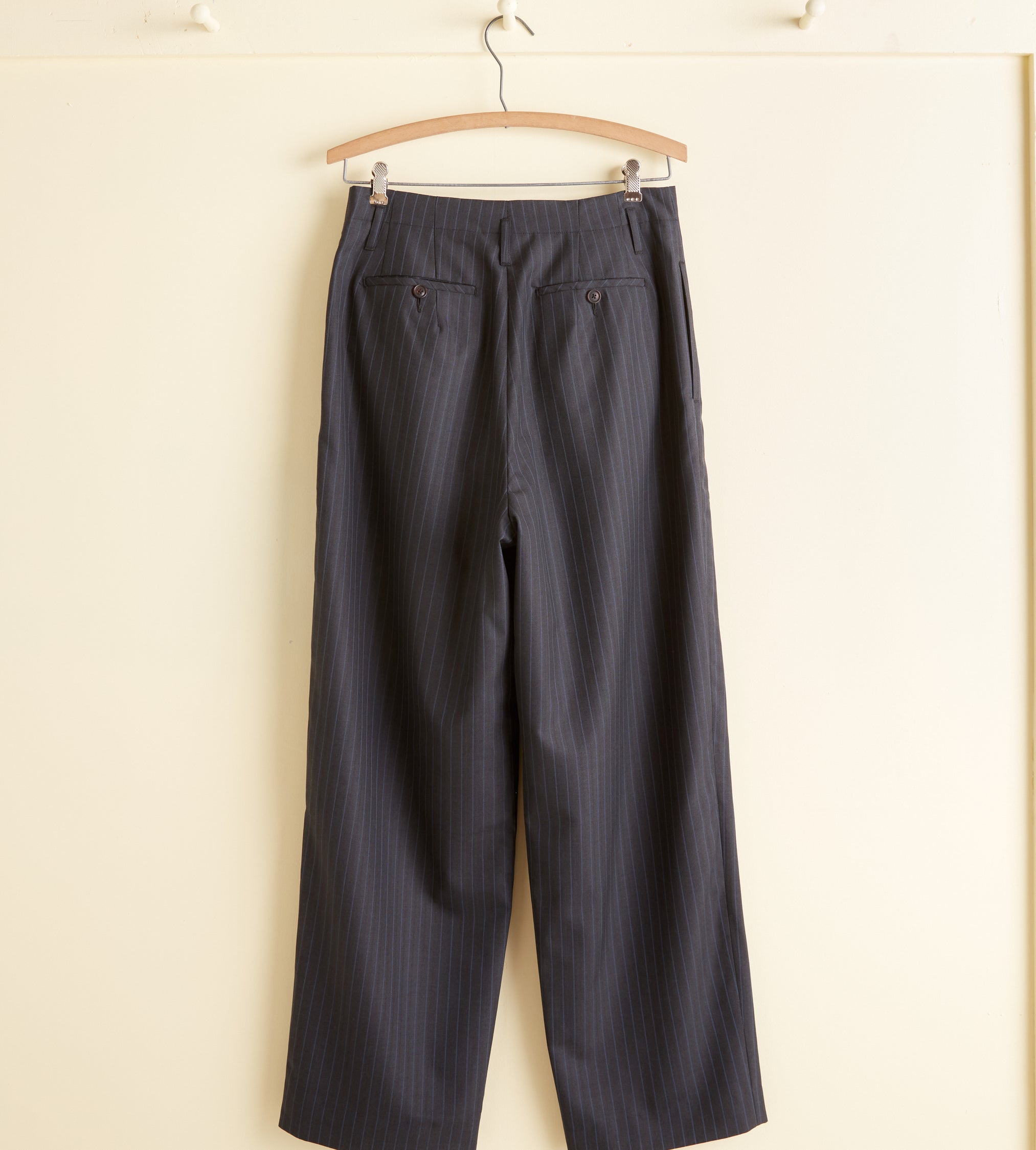 These trousers are made of deadstock wool from the late 20th century, likely intended for suiting. The fabric is navy with blue pinstripes, and the trousers have a mid-rise and a wide leg. Hand-mending throughout.