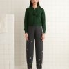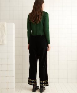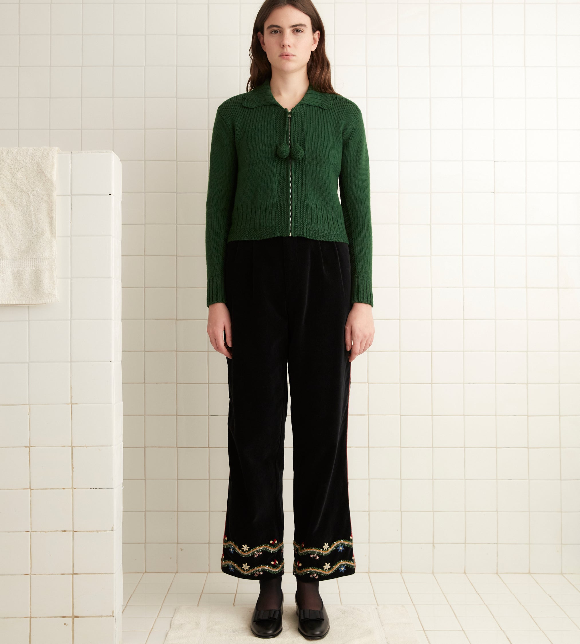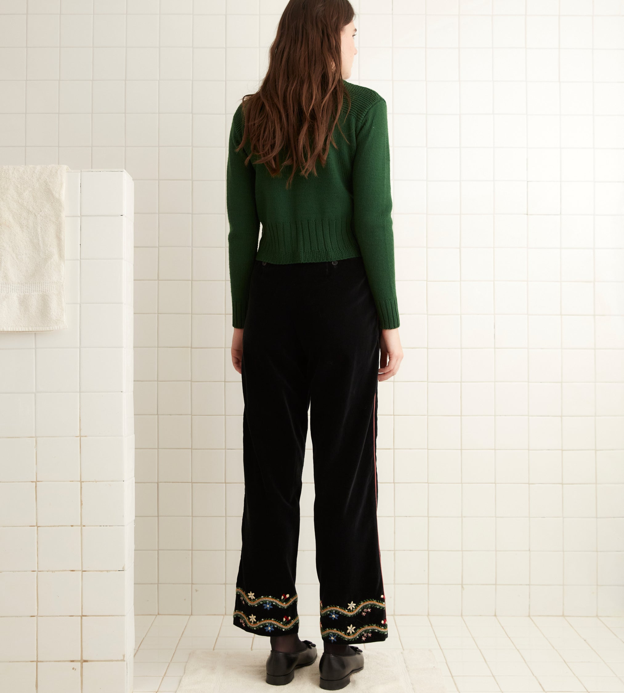 These trousers are inspired by an Austrian straw hat, circa 1930s. The hat brim was embroidered with this twining wildflower-and-vine pattern, which we have reproduced along the hem of these trousers. The embroidery is worked by hand in colorful yarn and metallic bullion braid, with silver sequins studded throughout.