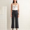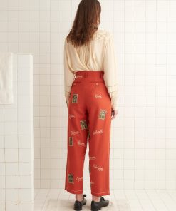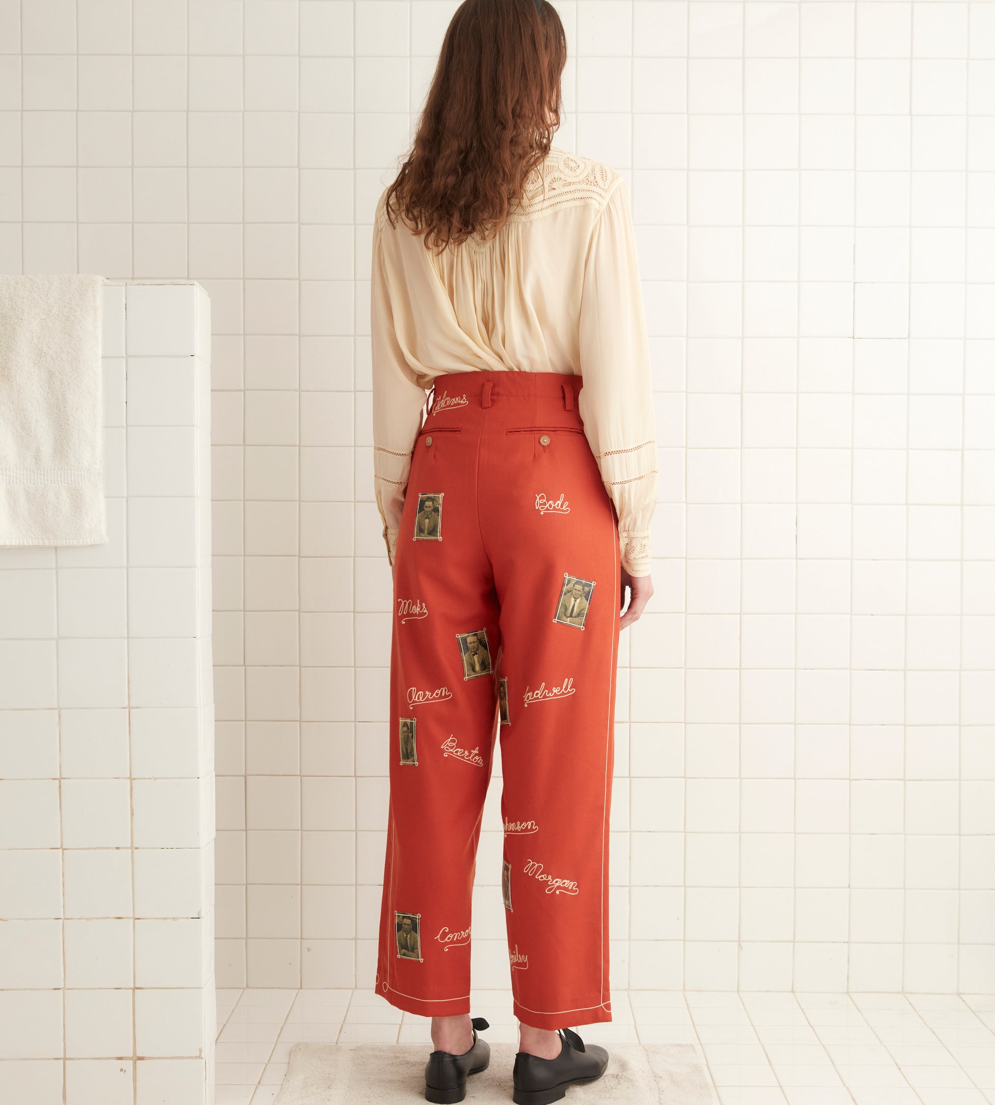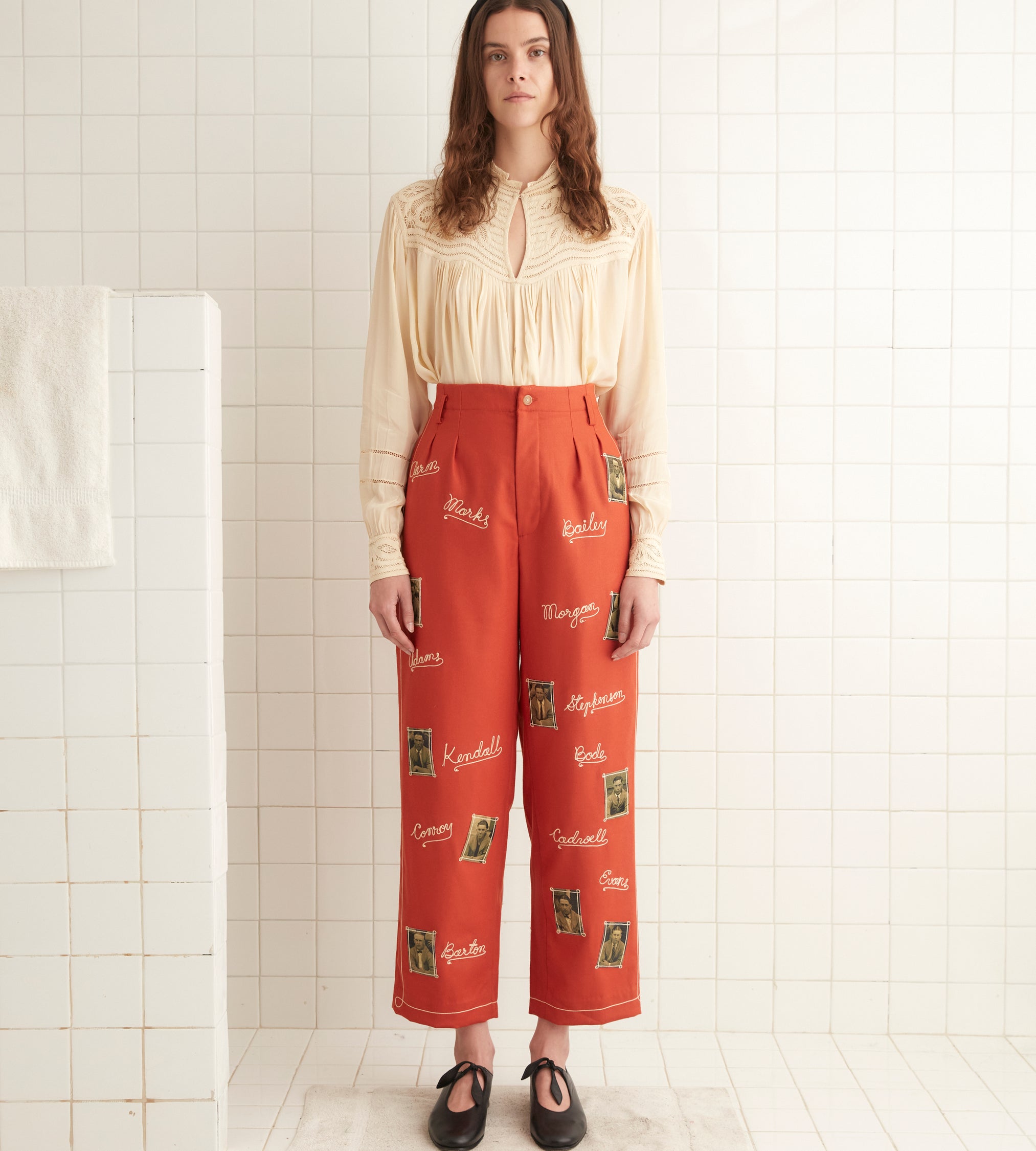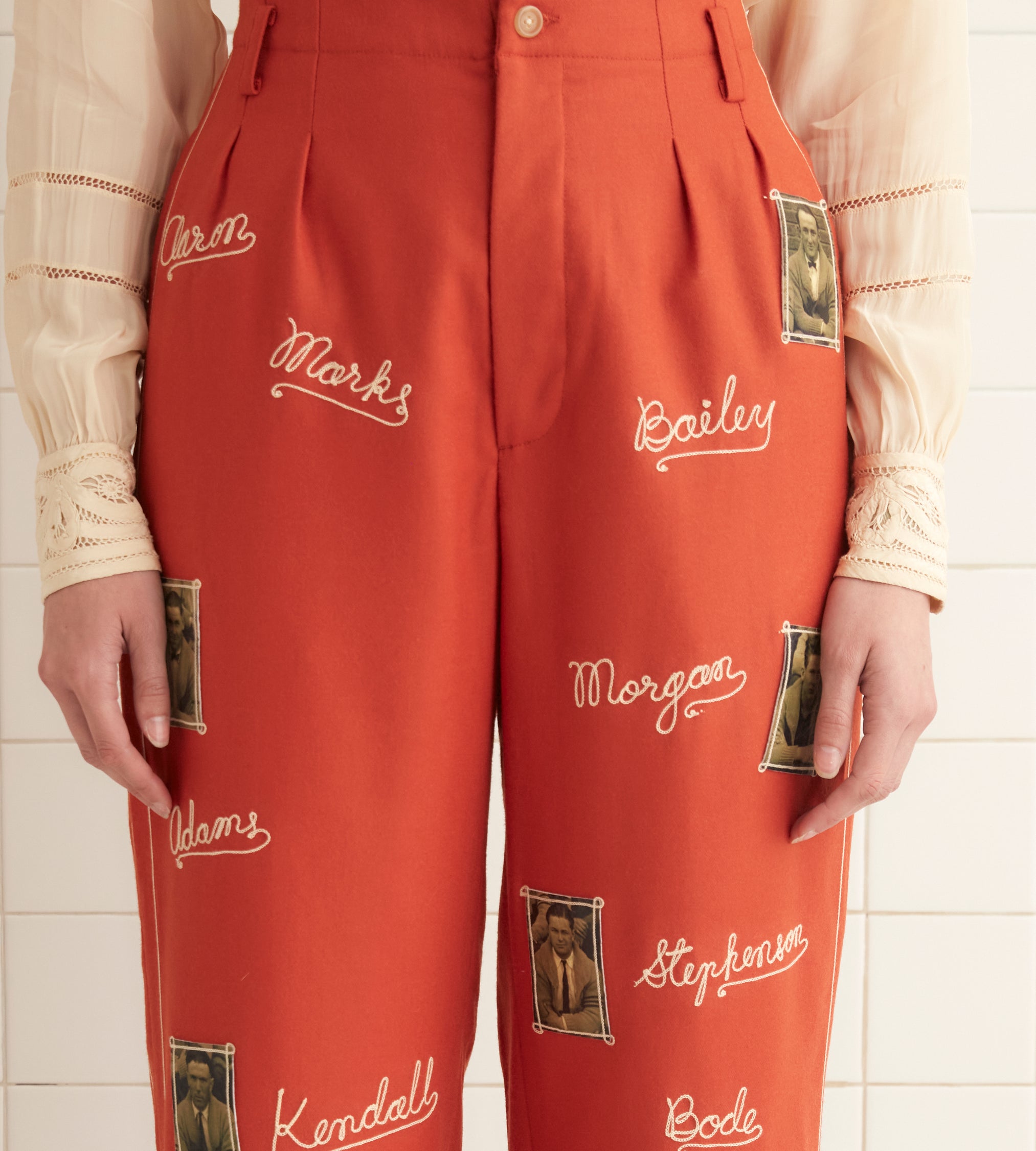 These trousers are inspired by a child’s pennant from the midcentury. We reproduced the scarlet wool and chain-stitched names for this style, which uses pictures from a team photo in a 1920s yearbook. The trousers have a mid-rise and a wide leg.