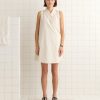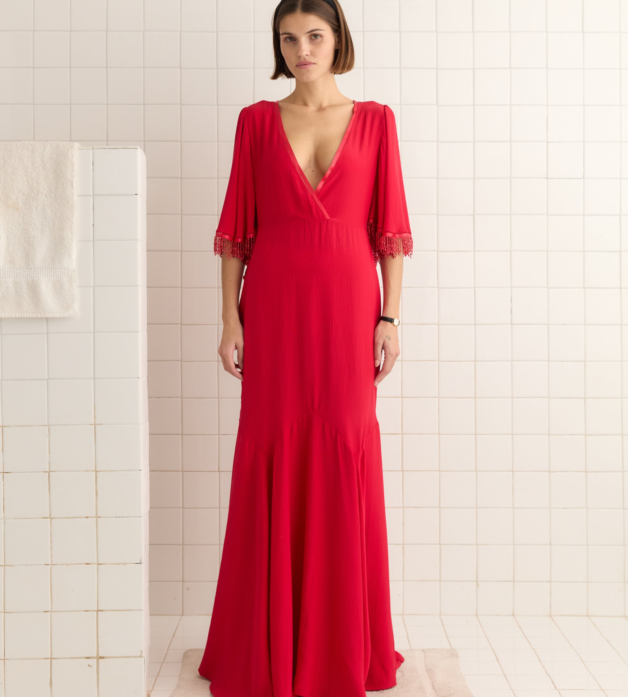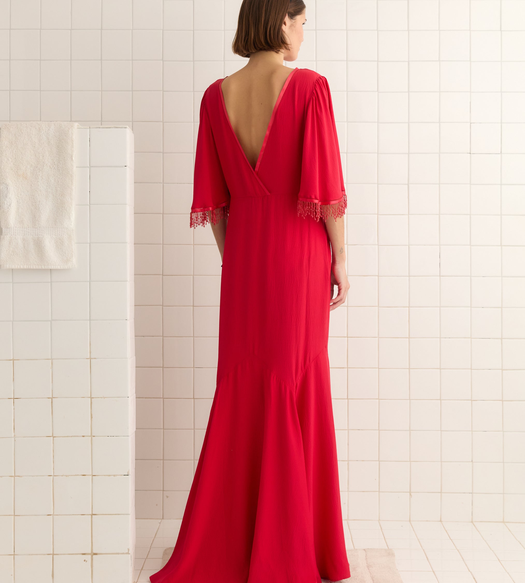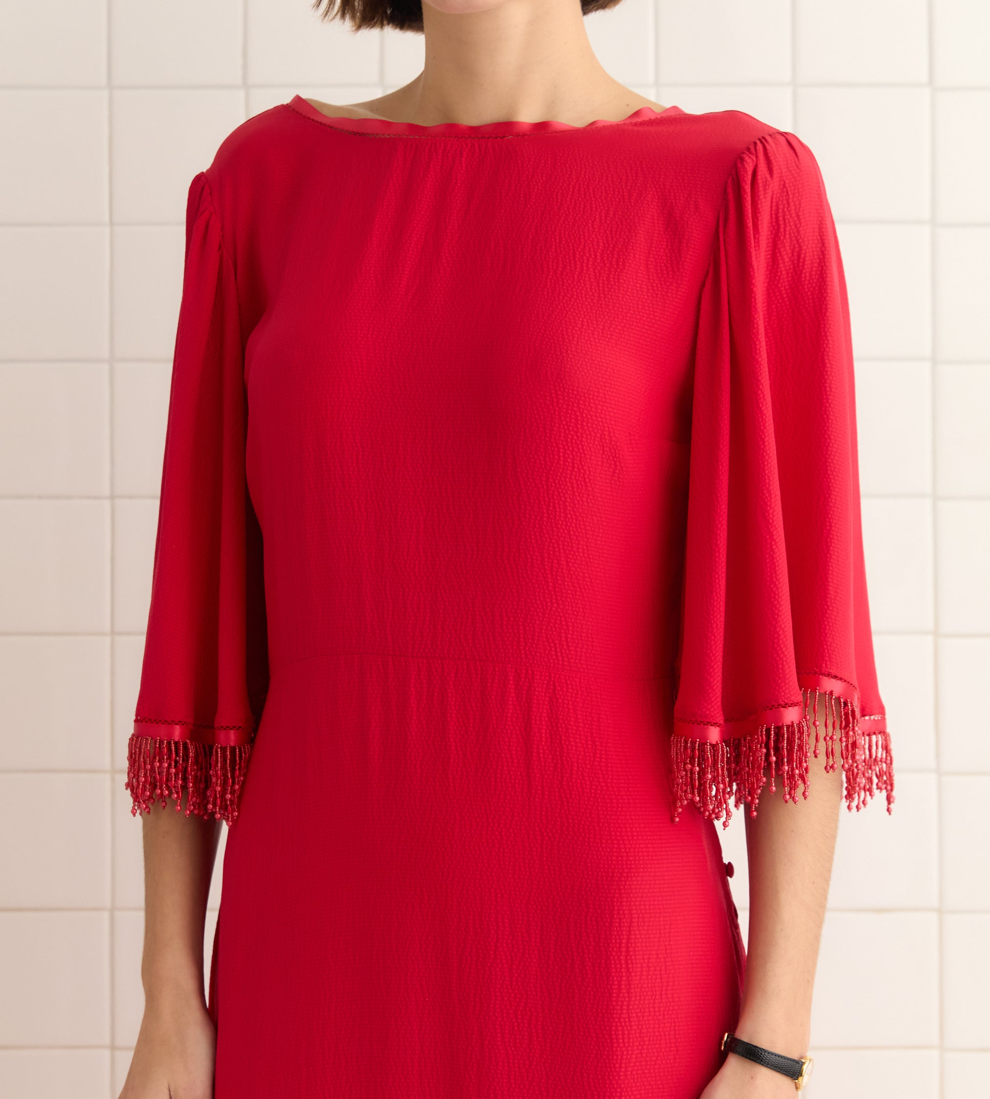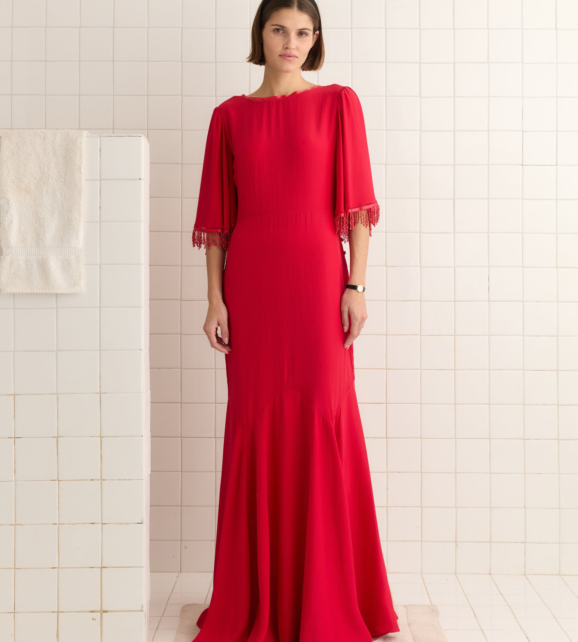 This dress is inspired by an afternoon dress from the 1930s with a distinctive godet skirt. We reproduced the silhouette in textured crepe with ribbonwork and beading around the collar and sleeves.