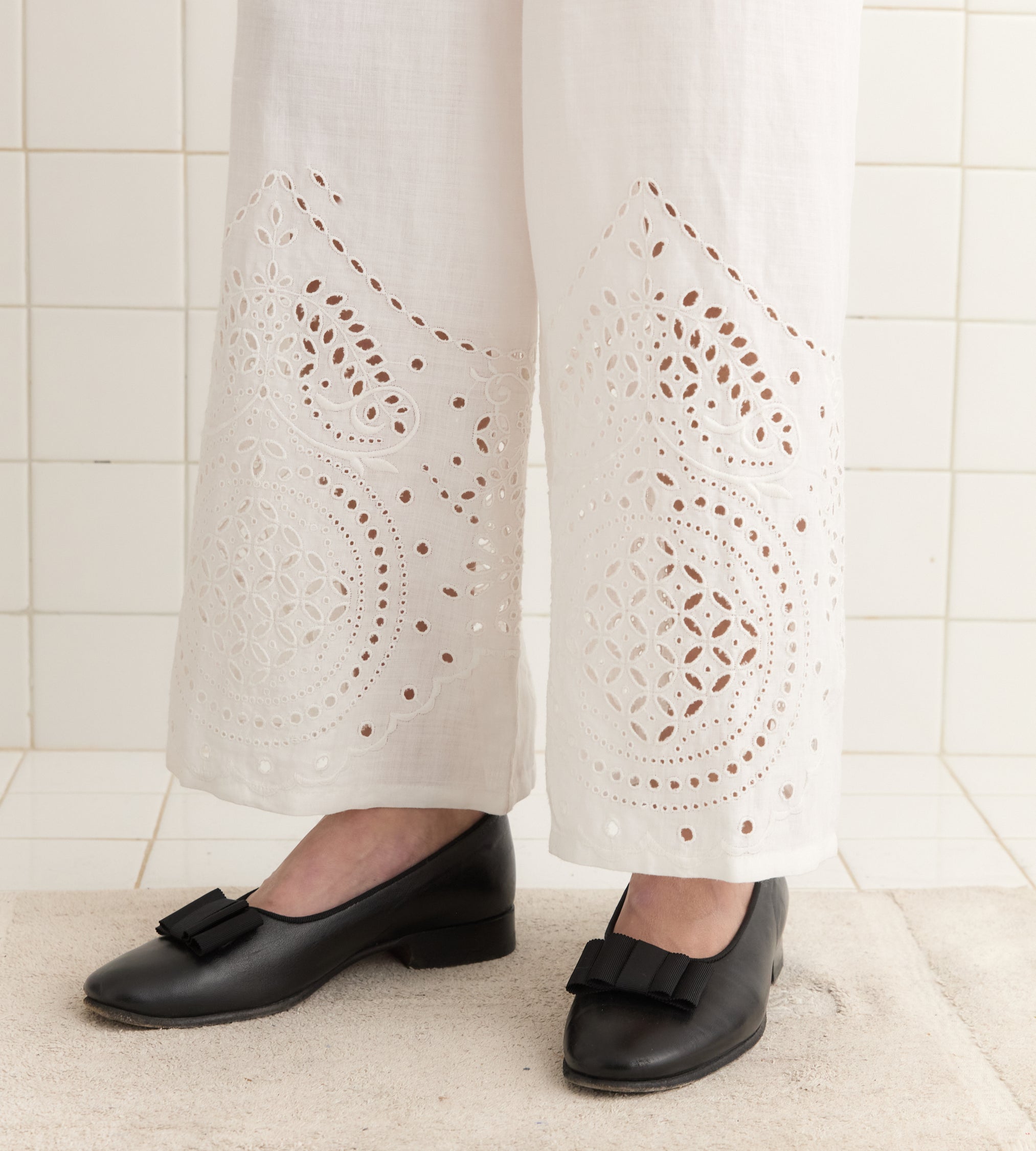 This pants are inspired by a bed jacket from the 1890s. We reproduced the broderie anglaise lacework for this style, which is made of lightweight linen.
