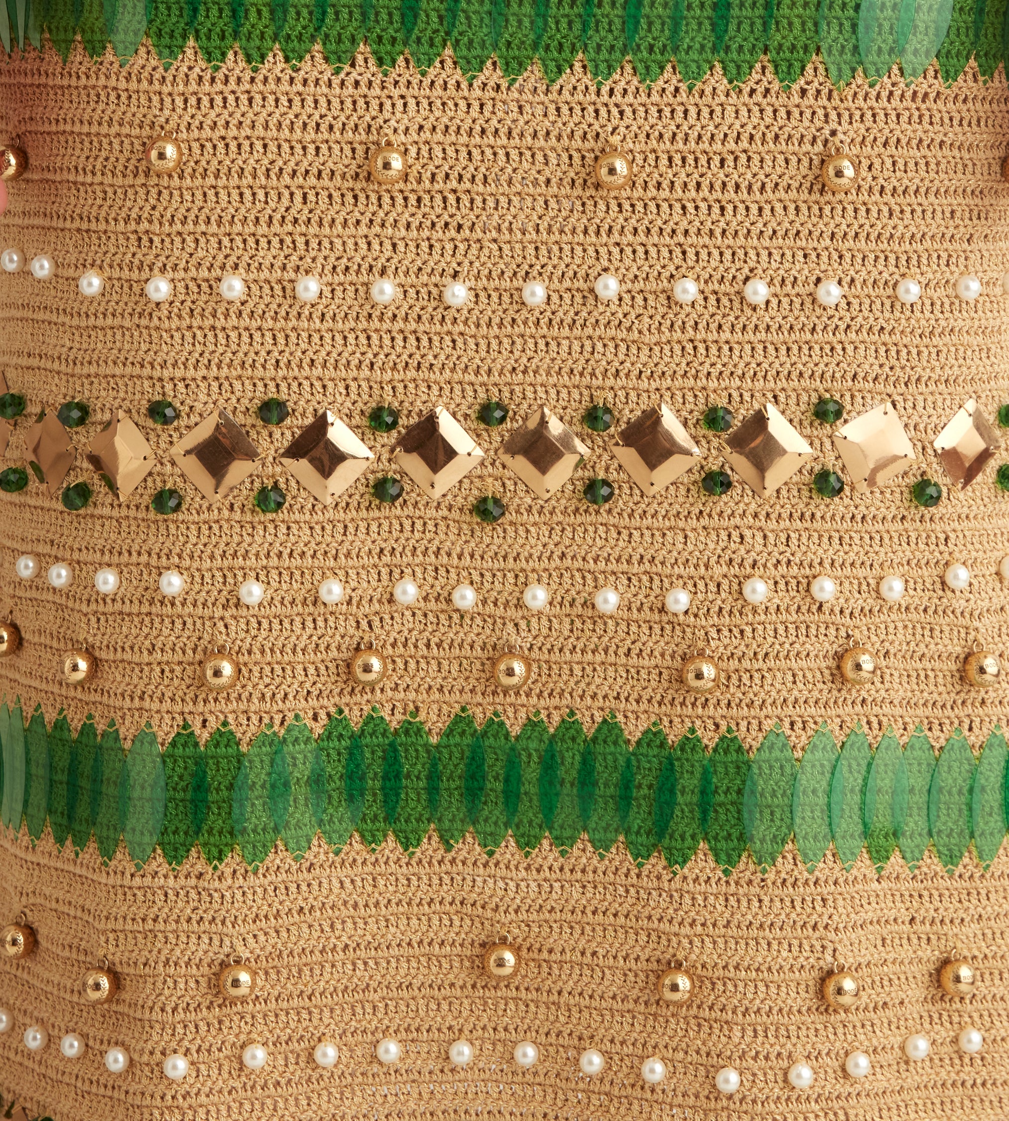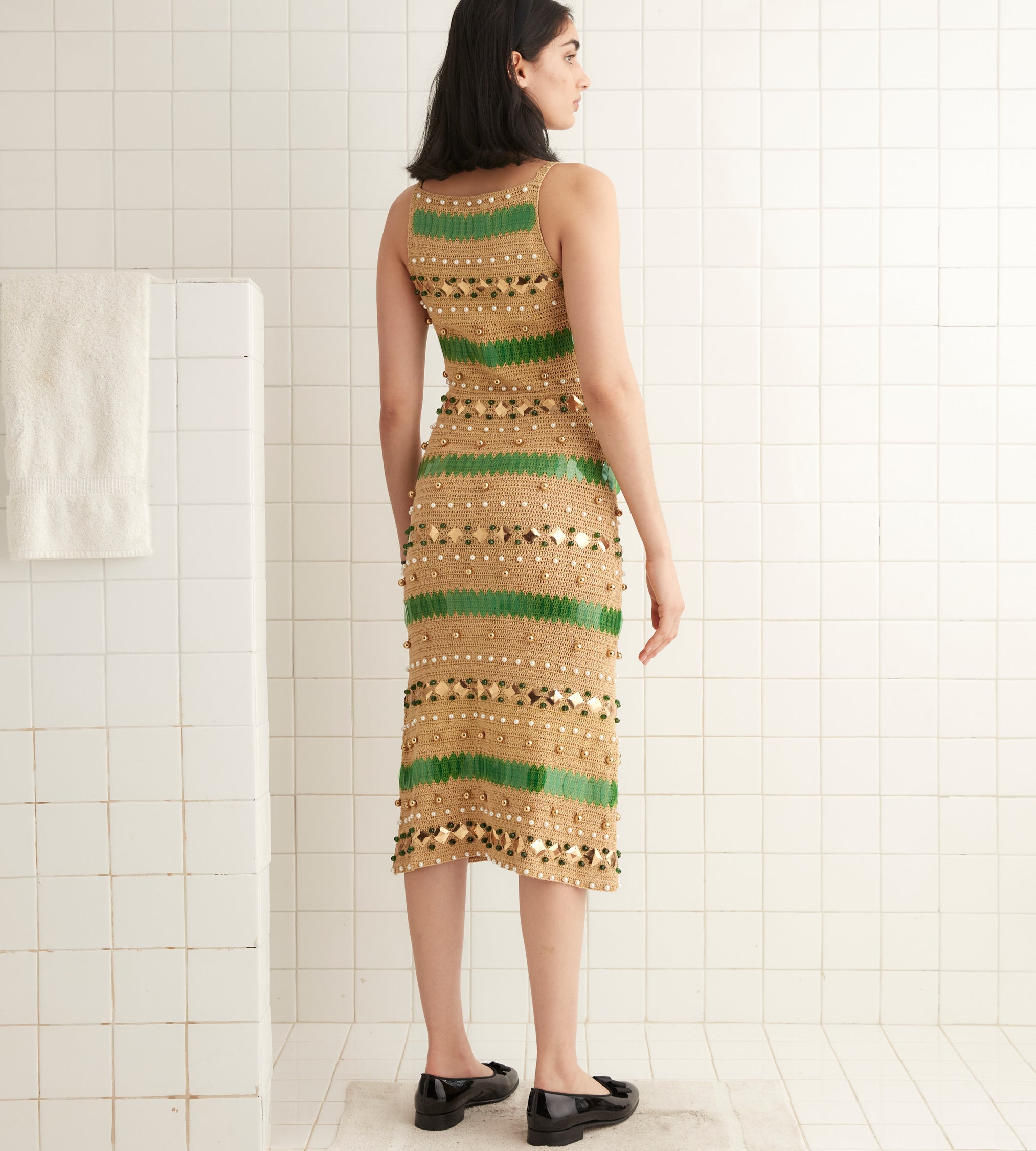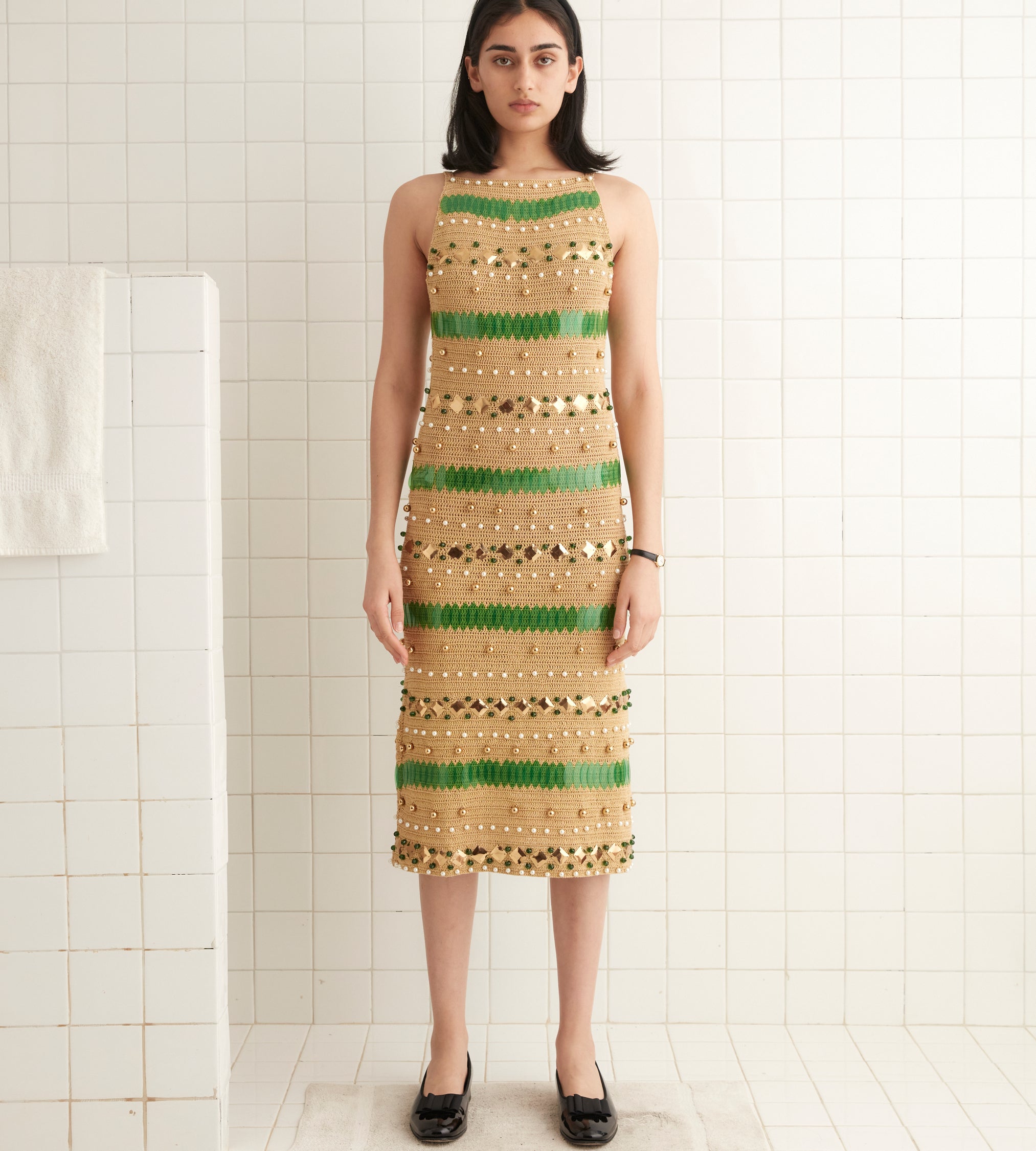 This dress is inspired by a beaded vest from the 1960s. We reproduced the lamé fabric and rows of beaded and sequined stripes—all applied by hand—for this dress, which has a straight, column silhouette. Some of the stripes are made from brass baseball charms, developed for this season.
