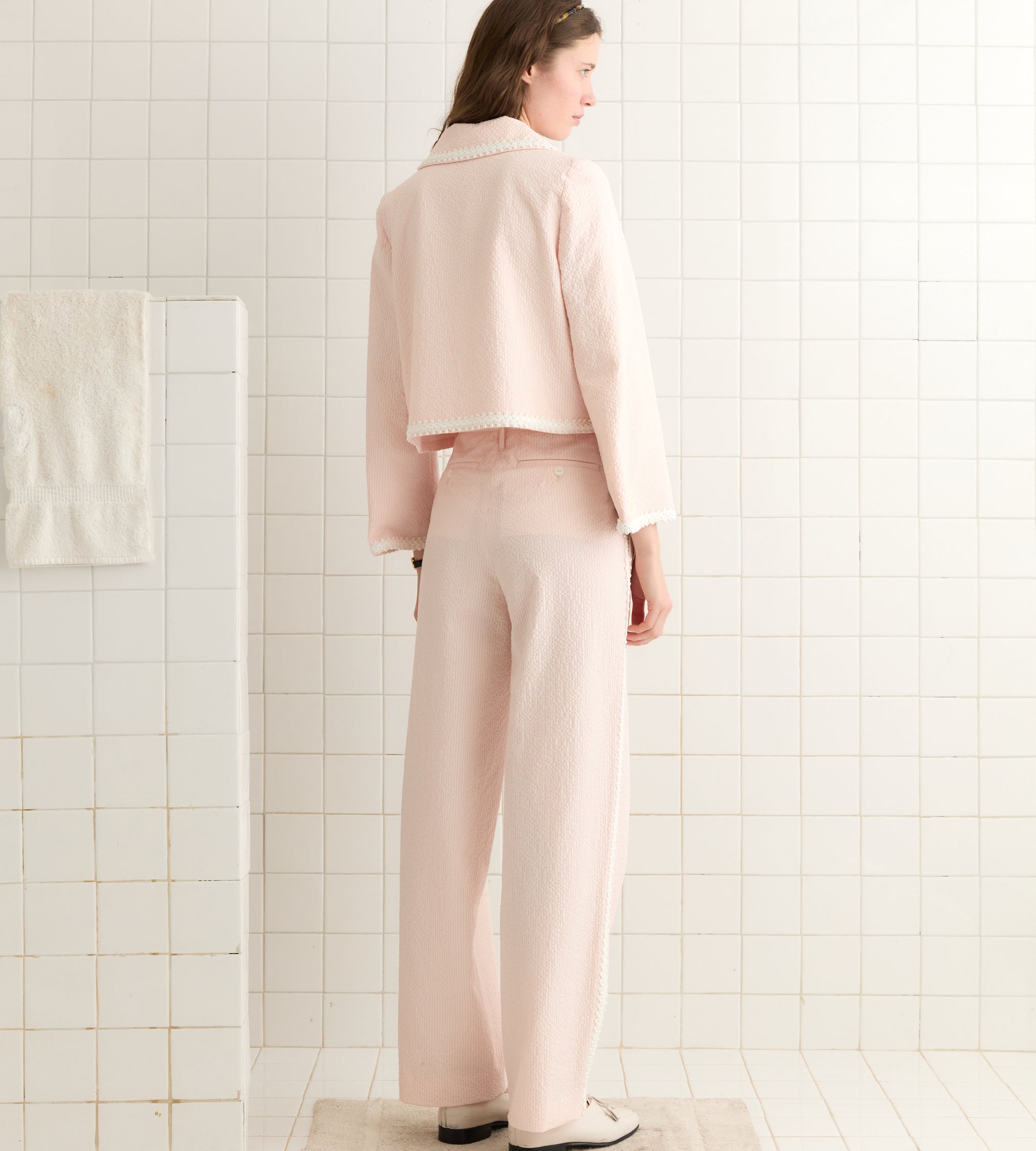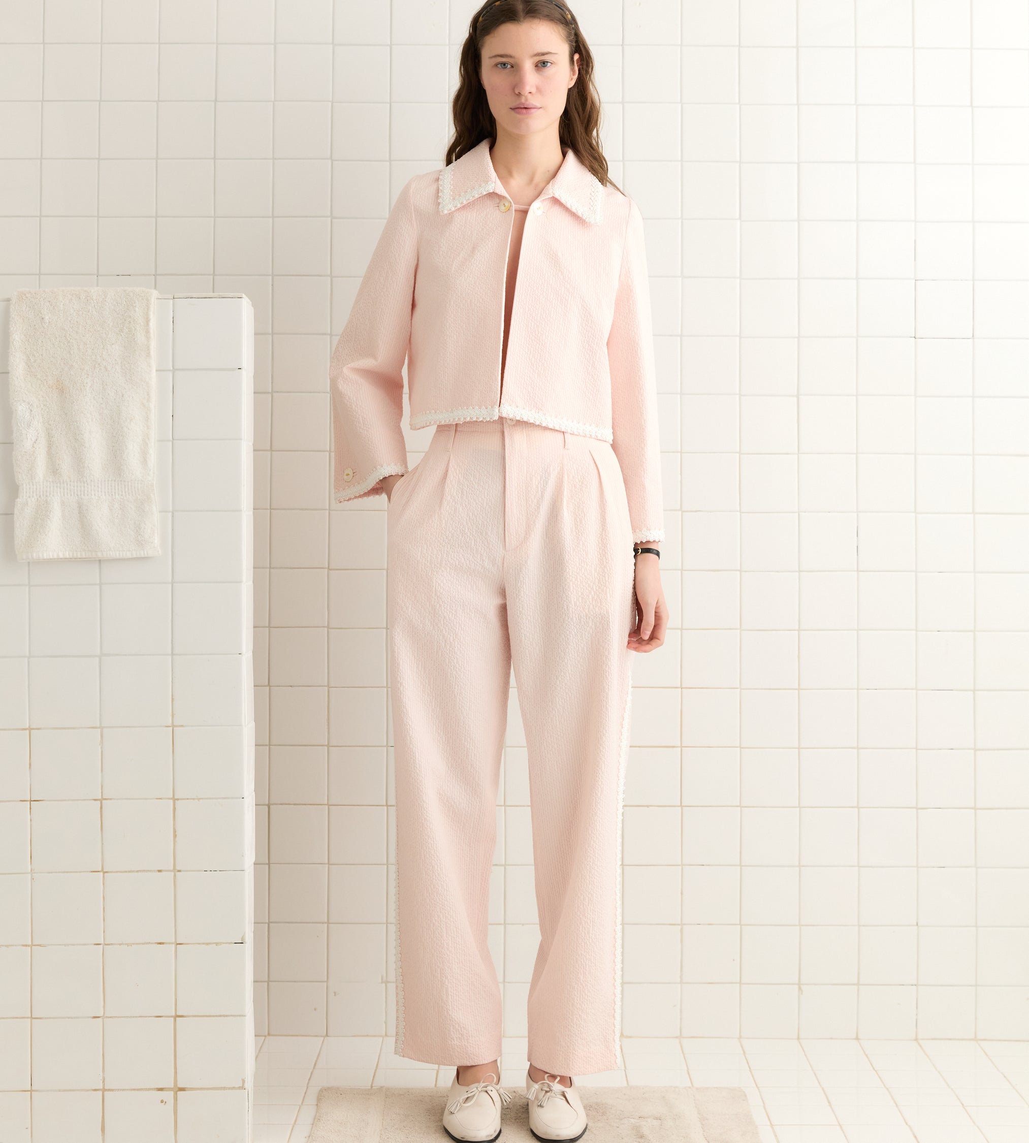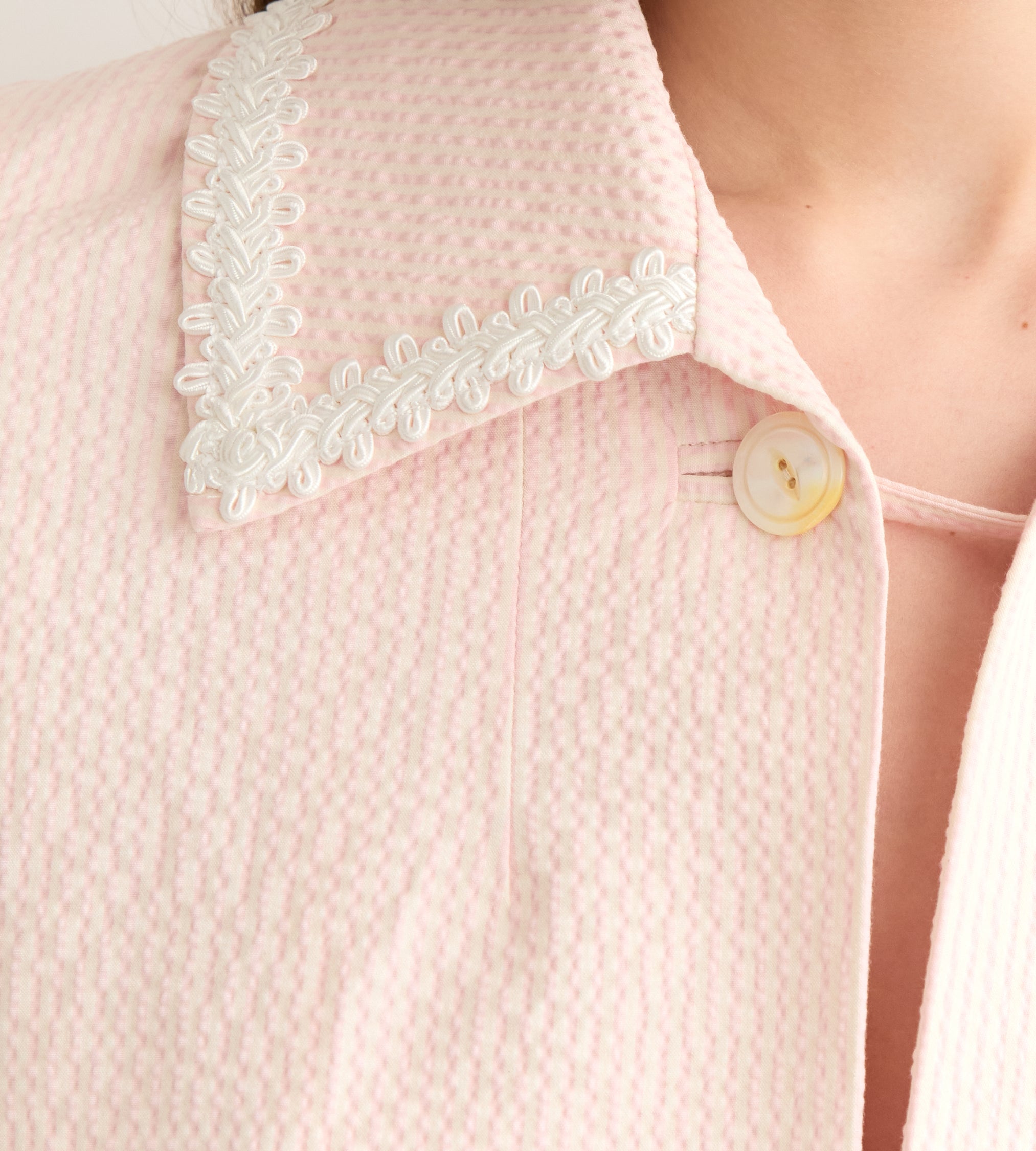 This piece is inspired by a jacket made by a 19th-century Brooklyn department store. We reproduced the silhouette, with its distinctive front button detail, in pink seersucker. The jacket is trimmed with antique pearl buttons sourced from a now-defunct button factory in Iowa.