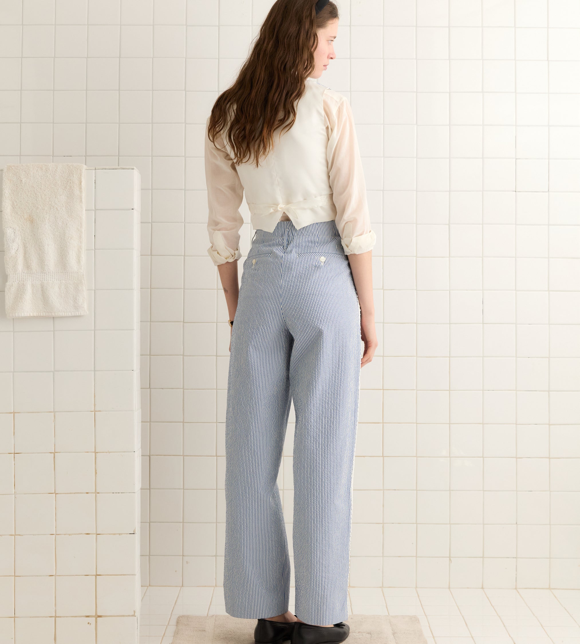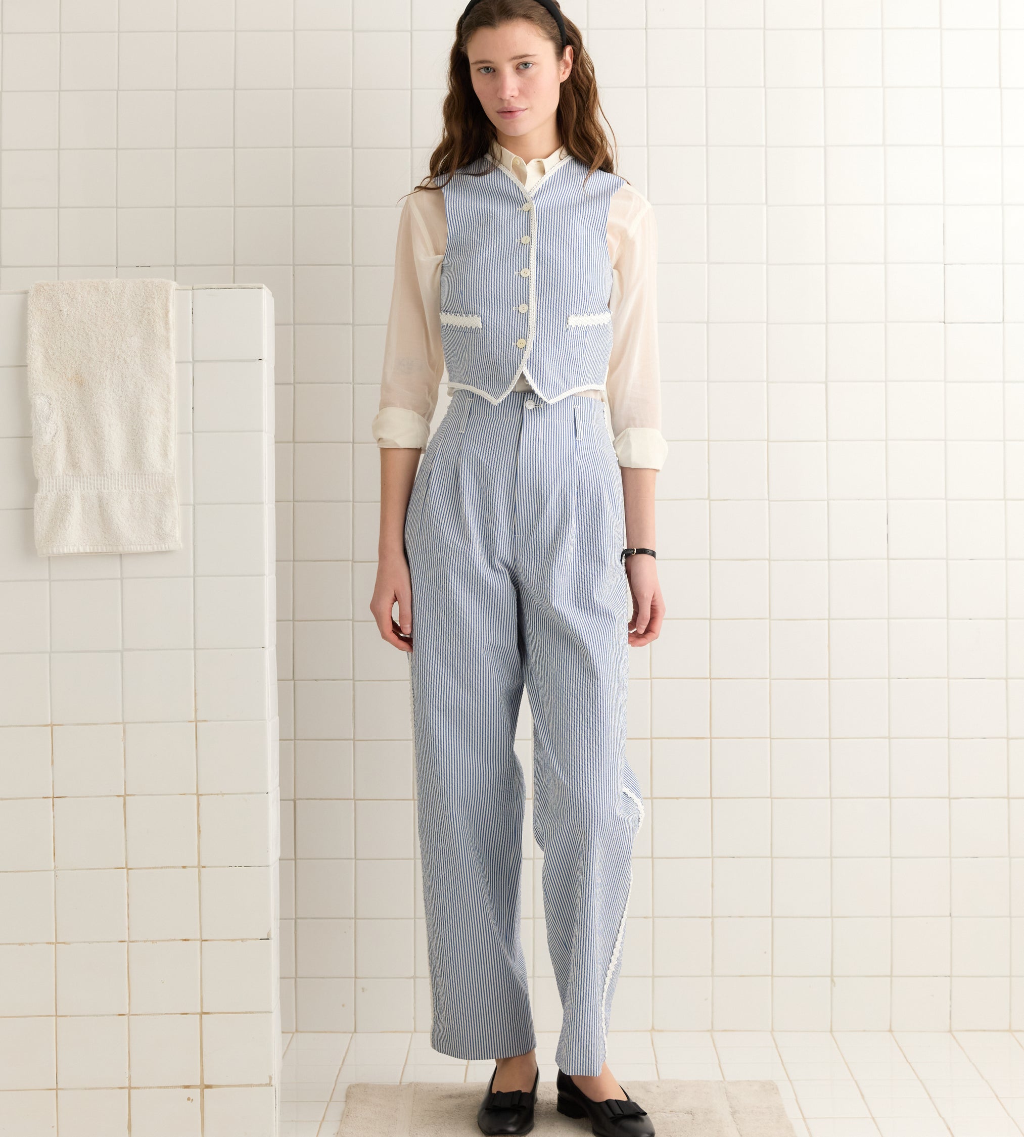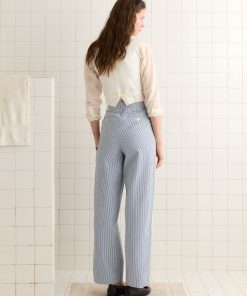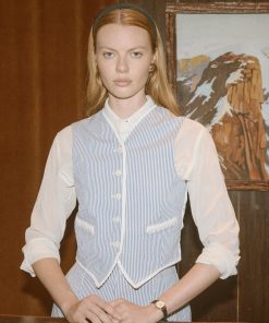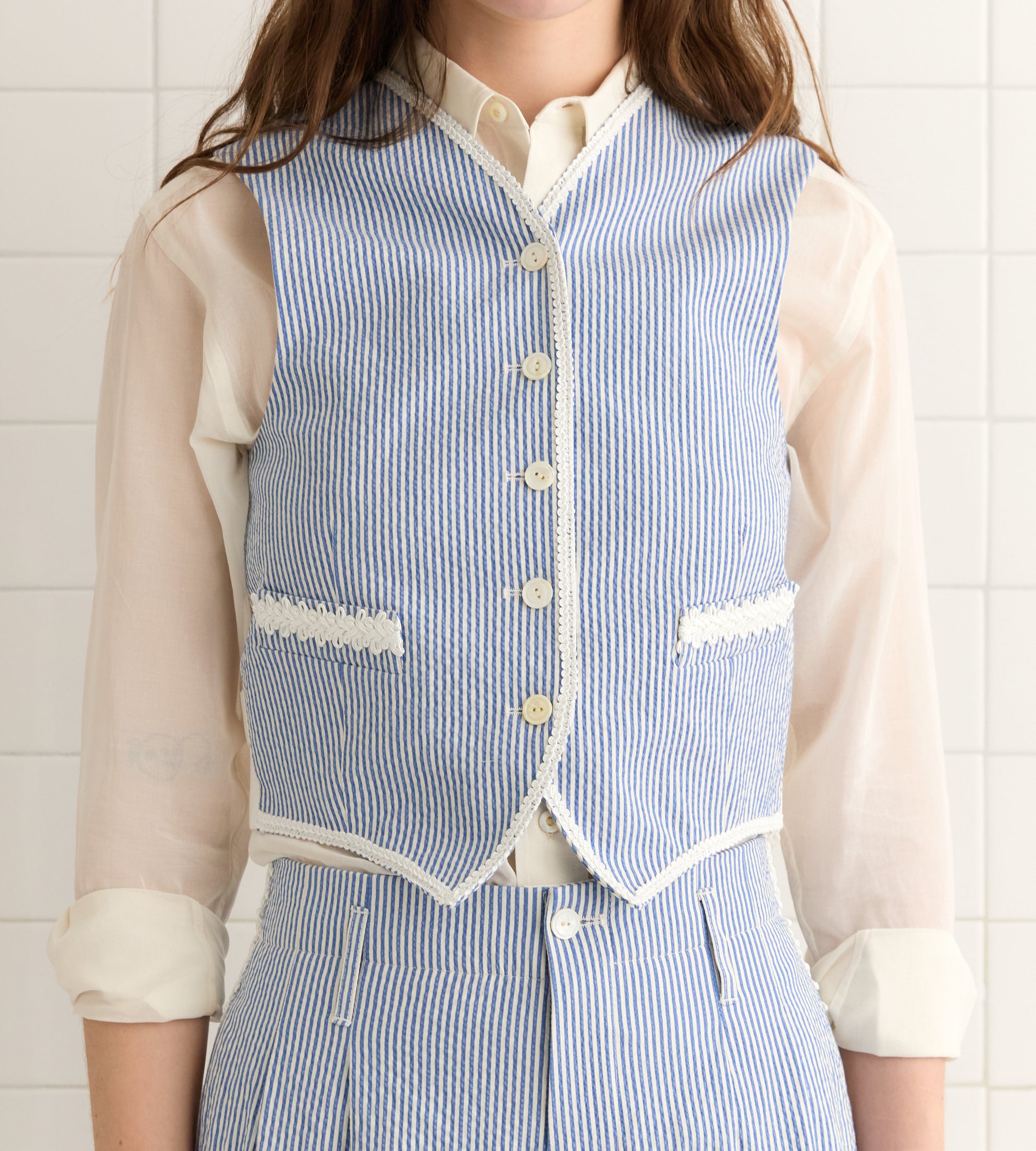 This piece is inspired by a waistcoat from the 1940s-1950s. We reproduced the silhouette in lightweight seersucker. The waistcoat is finished with ornamental braided trim and has an adjustable tie at the back.