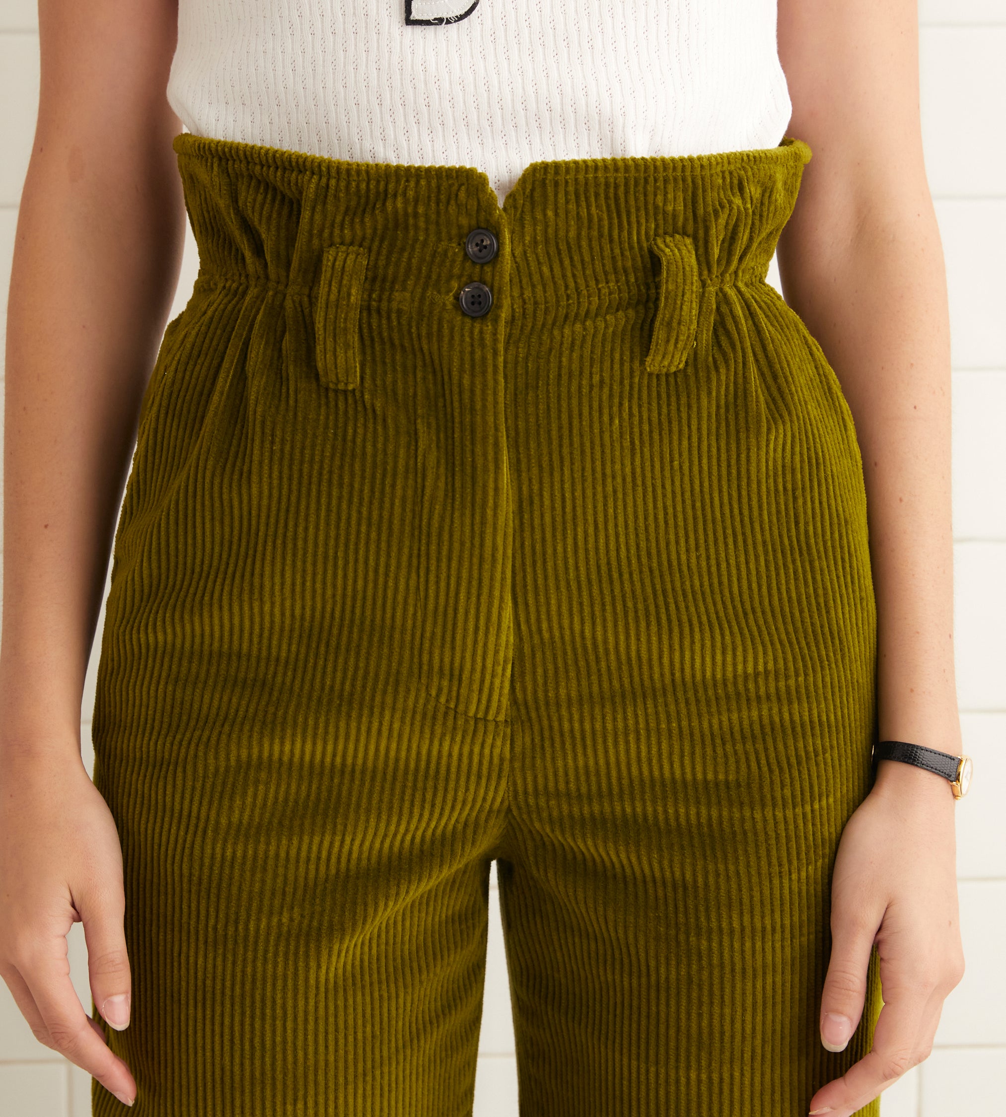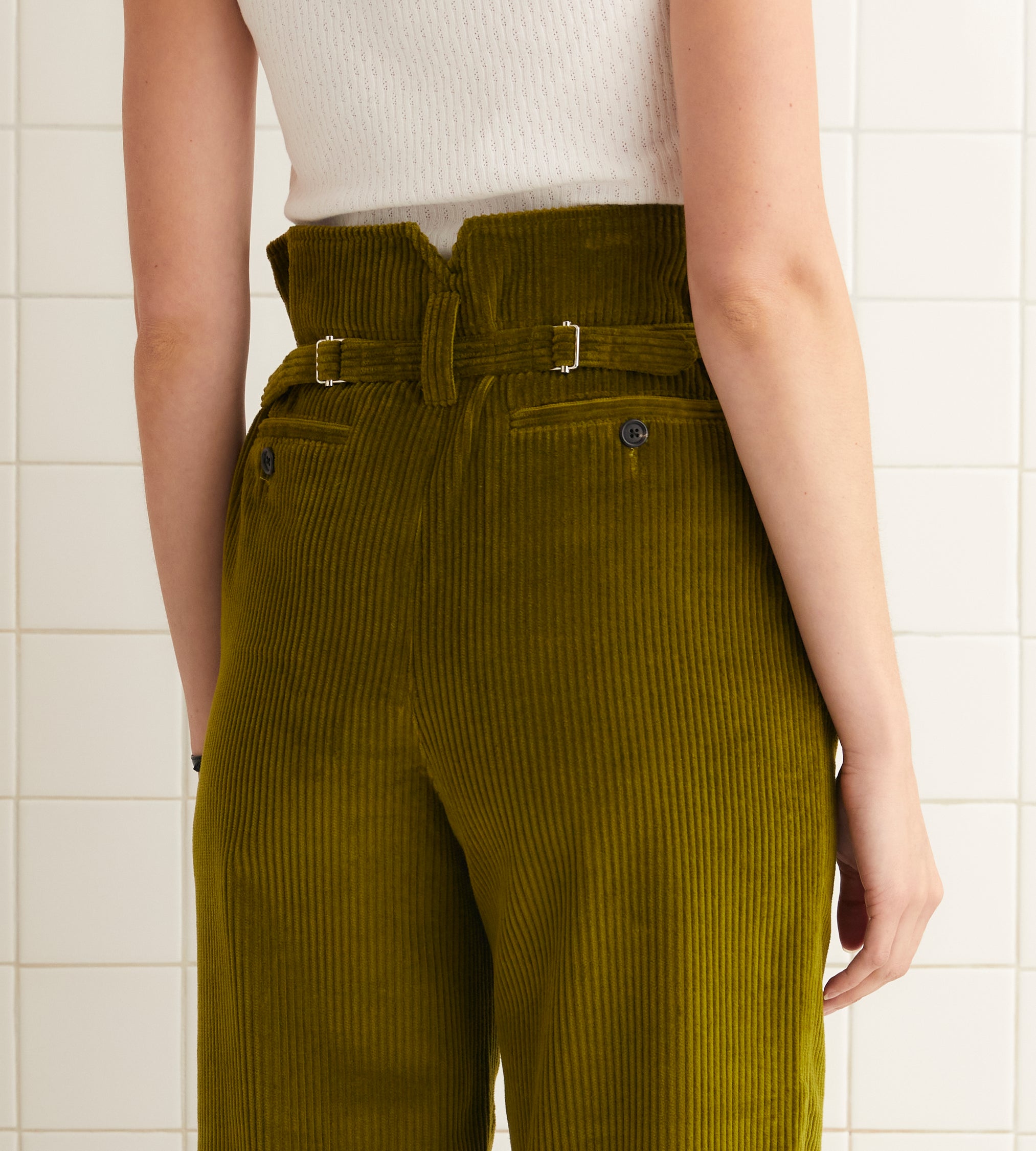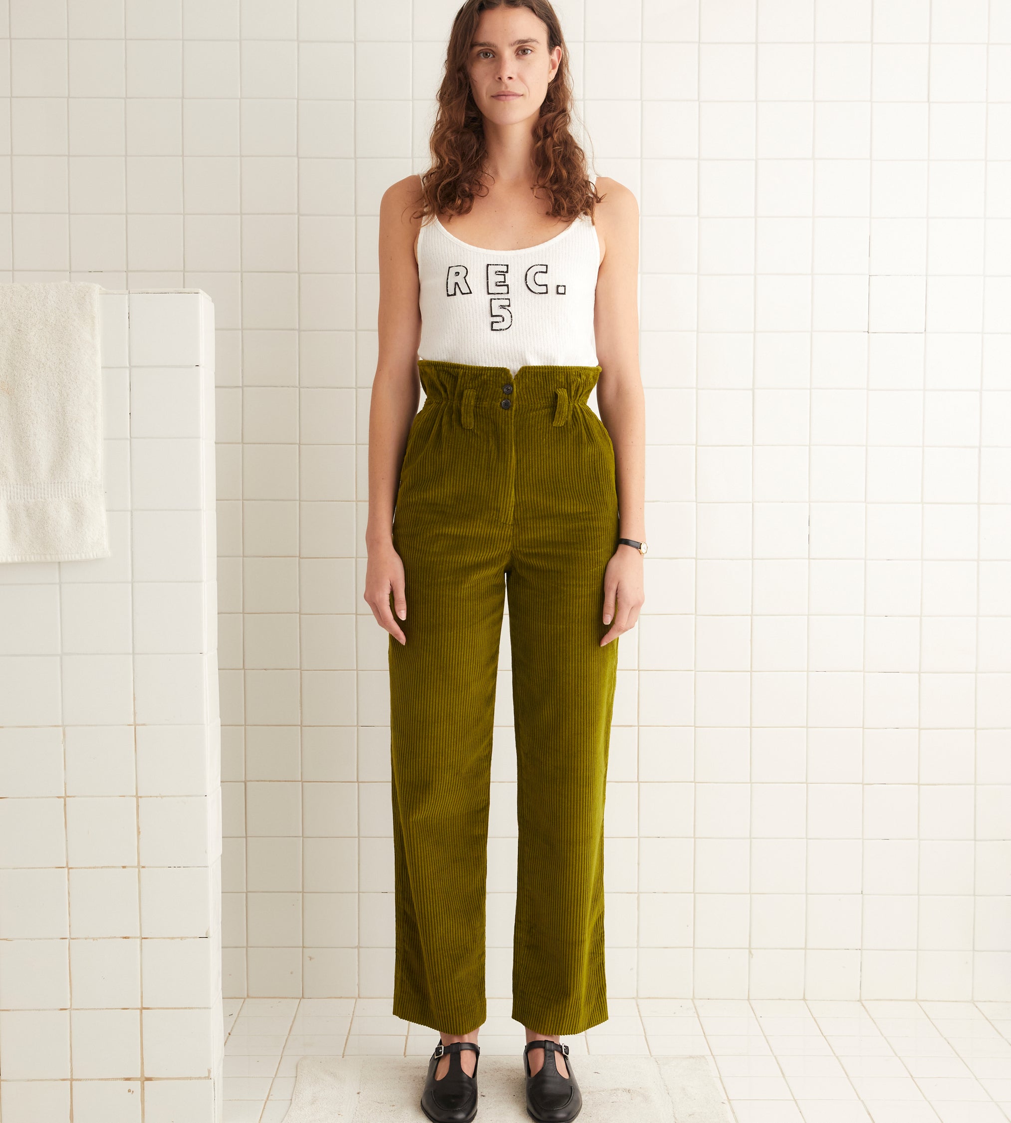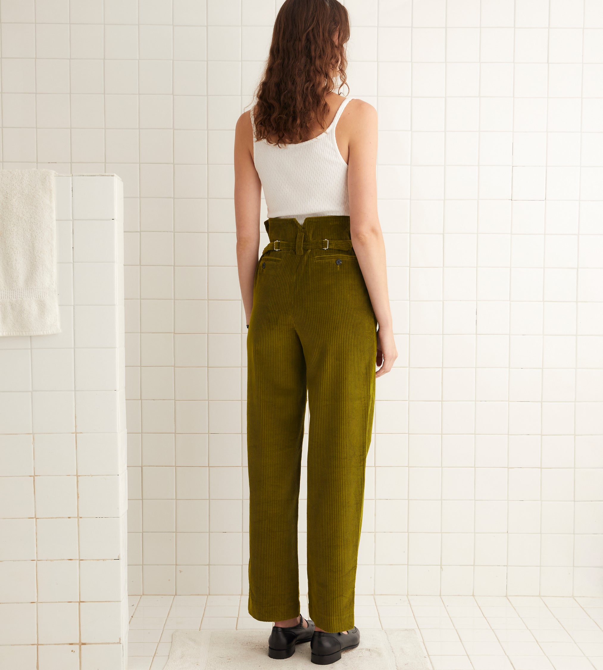 These trousers are cut from corduroy yardage with a wide wale. They have a high-rise and a wide leg. Hand-mending throughout.