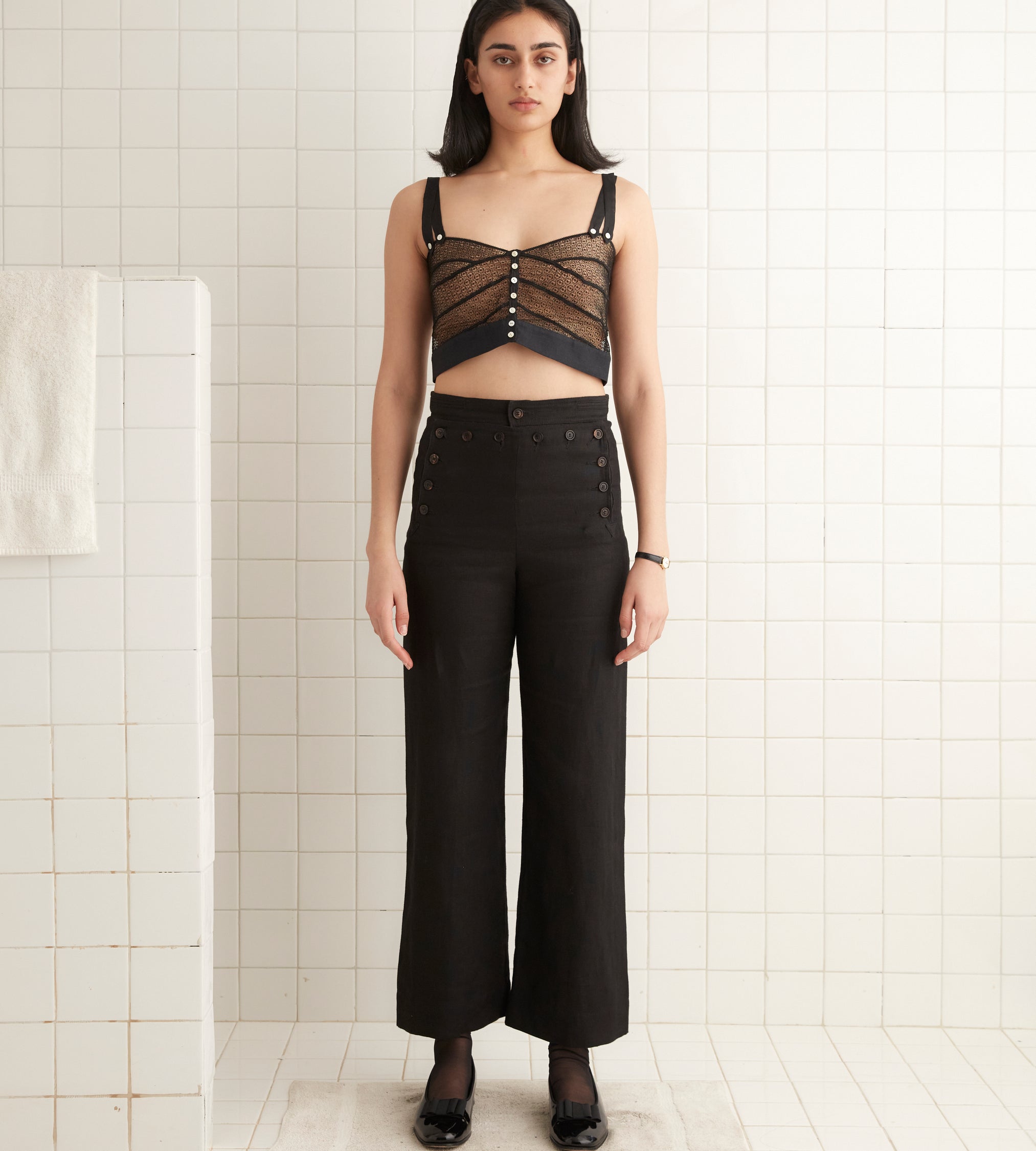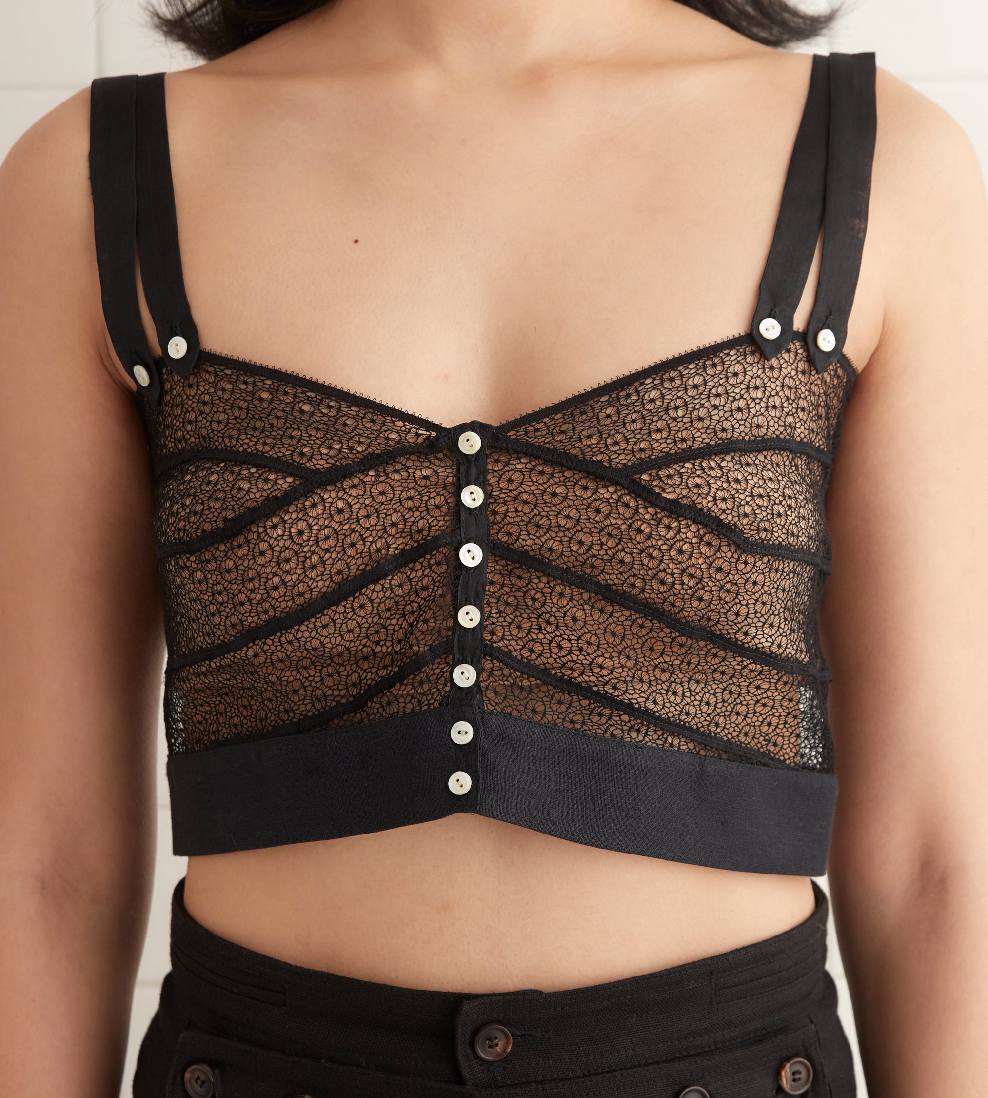 This tank is inspired by vintage women’s lingerie. We reproduced the silhouette for this style, which is made with French lace and buttons up the front.