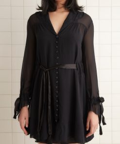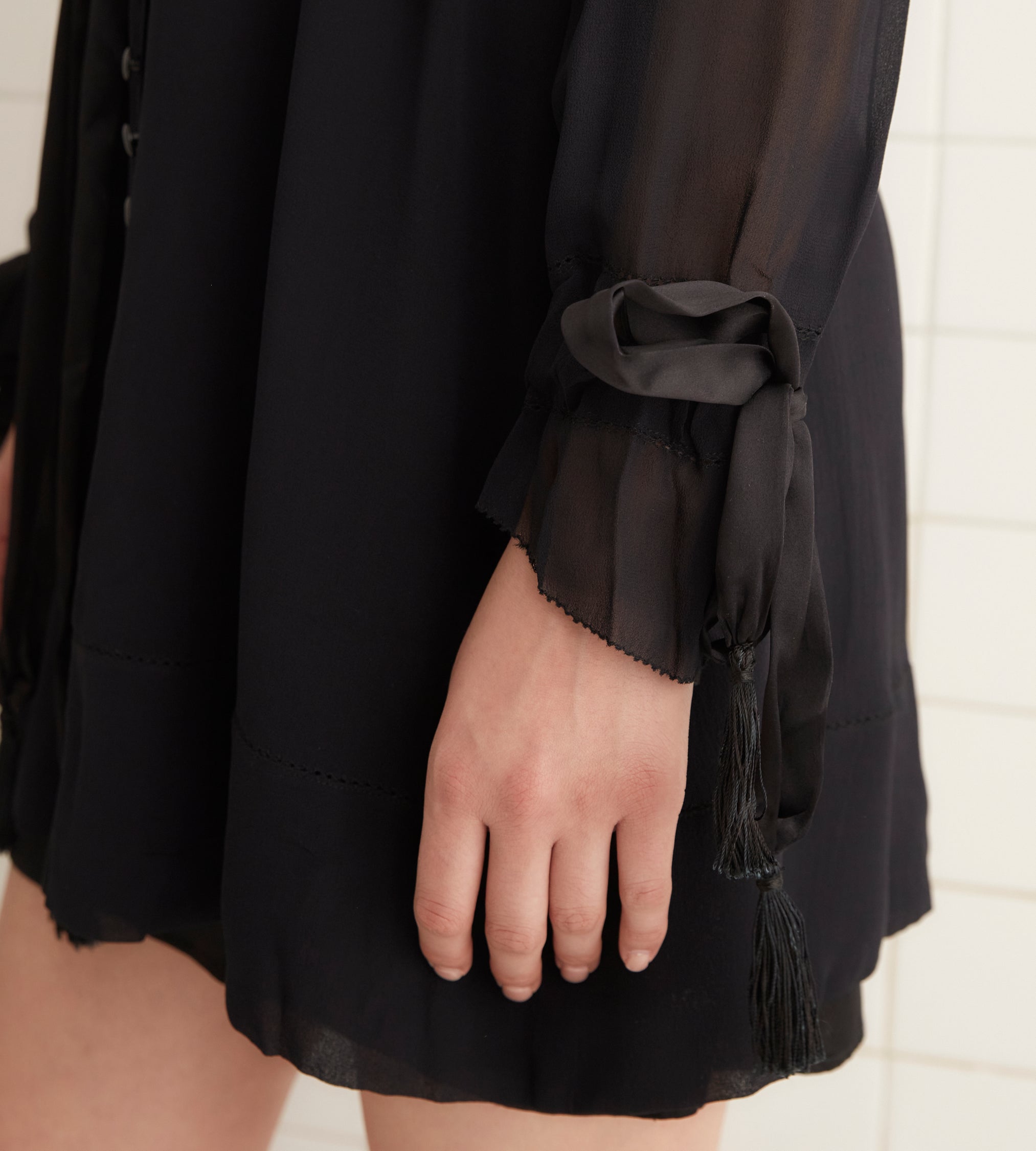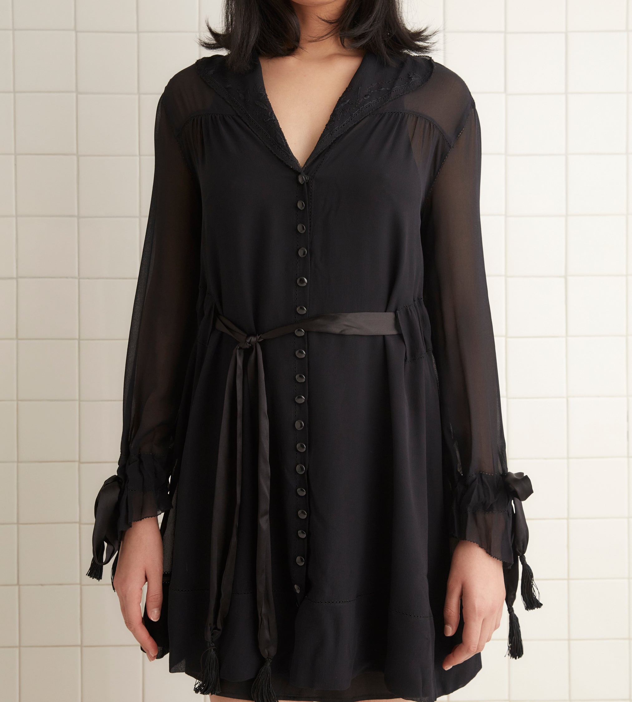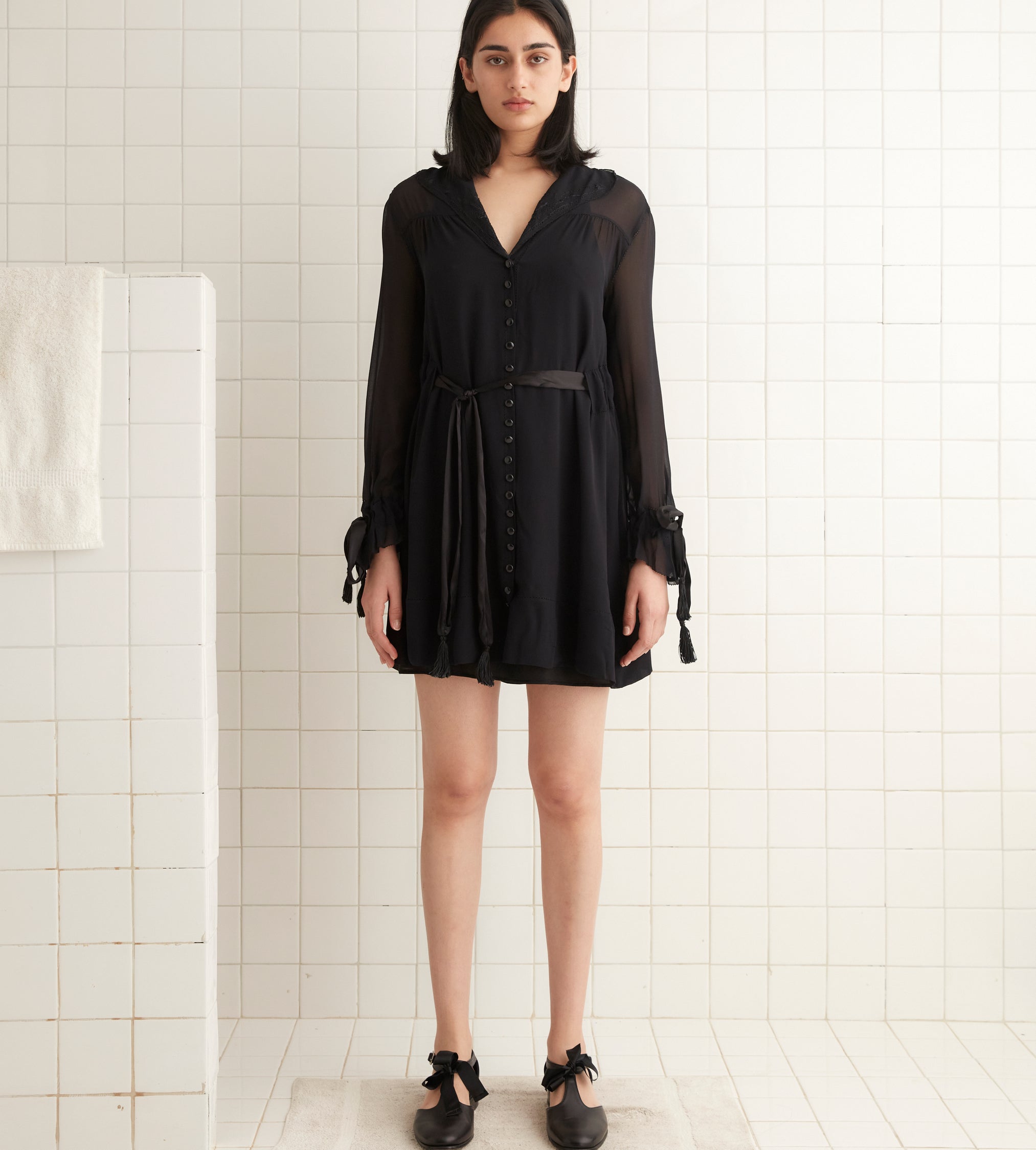 This piece is inspired by a dress from the 1910s-1920s. We have reproduced the original, with its unfitted silhouette, long sailor collar, and tonal embroidery. The sleeves tie with tasselled bows.