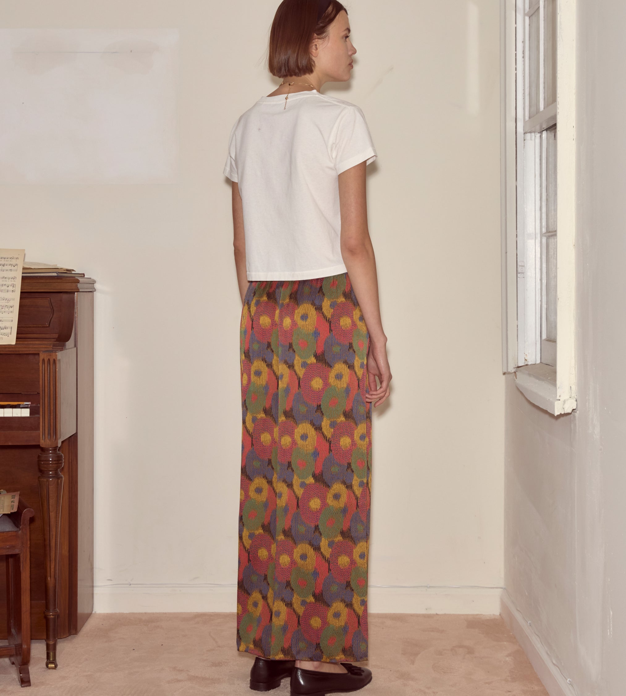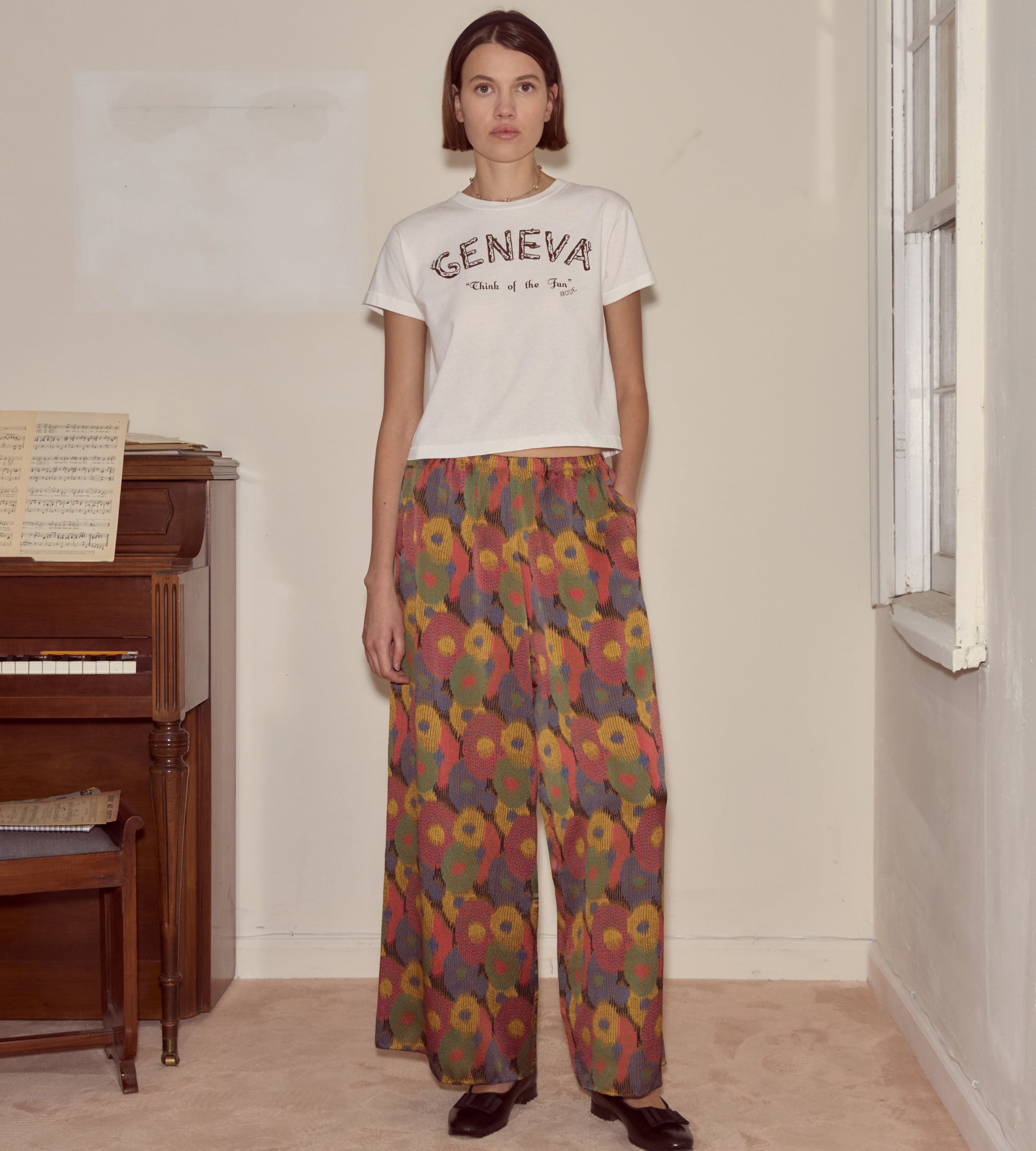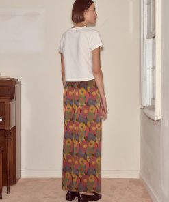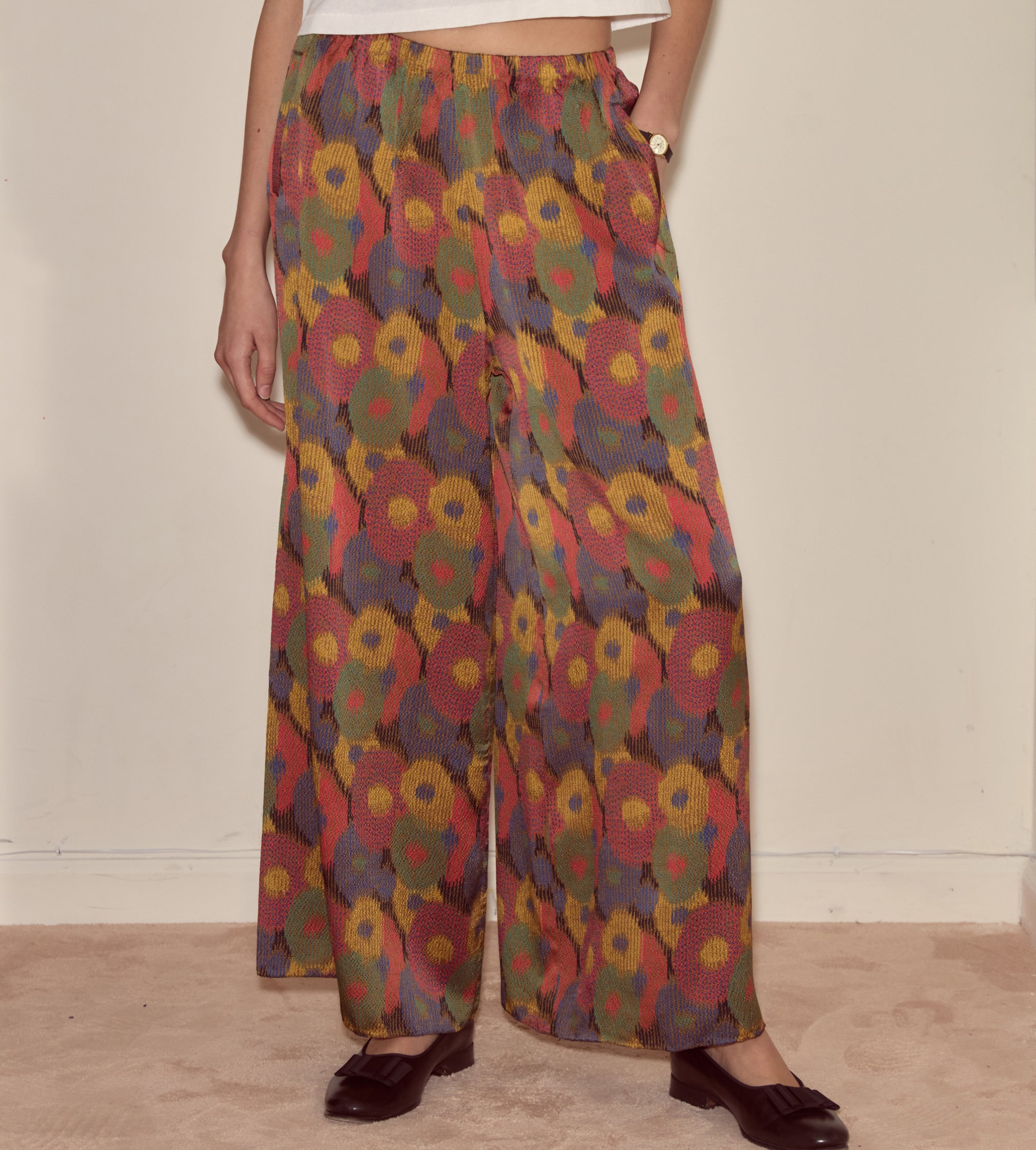These pants are cut from silk seersucker, a distinctive fabric recreated from a French swatchbook, c.1930s. They have a wide-leg silhouette reminiscent of beach pajamas, loose trousers worn over swimsuits that evolved out of sleepwear. The wide popularity of beach pajamas helped to normalize women’s pants in the early 20th century.