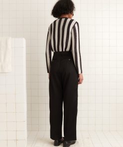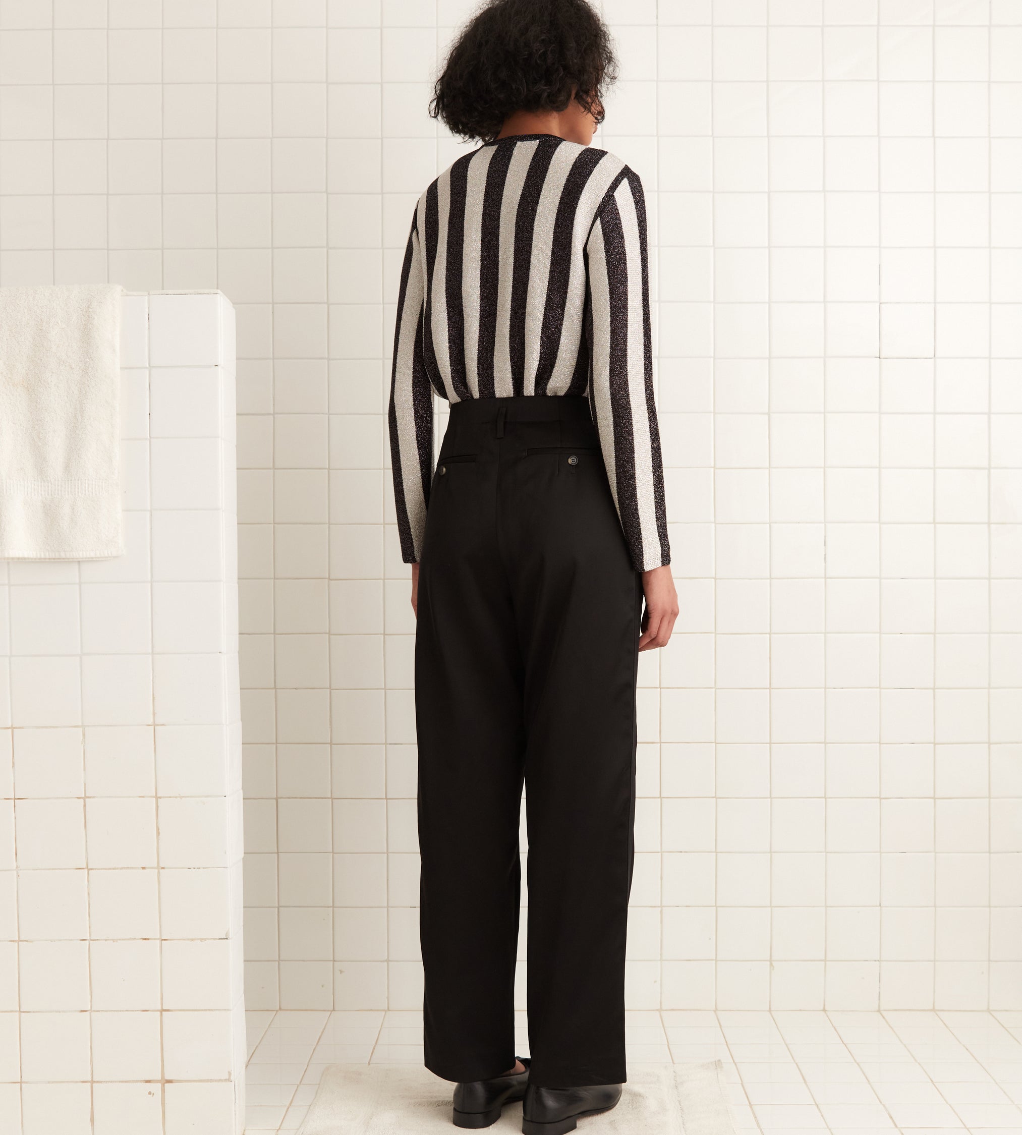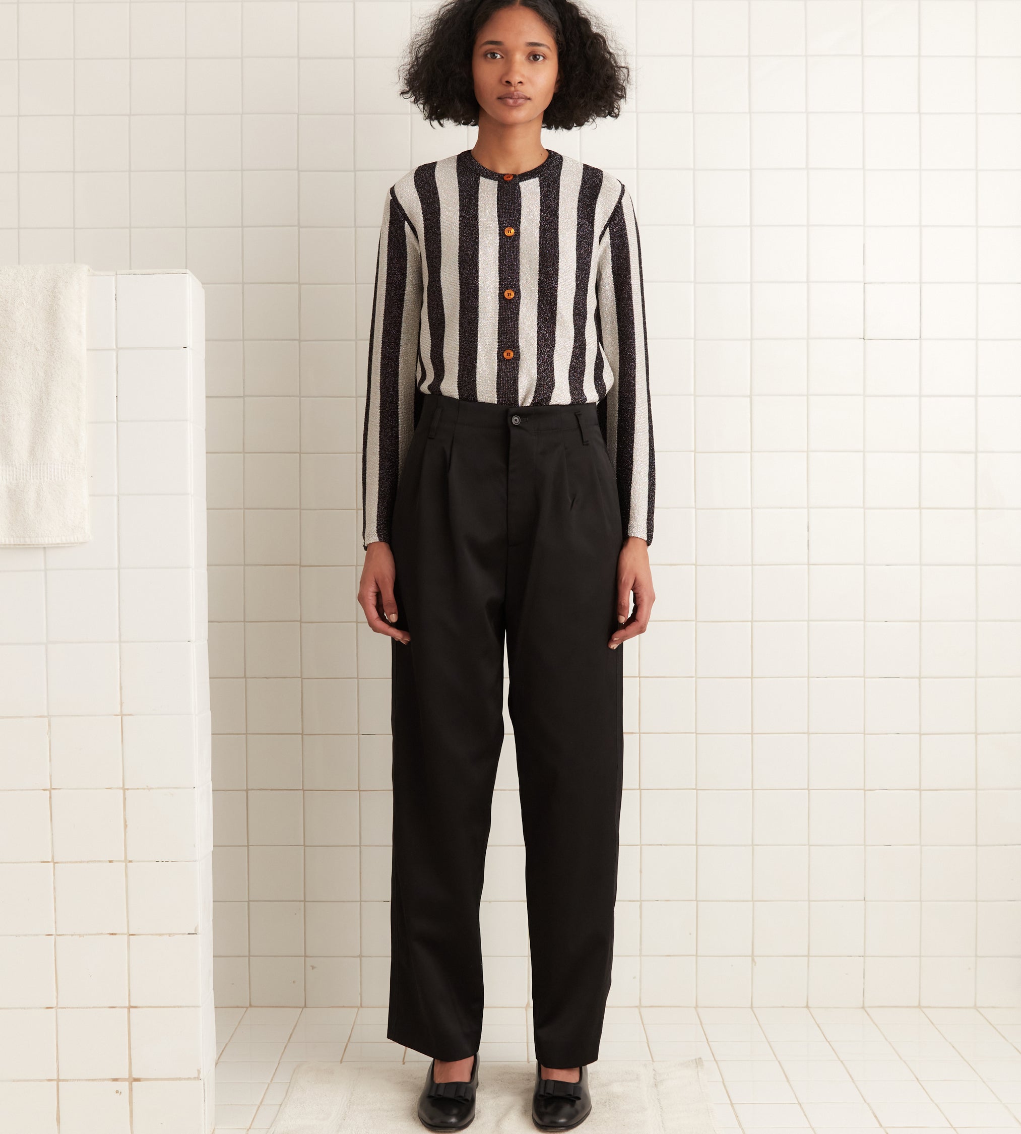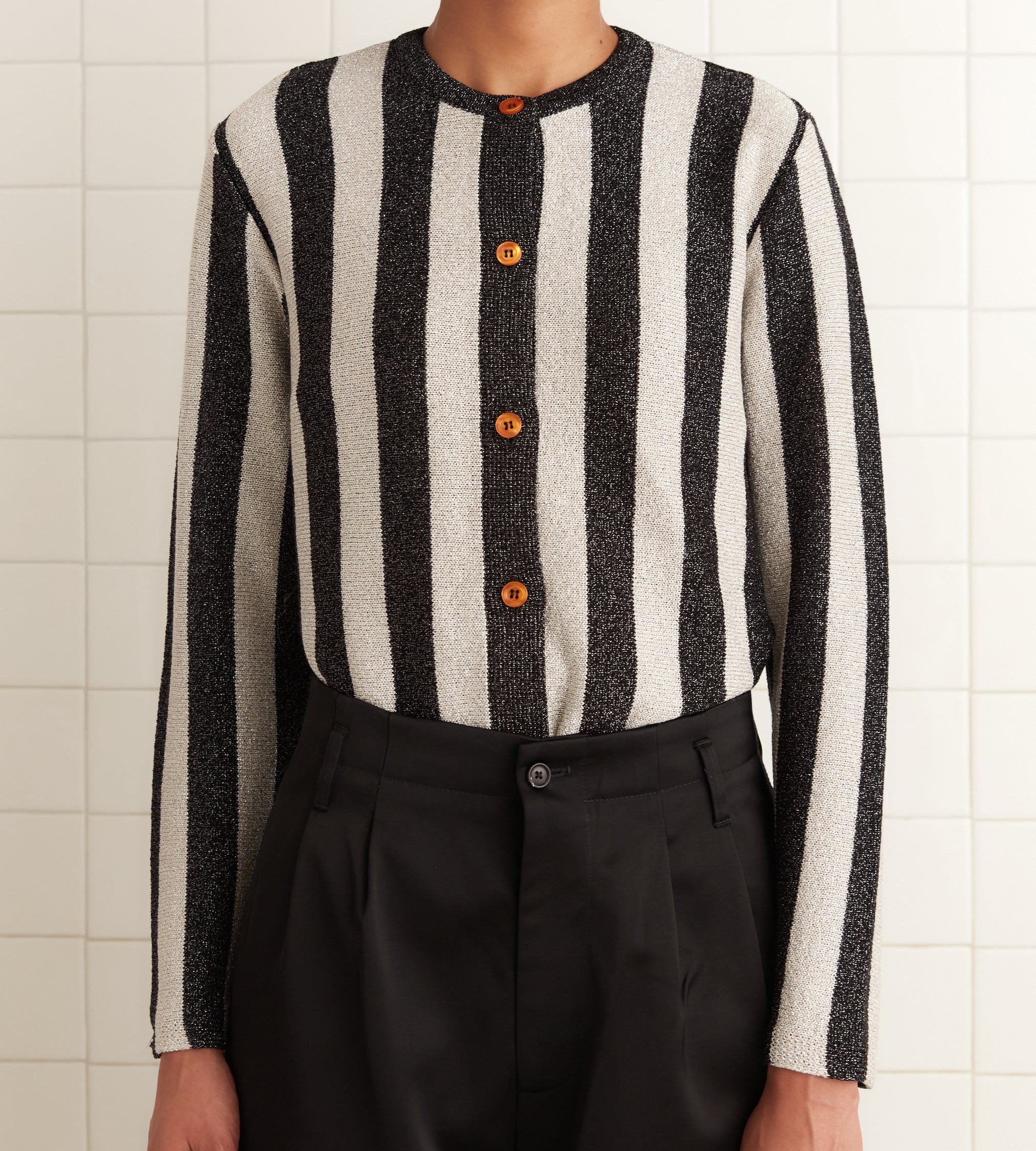 This cardigan is inspired by a sequined coat from Italy, c.1980s. We reproduced the black-and-white glitter stripes for this style, which is knit from a light lurex yarn.