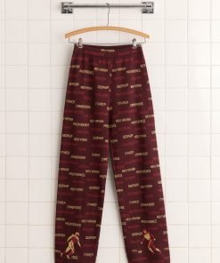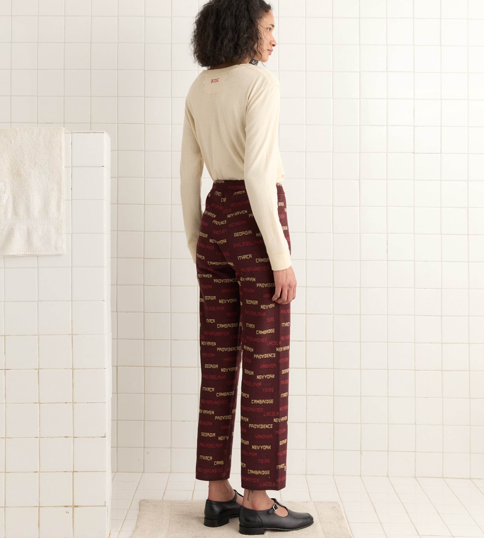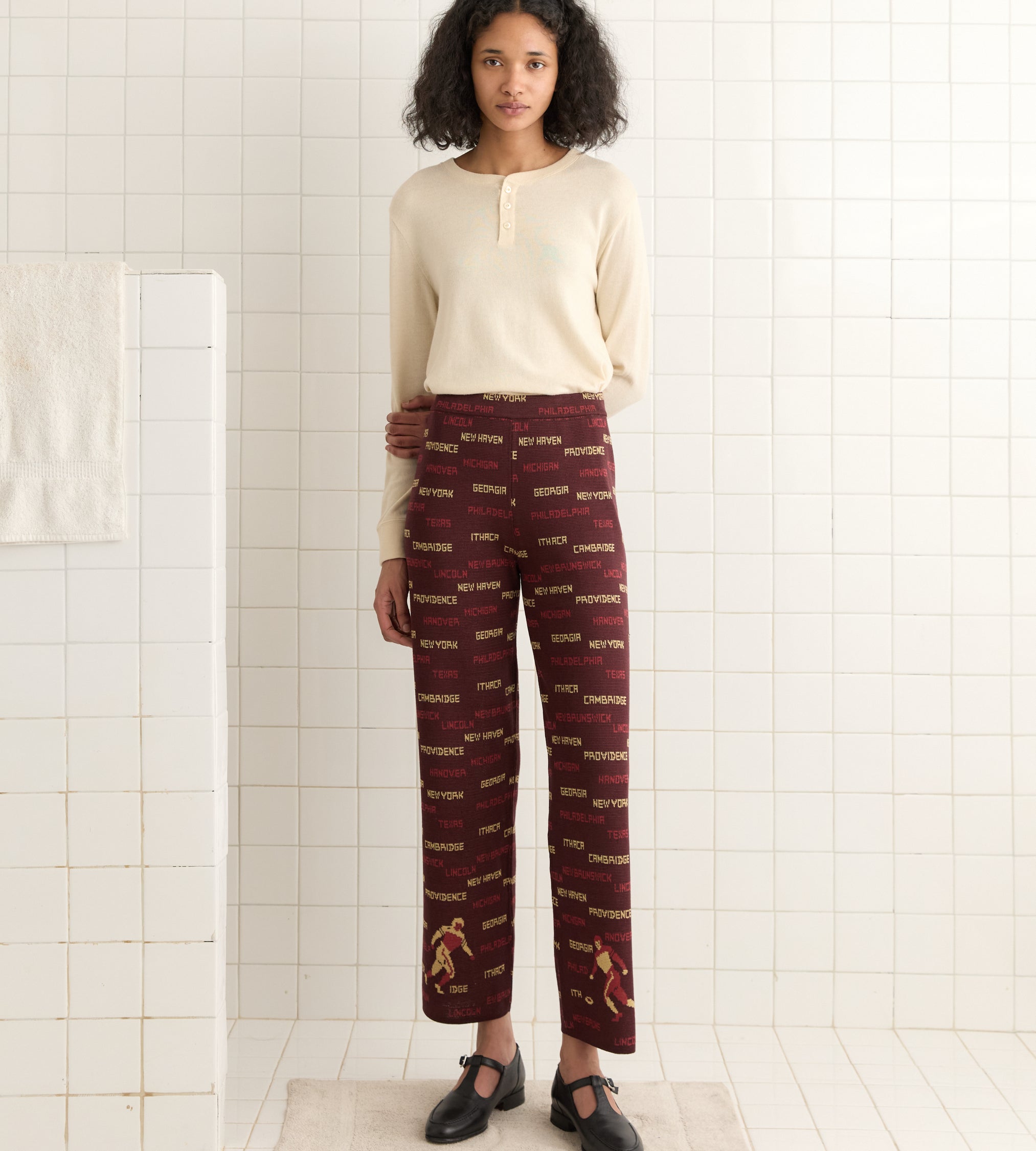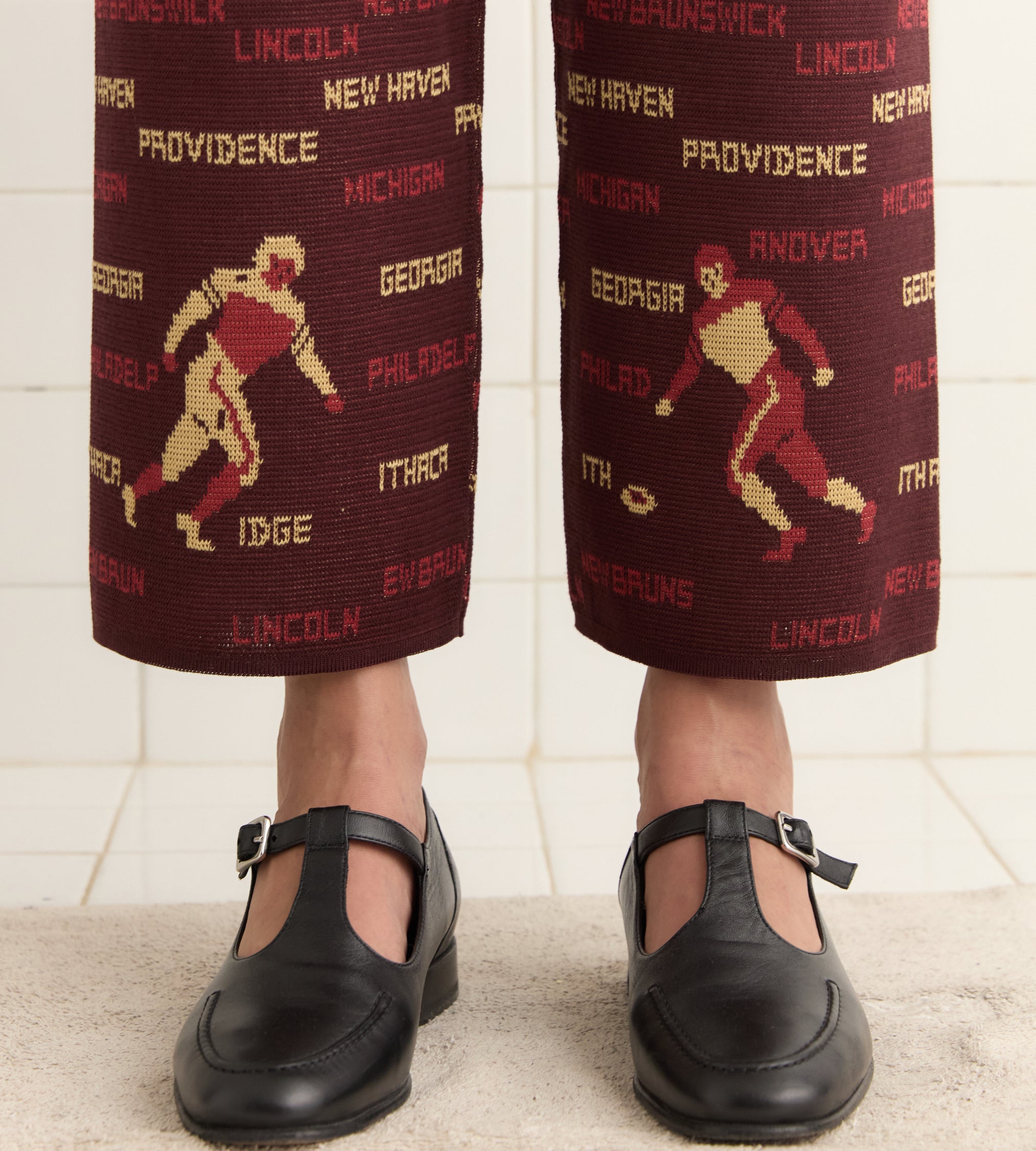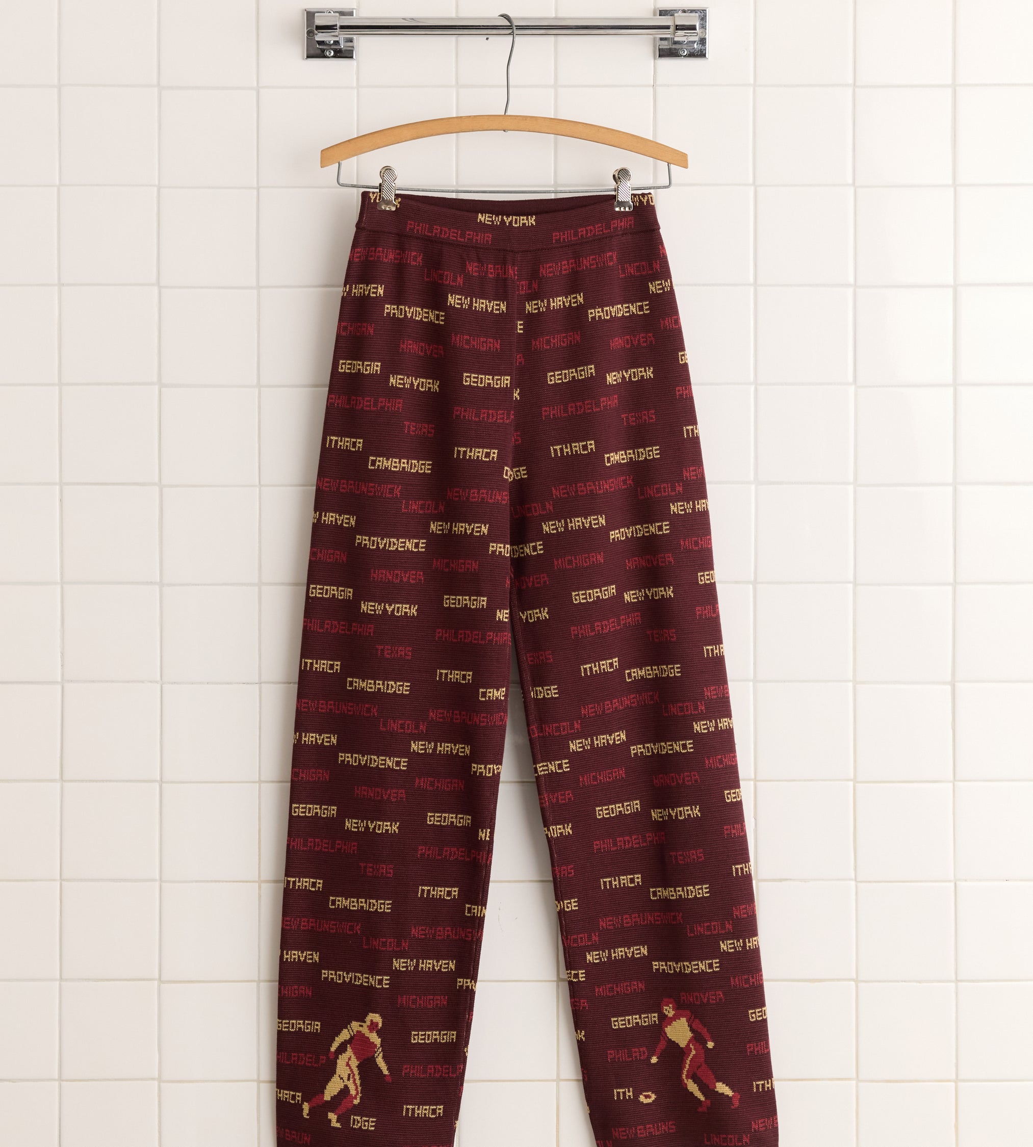 These joggers are inspired by a sweater from the 1940s, patterned with football players and names of cities and states. We reproduced the knit pattern for this style. The pants have a mid-rise and a wide-leg silhouette.