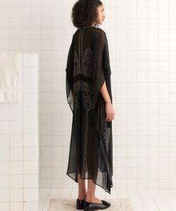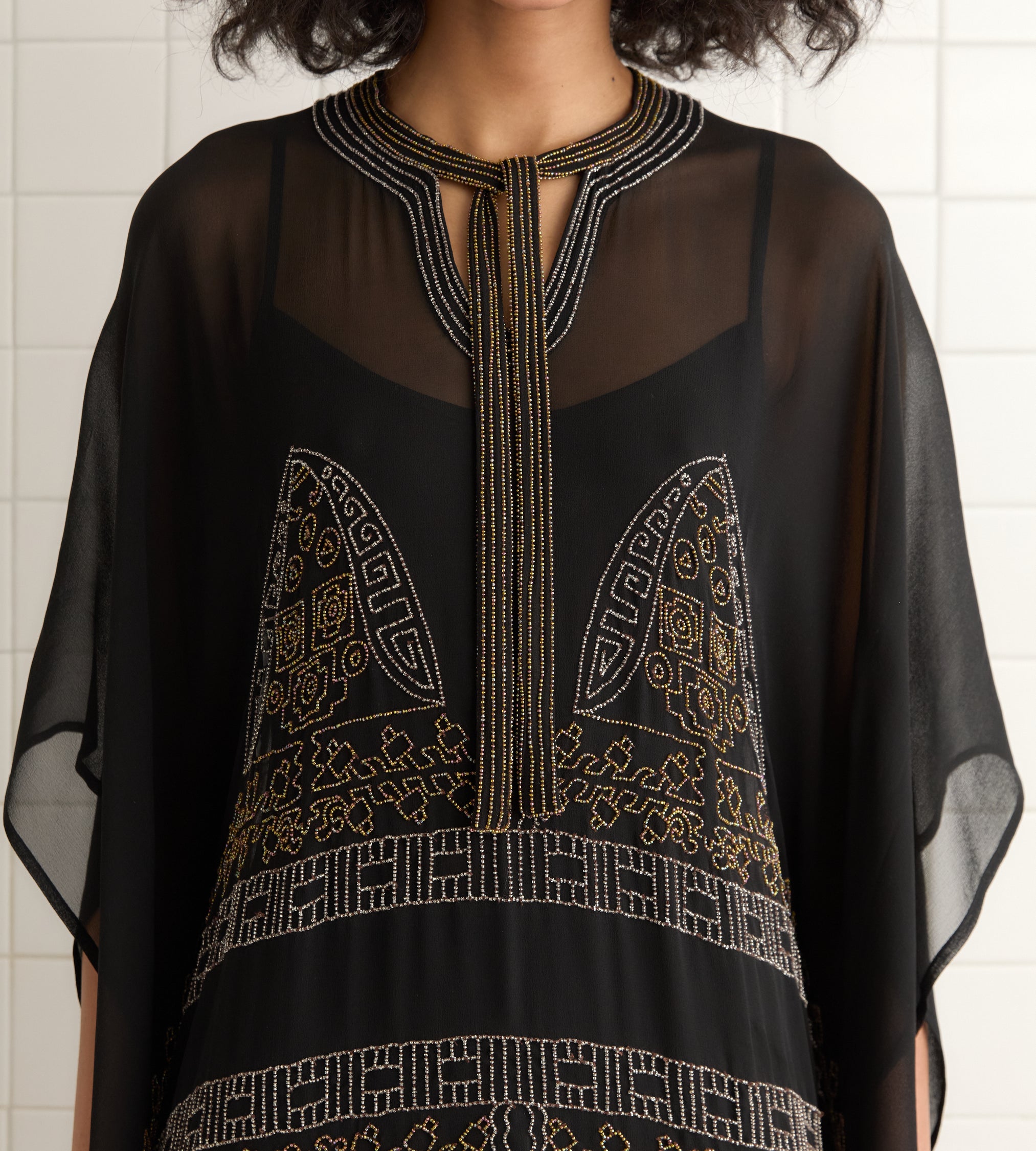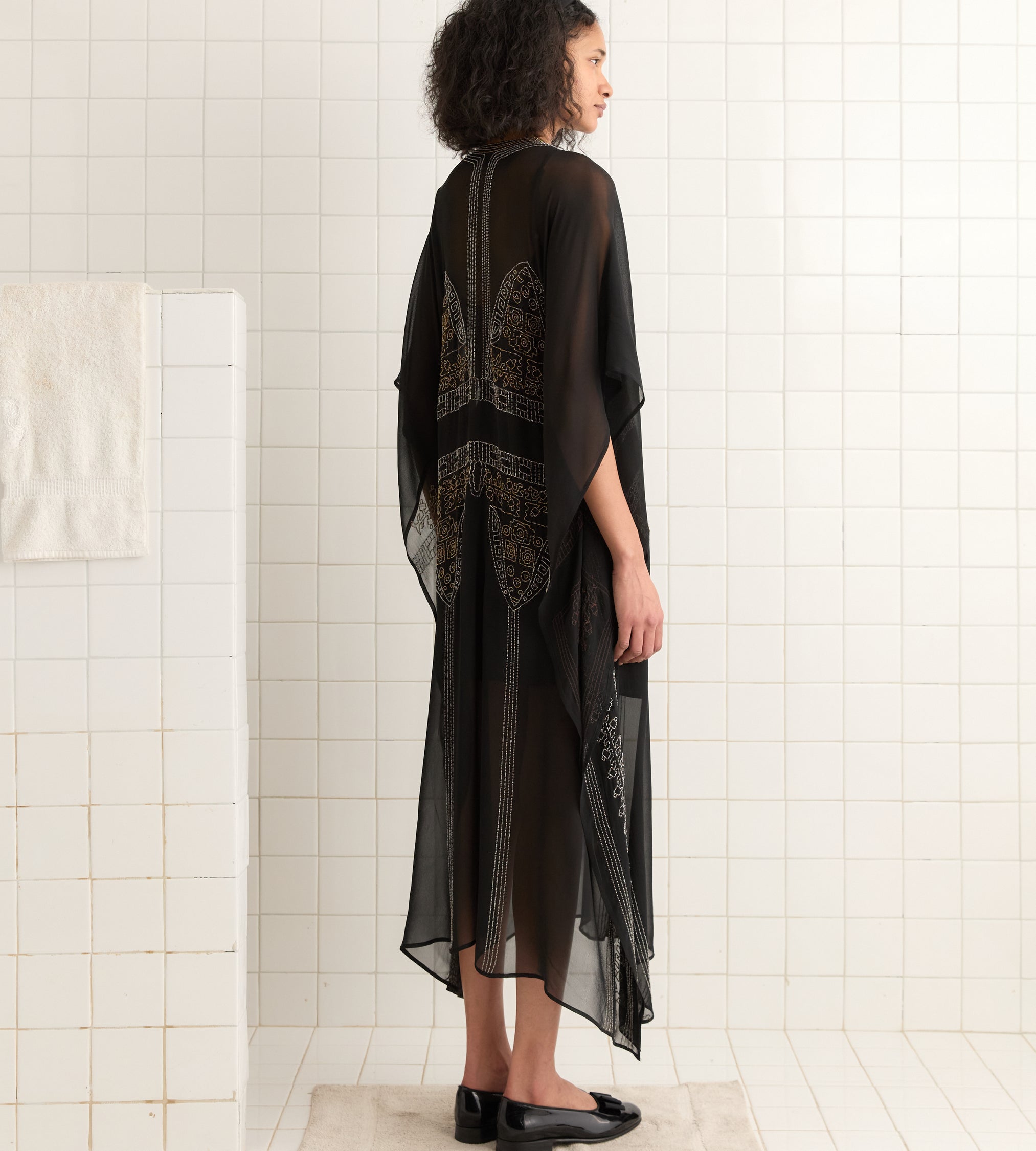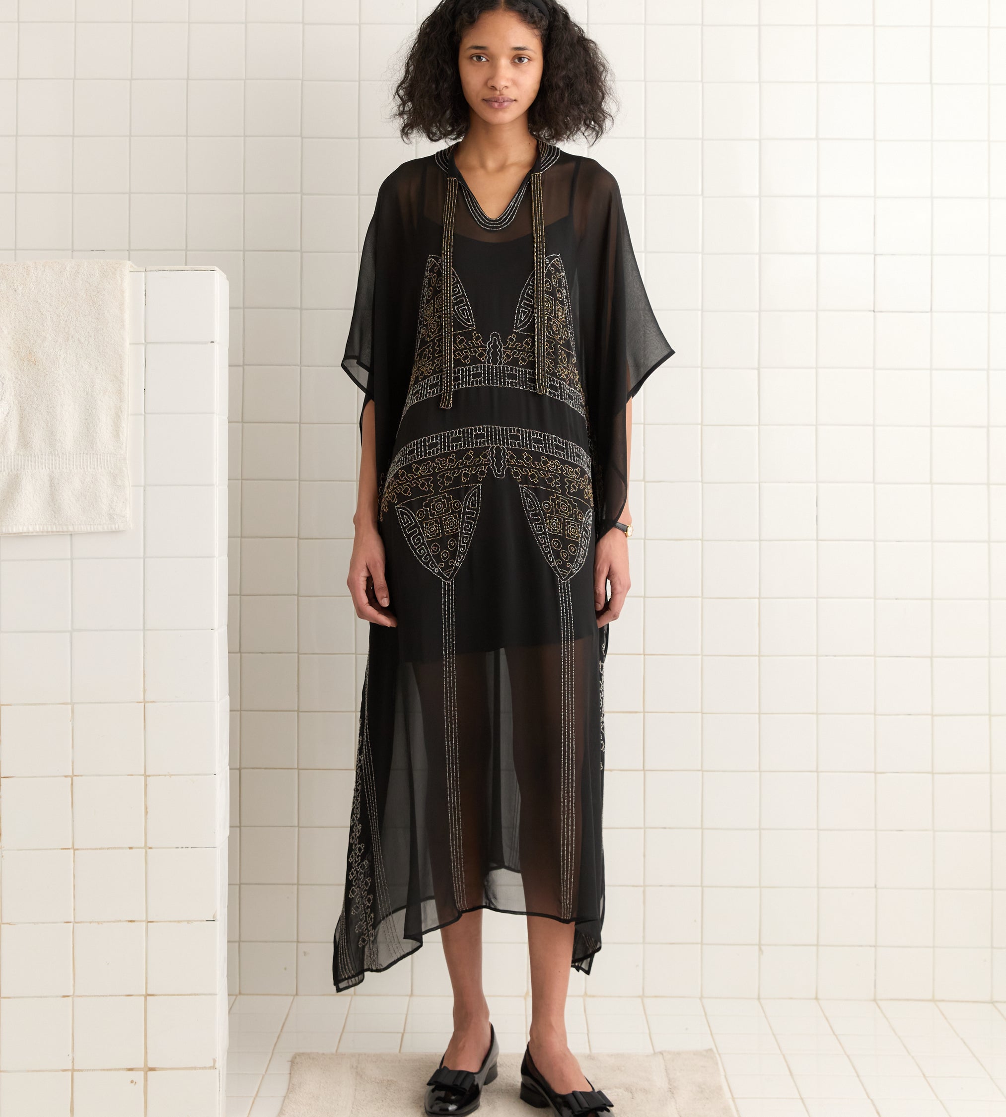 This kaftan is inspired by a beaded dress from the 1920s, which was beaded with patterns in the Egyptian Revival style, an aesthetic trend popular in America throughout the nineteenth and into the twentieth century. 1920s. “Egyptomania” was fanned by archaeological discoveries throughout the decade, especially of the tomb of Tutankhamun in 1922.