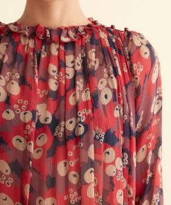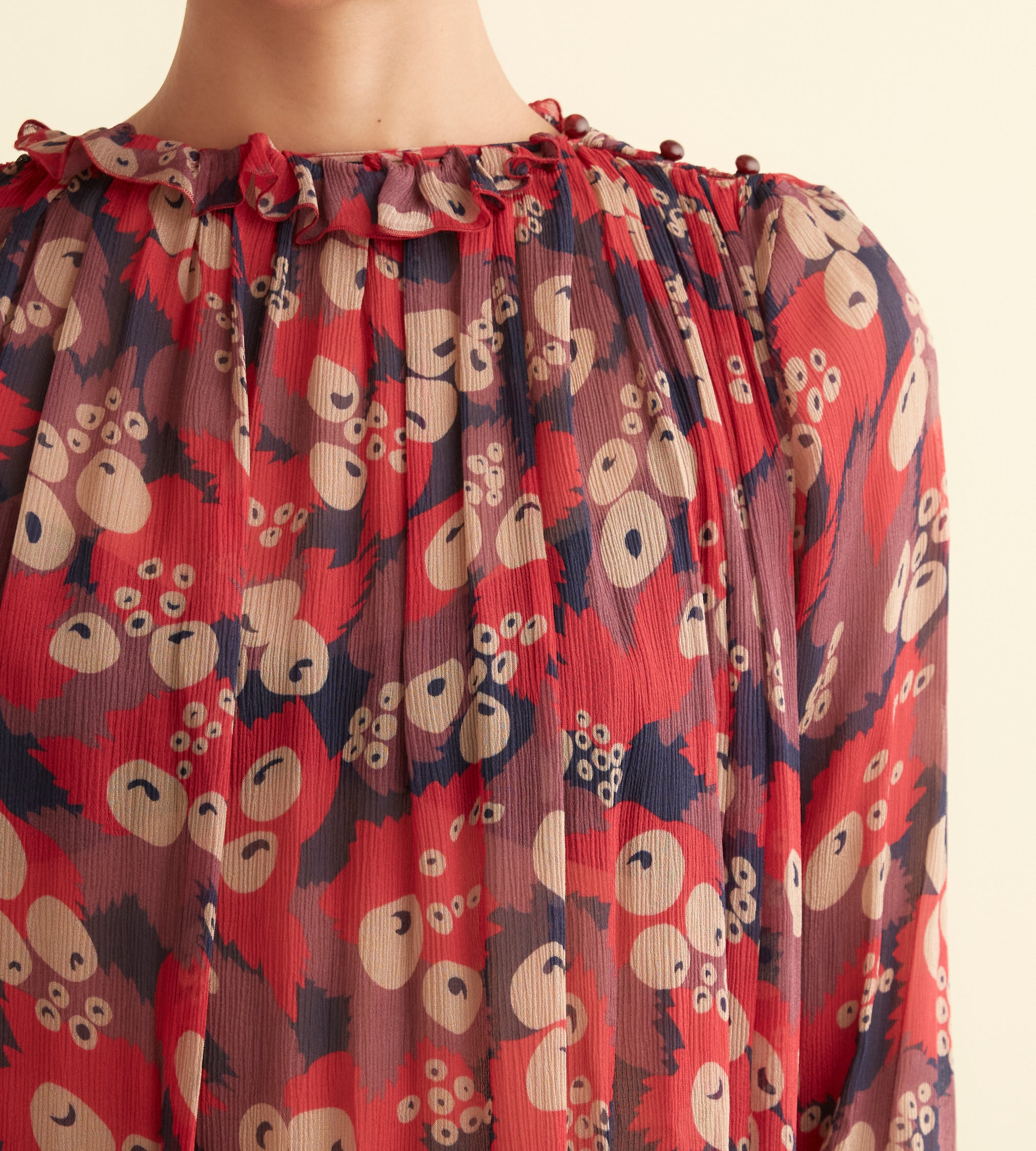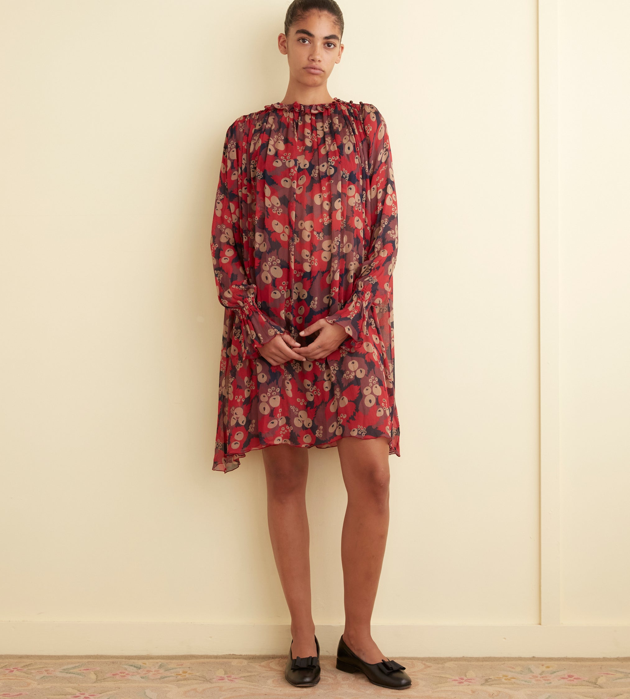 This style is inspired by a dress from the 1920s. We have reproduced the original piece, with its gathered, unfitted silhouette, in a print recreated from 1920s fabric. The neckline is trimmed with a ruffle detail and the sleeves with smocking.