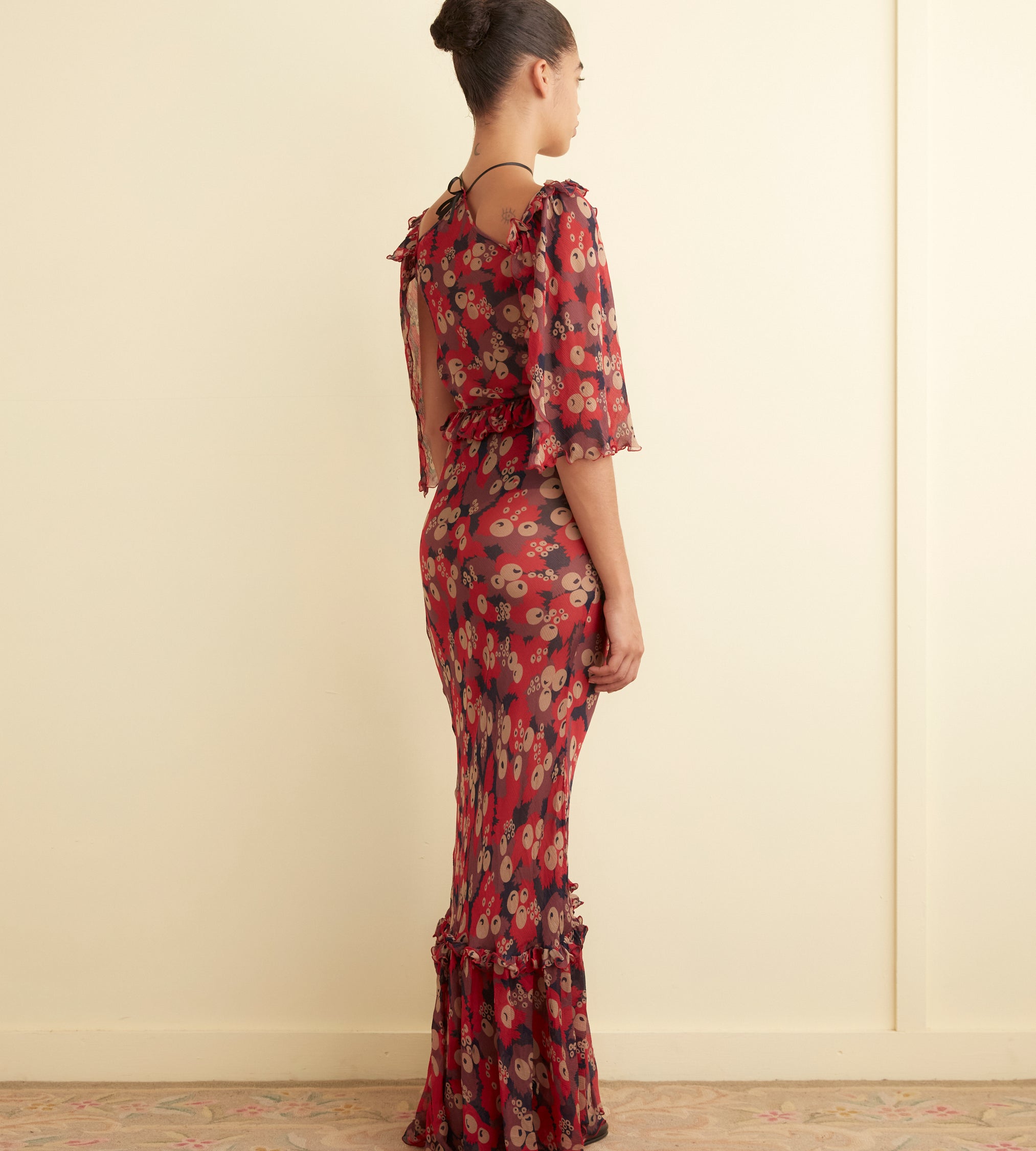 This dress is inspired by one from the 1930s. We recreated the original dress, with its ruffles and halter-neck detail, in a berry print recreated from a scrap of 1920s fabric.