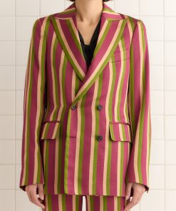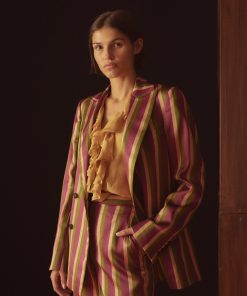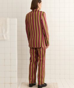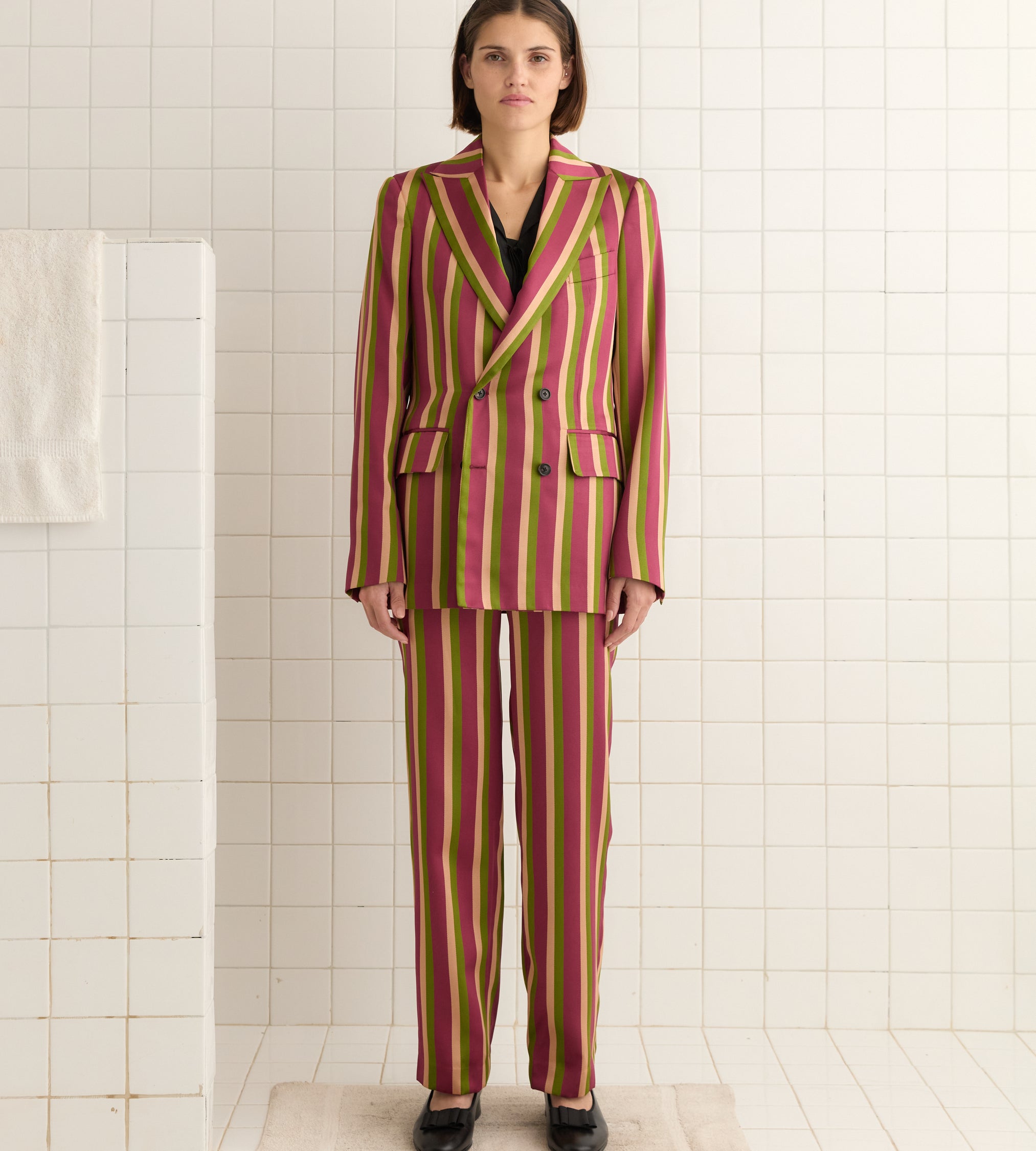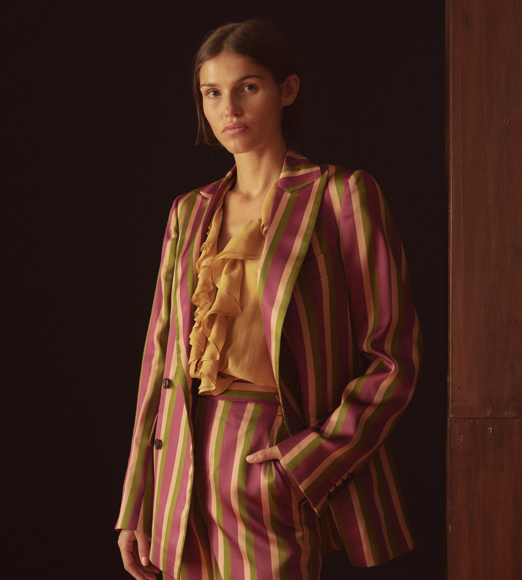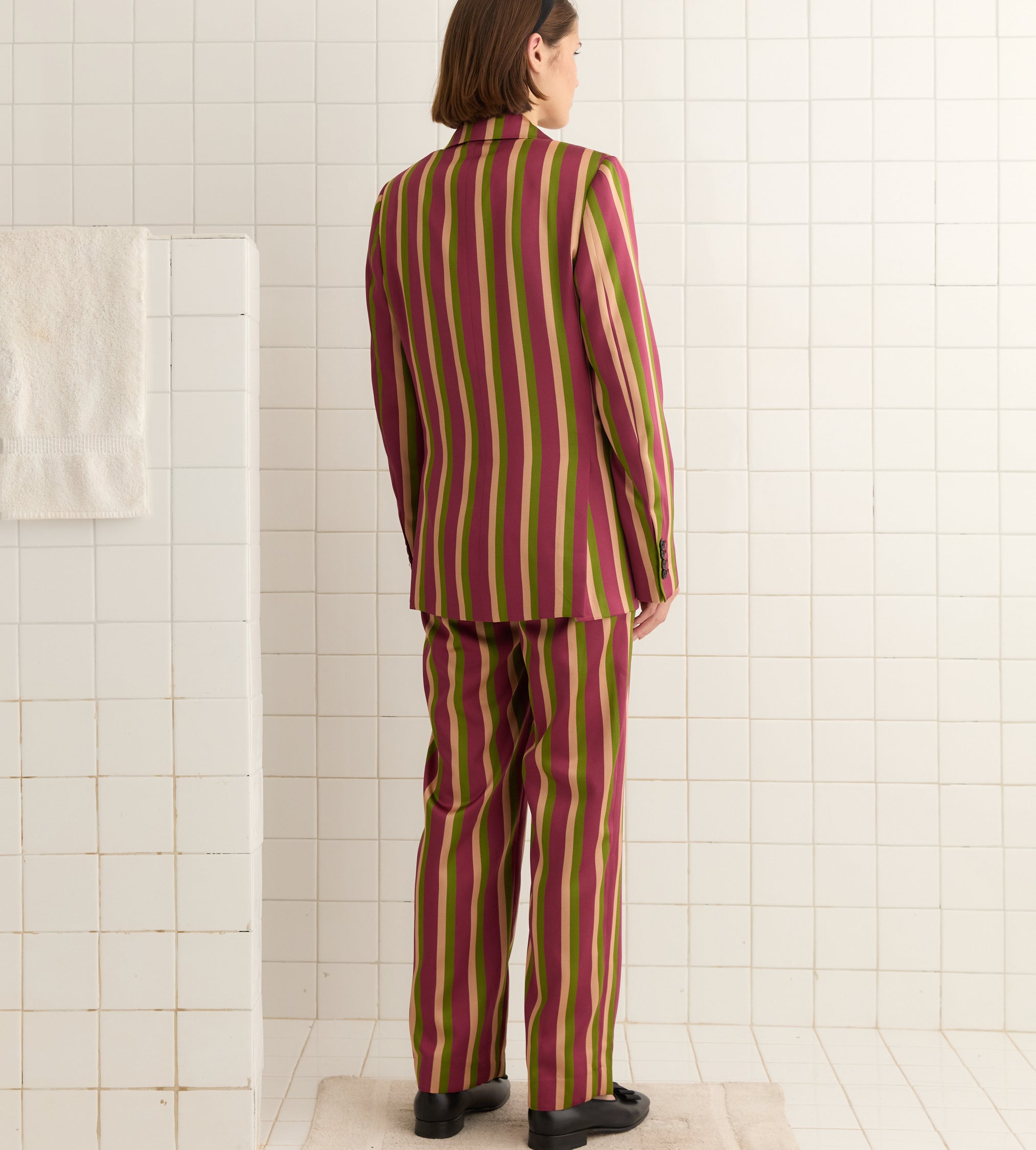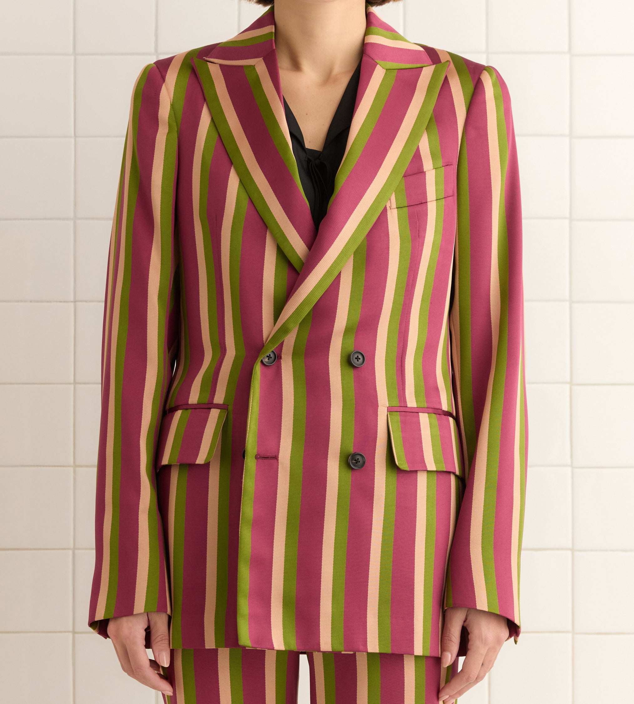 This suit jacket is inspired by Kutnu fabric. Kutnu is historically woven in Gaziantep in Southern Turkey. Rendered in satin with silk warp and cotton weft thread, this striped jacket is known for its distinctive shimmer.