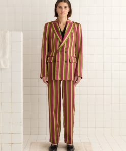 This suit jacket is inspired by Kutnu fabric. Kutnu is historically woven in Gaziantep in Southern Turkey. Rendered in satin with silk warp and cotton weft thread, this striped jacket is known for its distinctive shimmer.