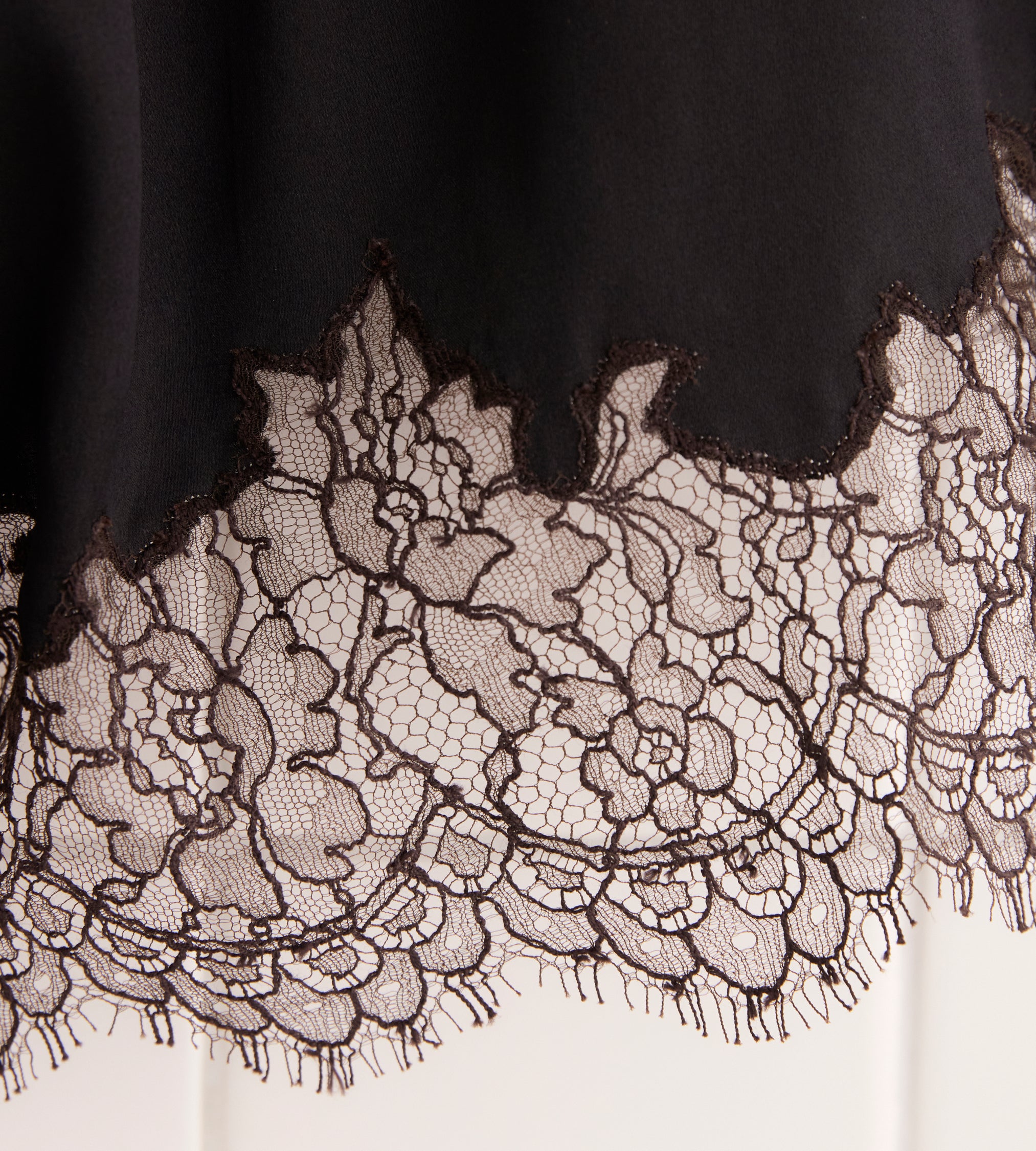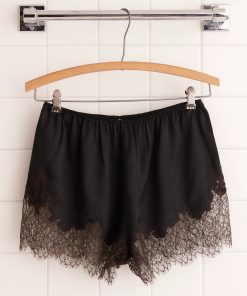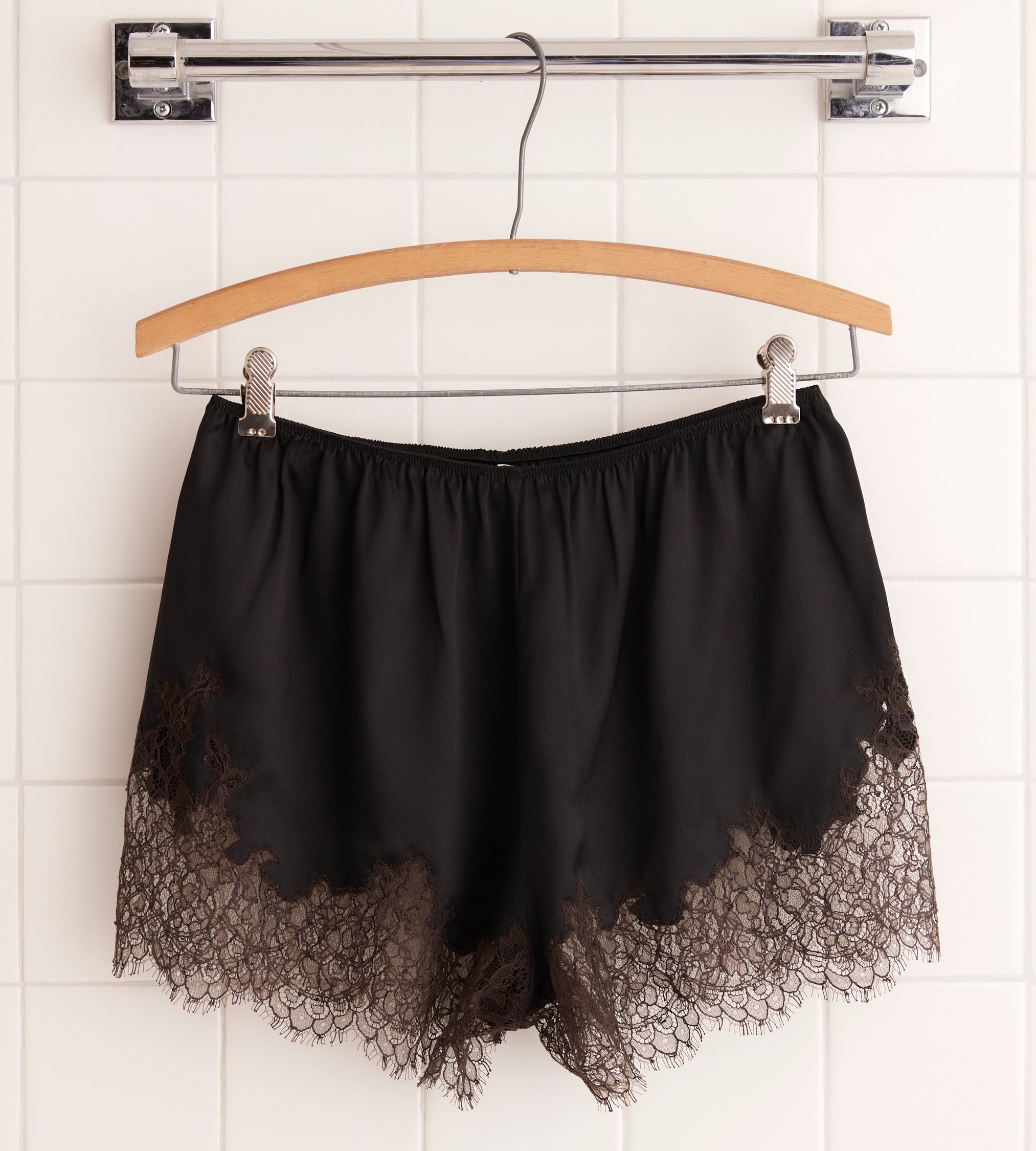 These shorts are a historical reproduction of tap shorts from the 1930s-1940s. Made from black silk, they have a wide band of dark brown lace around the hem. The lace was applied by hand using a cutaway technique.