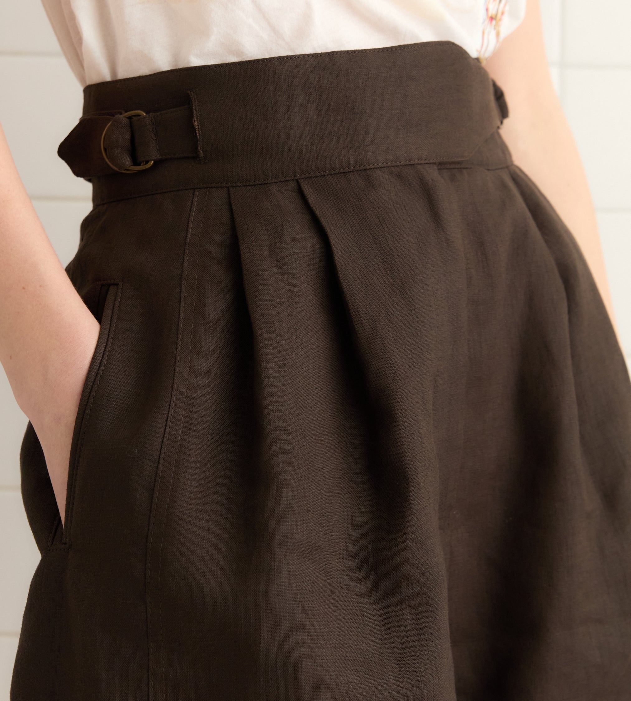 This style is a historical reproduction of a pair of women’s shorts from the late 20th century. Made from fine dark brown linen, they have a long, loose silhouette and feature D-ring buckles to adjust the waistband.