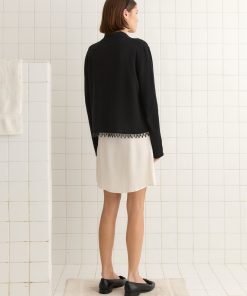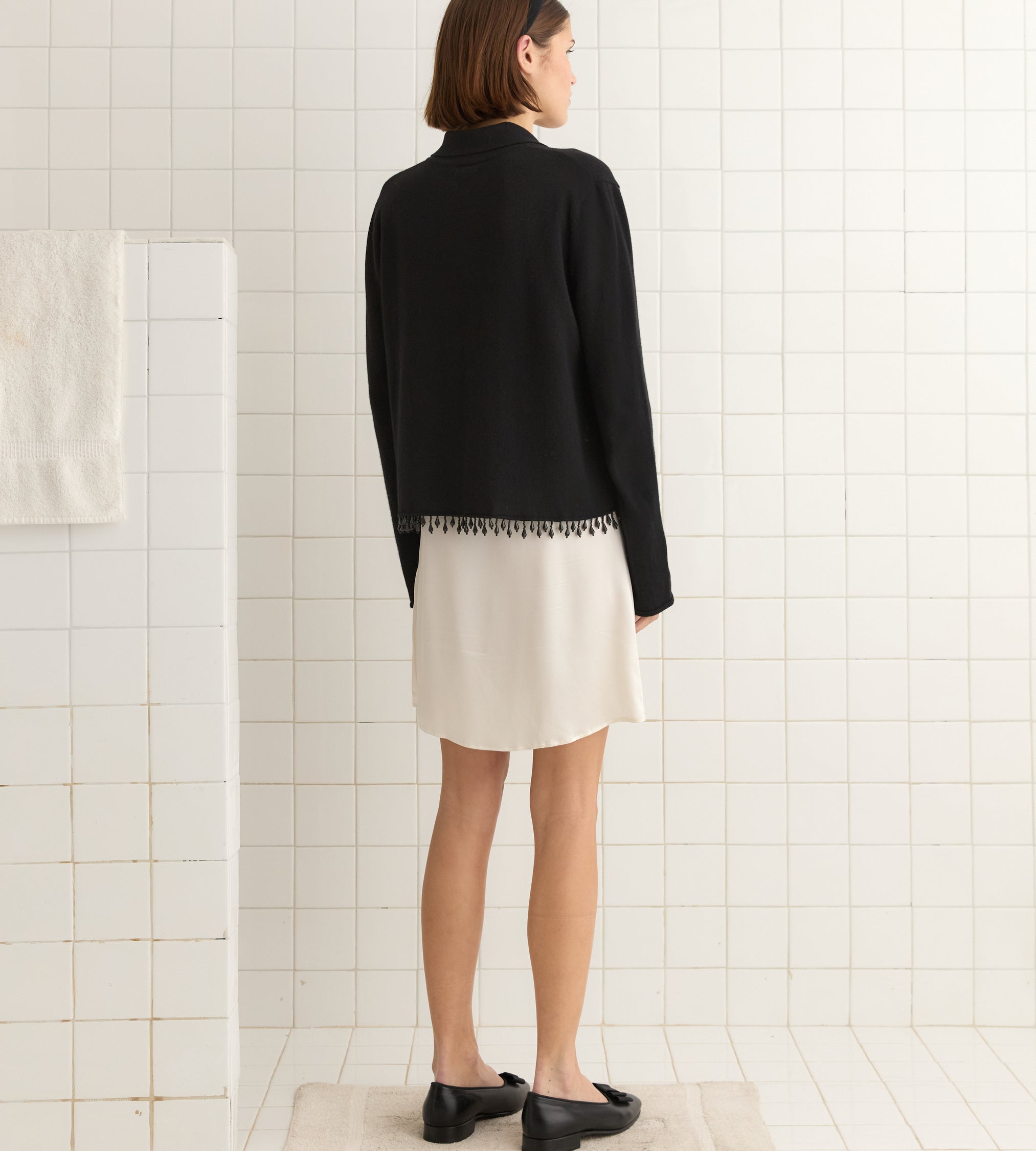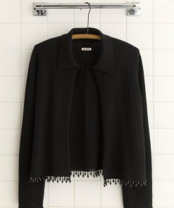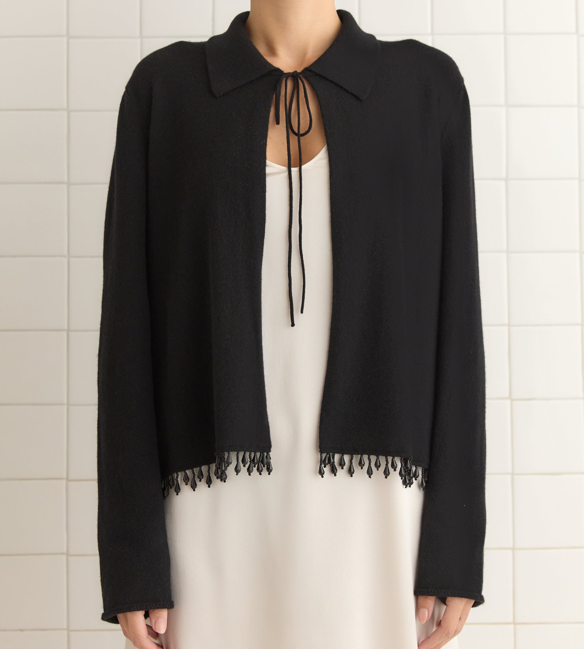 This style is inspired by a vintage French cardigan, sourced in Paris. We reproduced the silhouette, with its pointed collar and its tie-neck detail, in cashmere. The cardigan is trimmed with droplet beads.