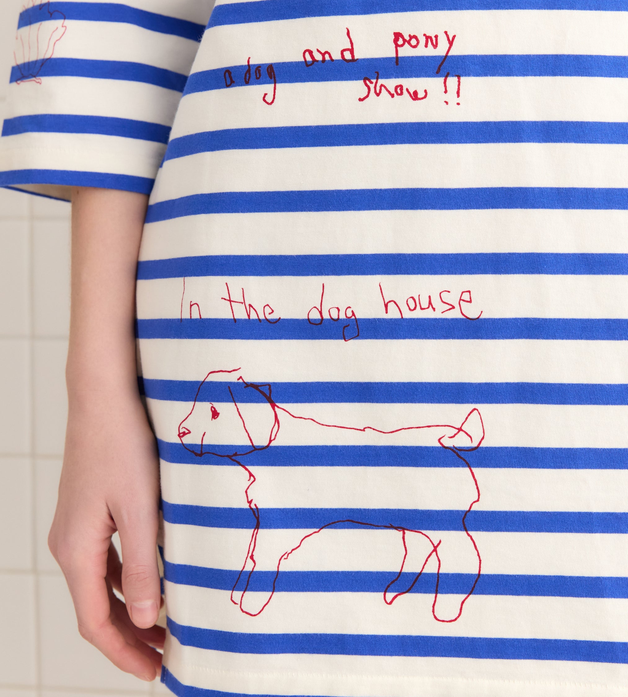 This dress is inspired by a marinière from the French Navy, dating between 1950 and 1953. The sailor who owned it had drawn illustrations all over the shirt. We reproduced the hand drawings for this style.