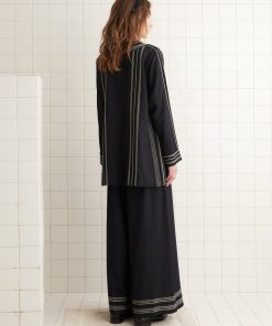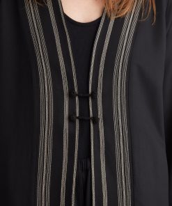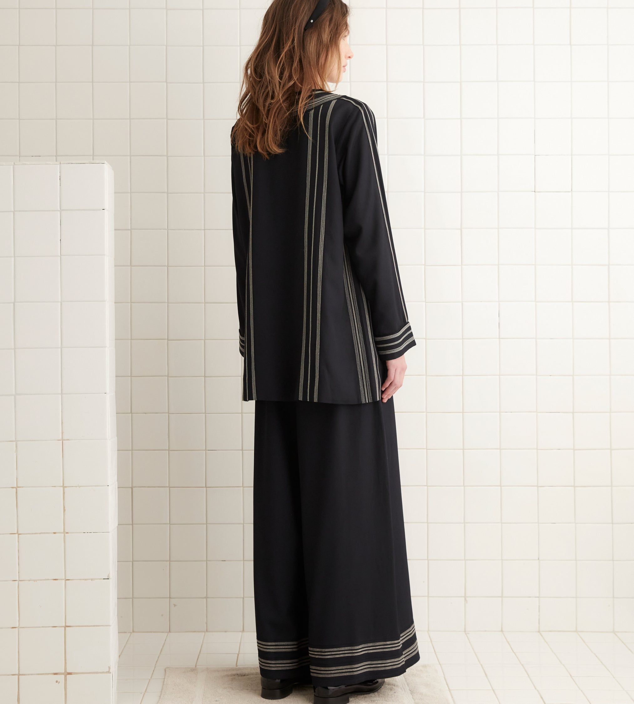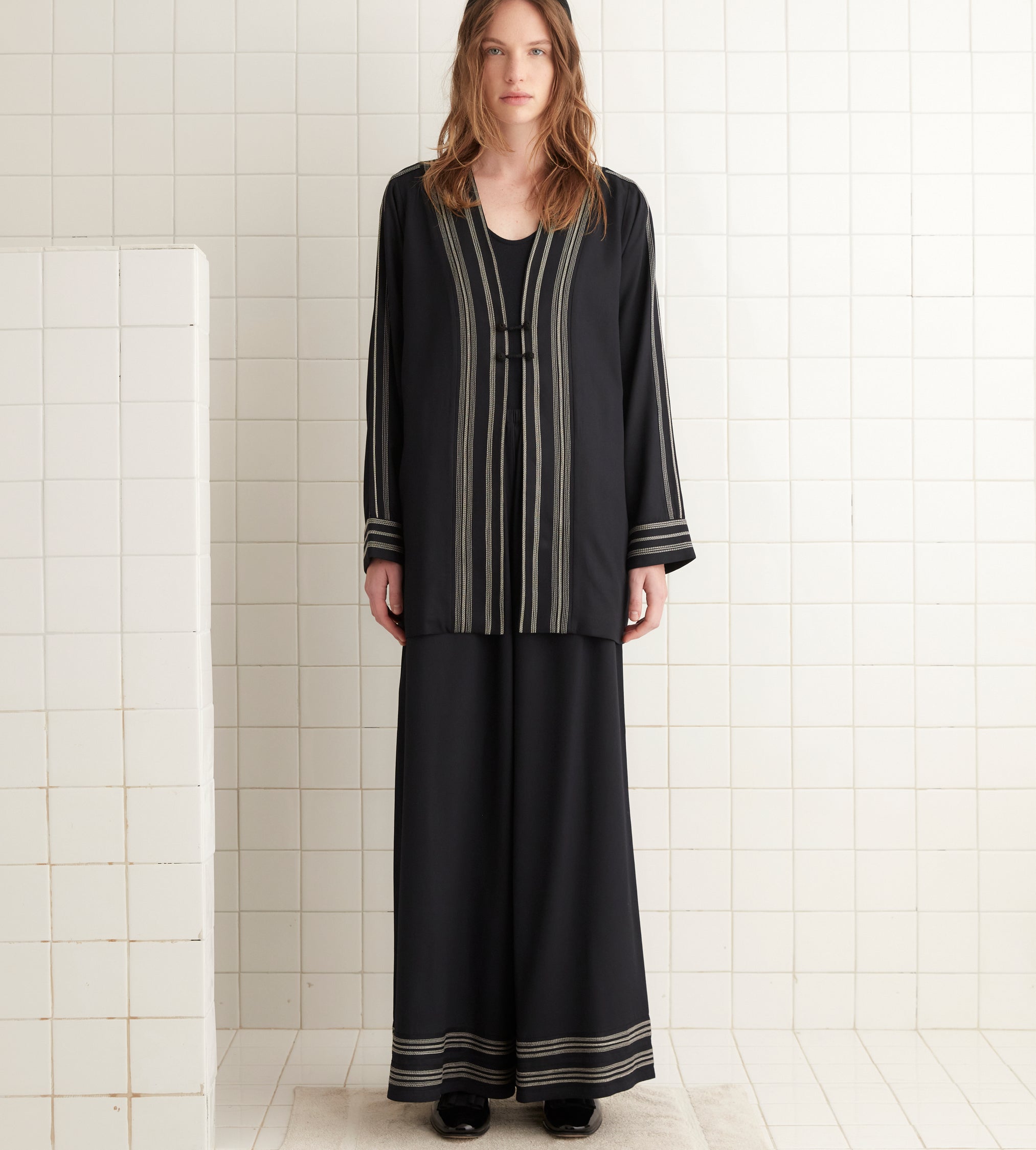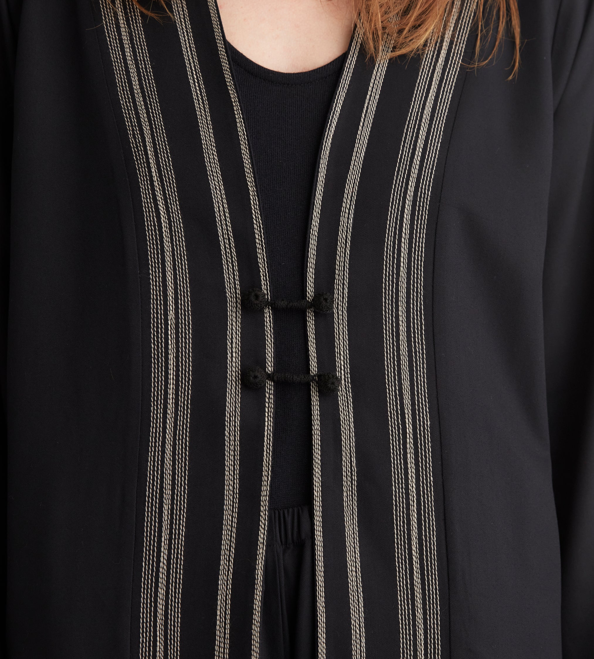 This jacket is inspired by a 1940s peignoir. We reproduced the running-stitch embroidery around the collar and sleeves of this style, which buttons with crochet closures.