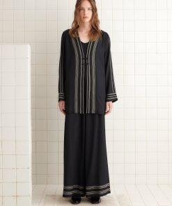 This jacket is inspired by a 1940s peignoir. We reproduced the running-stitch embroidery around the collar and sleeves of this style, which buttons with crochet closures.