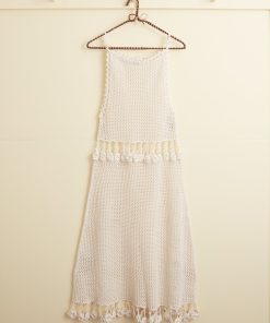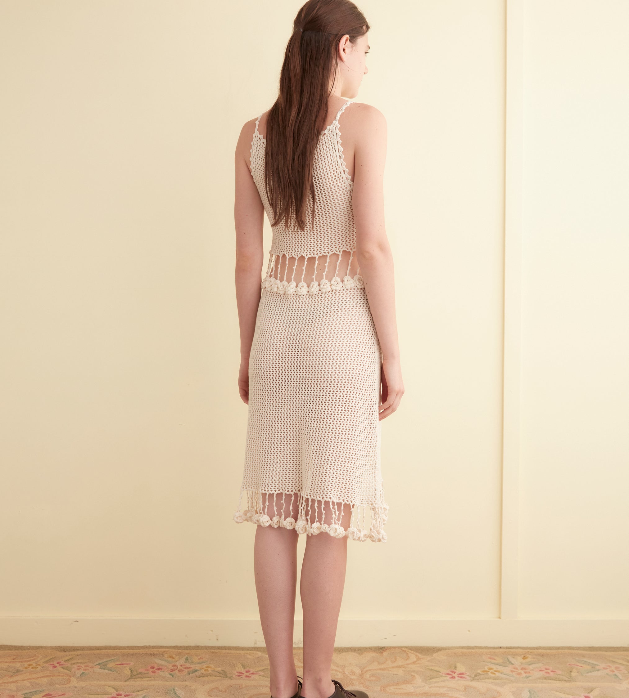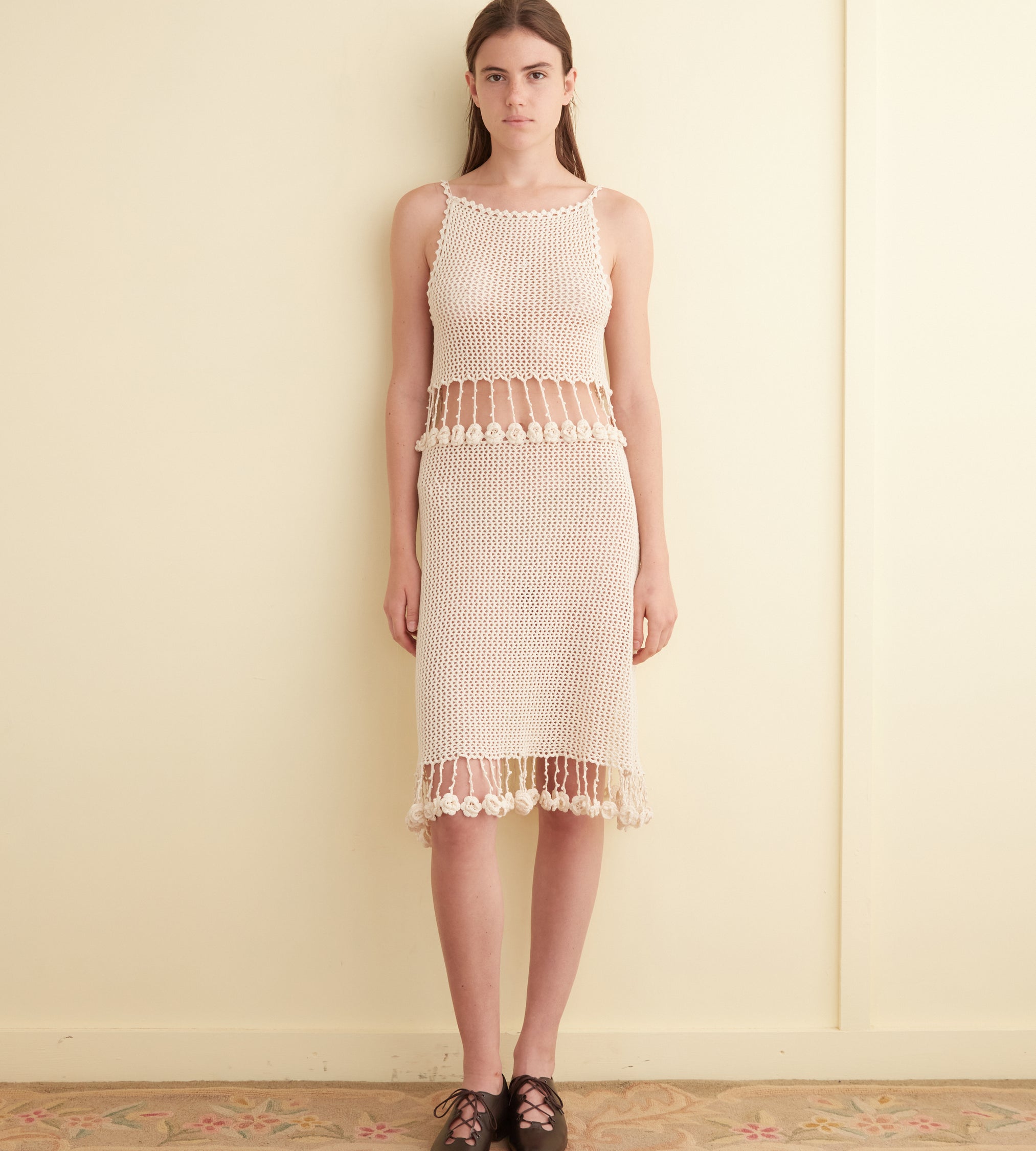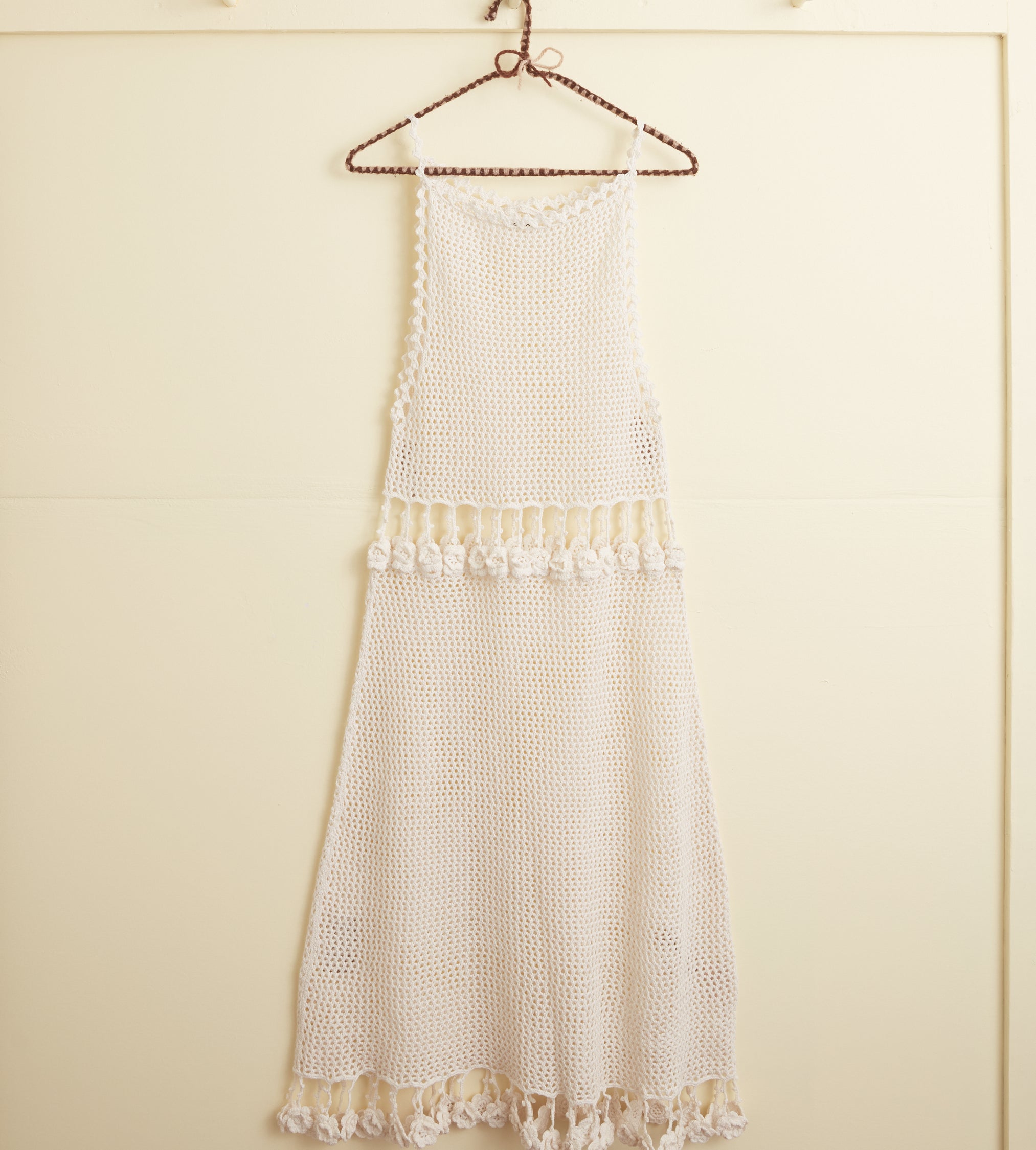 This dress is a historical reproduction of a dress from the 1970s. It features an open panel at the waist and hand-crocheted flower fringe at the hem.