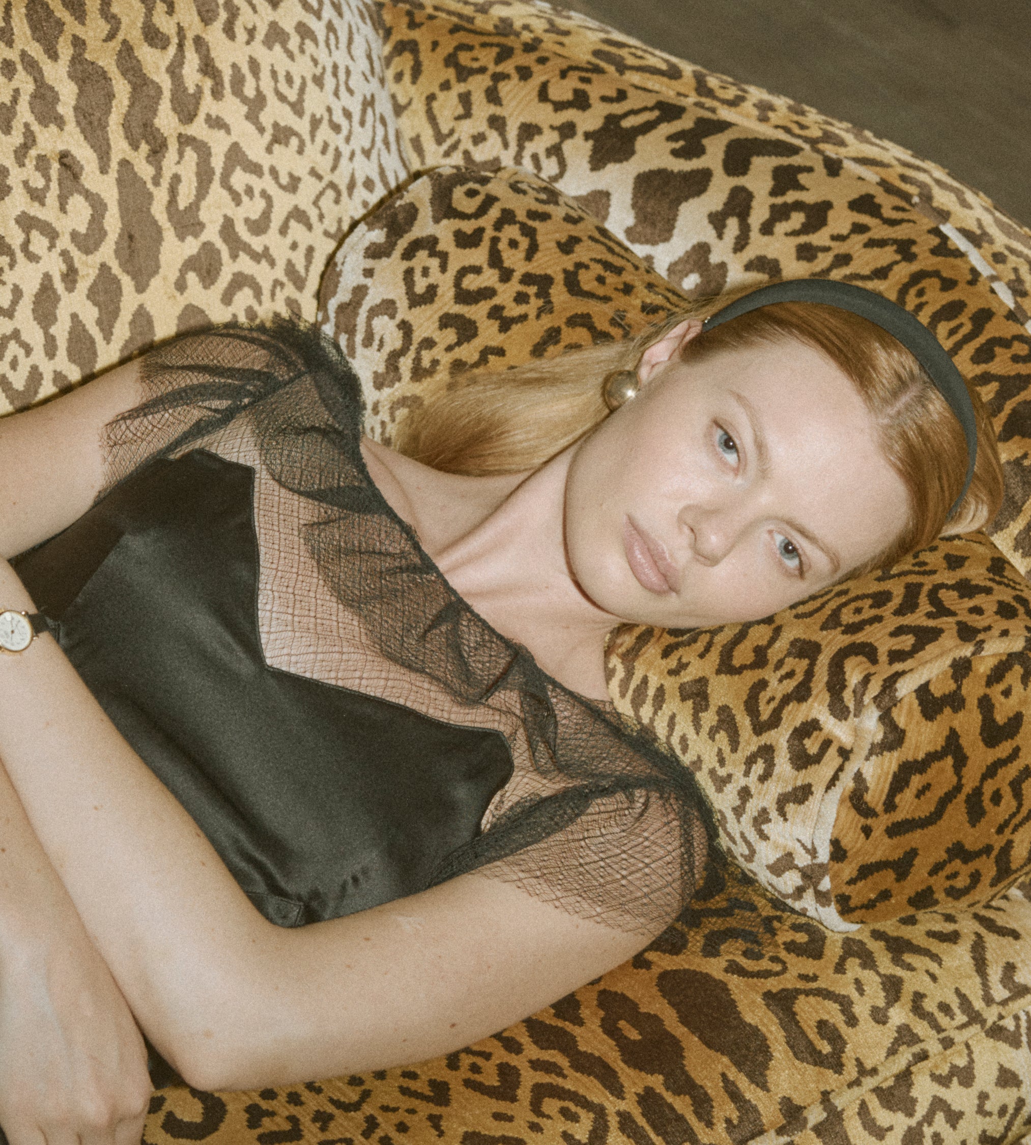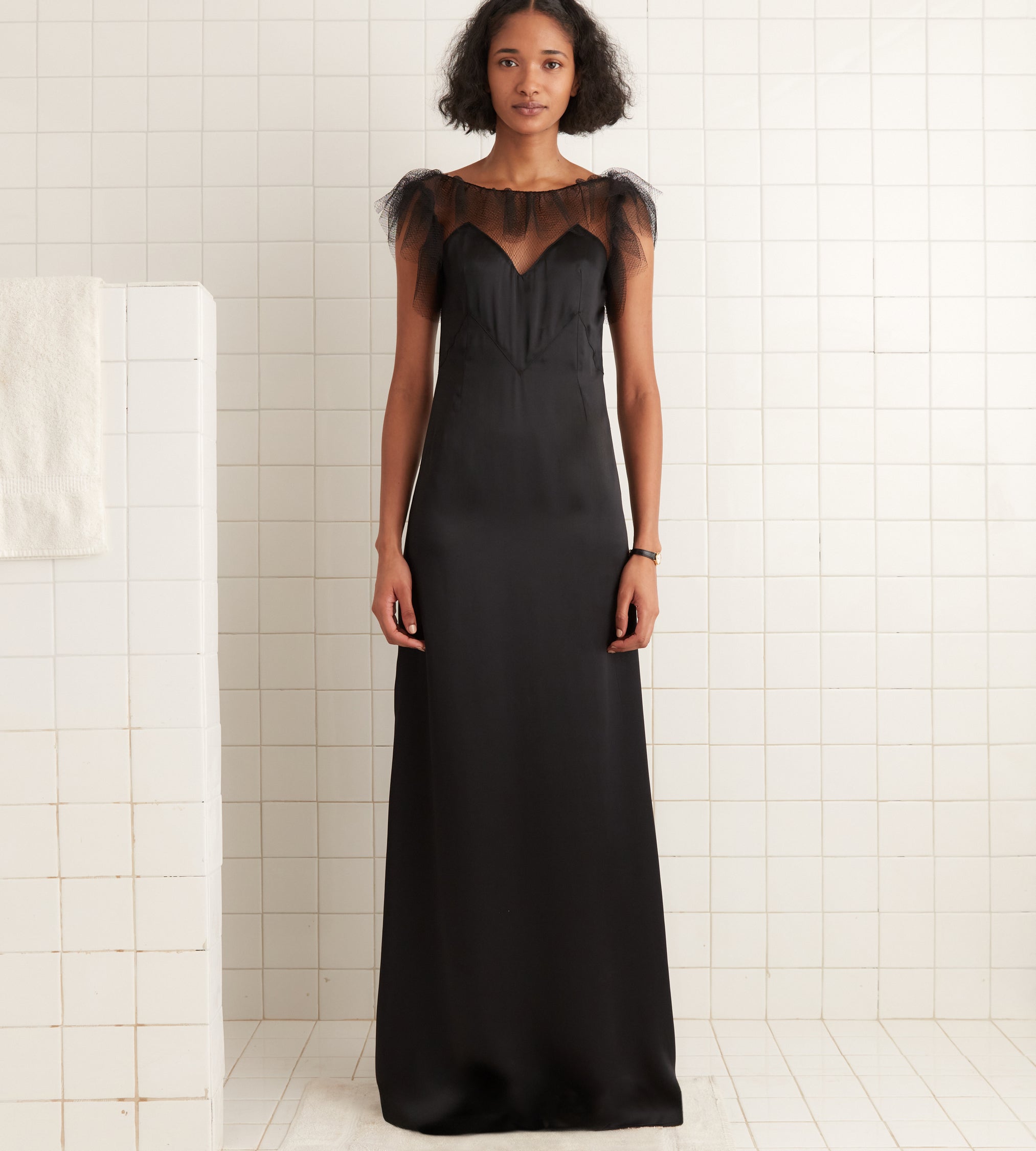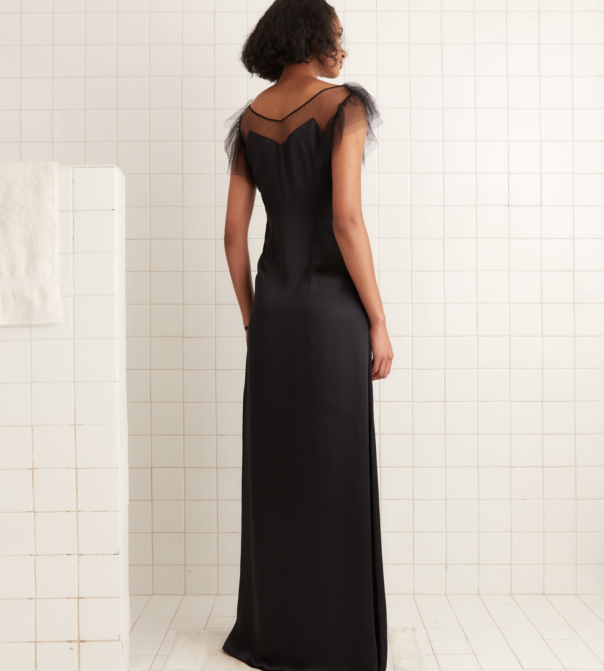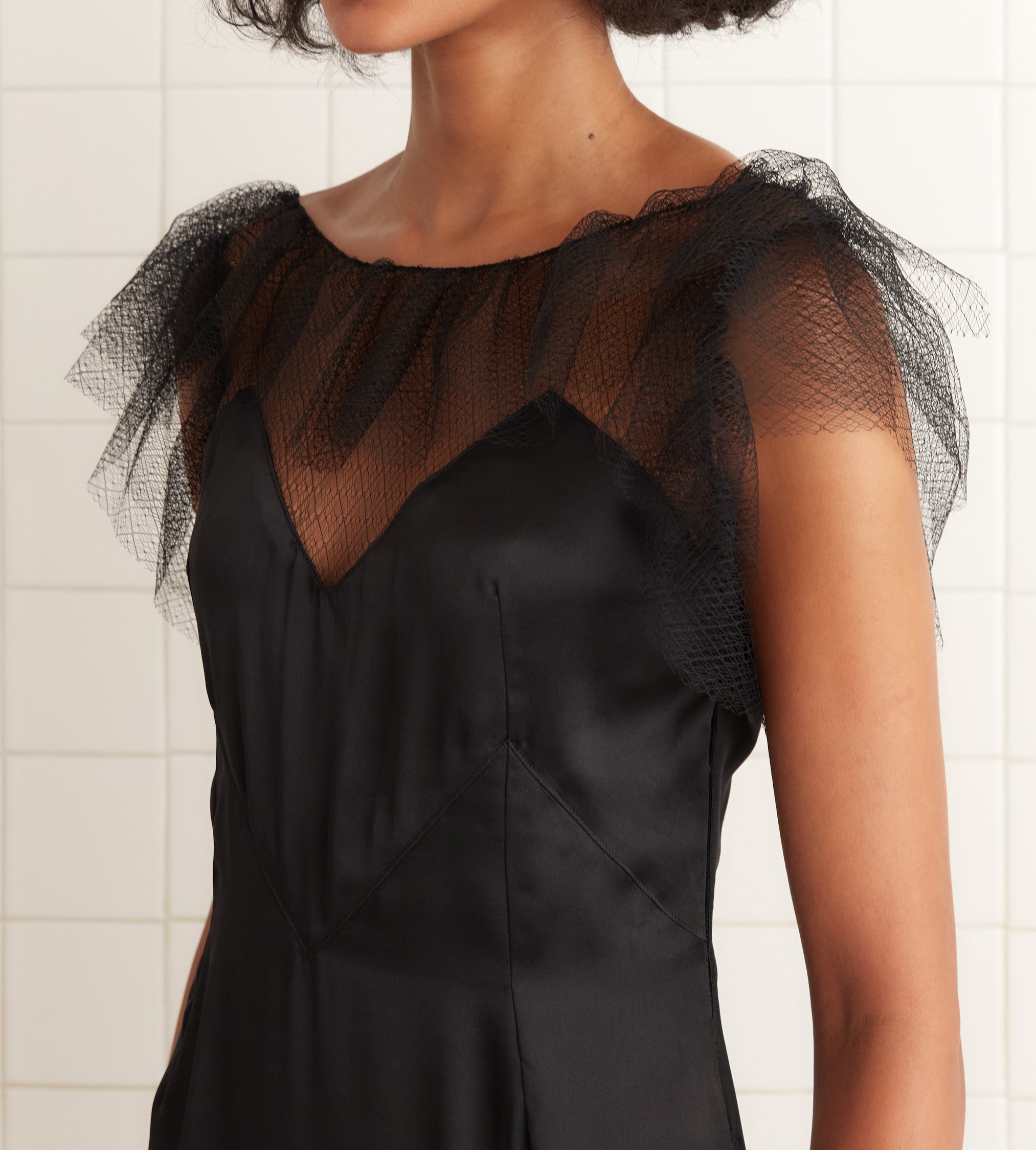 This dress is inspired by an evening gown from the 1930s. Cut from glossy black silk, it has an illusion neckline trimmed with delicate ruffles of black mesh.