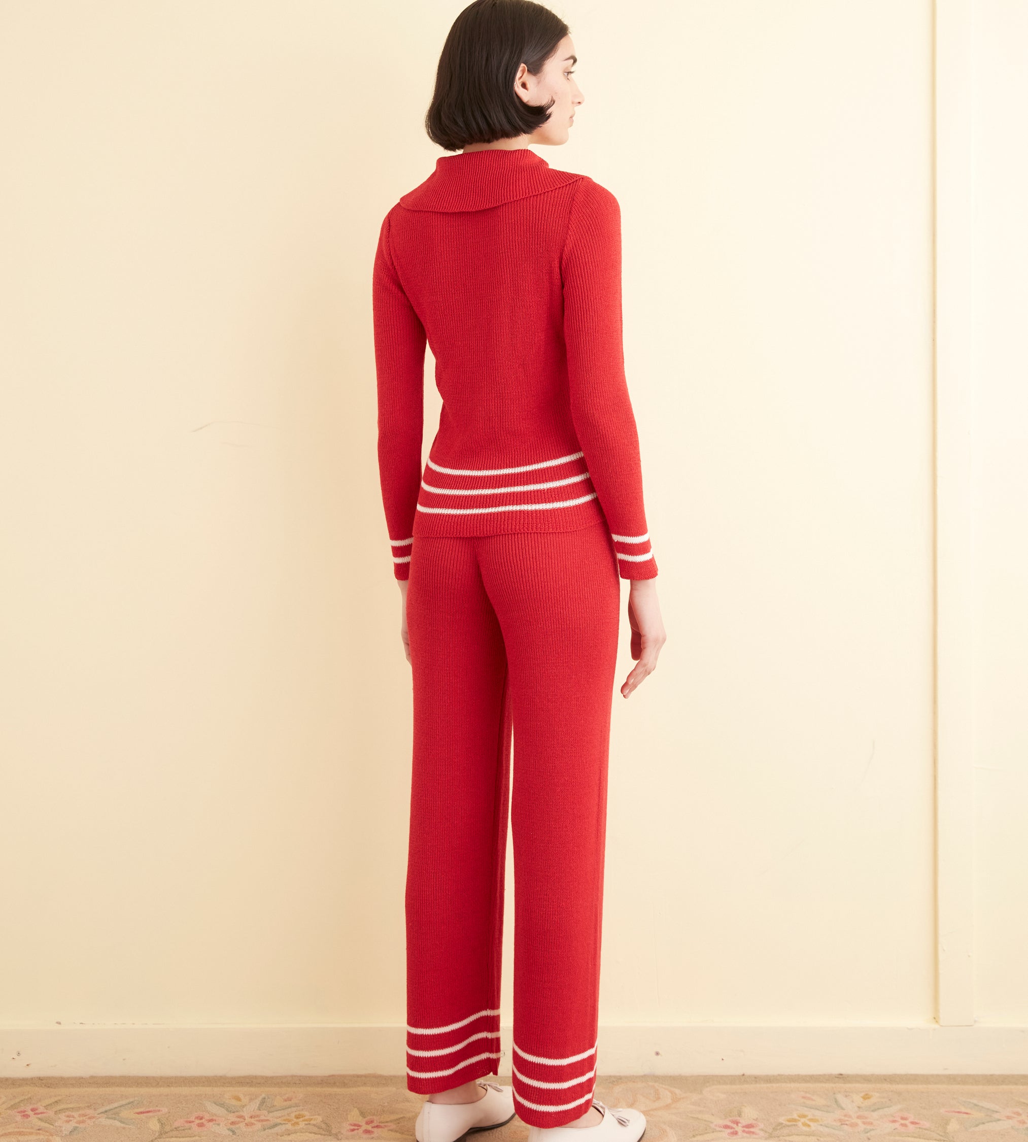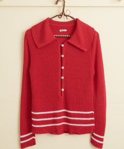 This polo is inspired by a knit set from the 1970s. We reproduced the light, silky knit of the original, with its stripes around the hem, for this style.