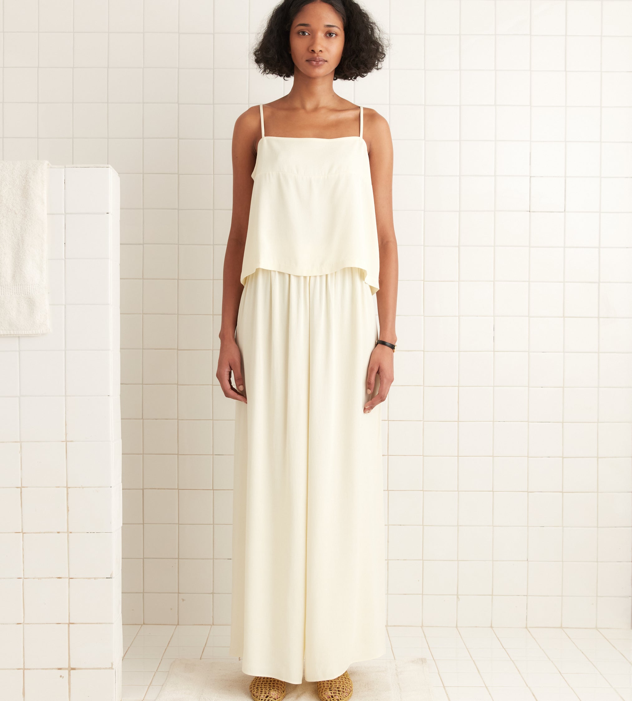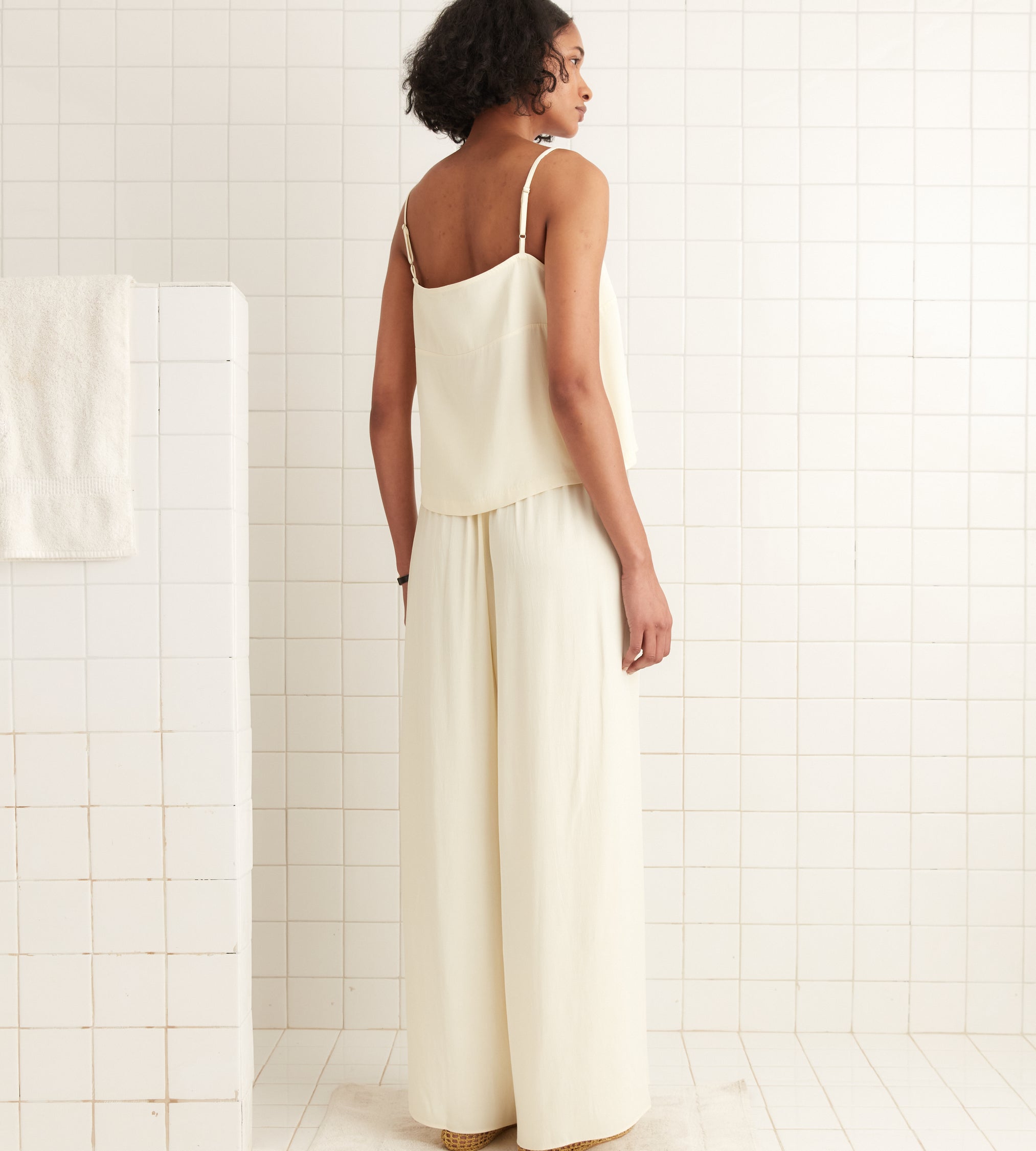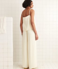 These pants are inspired by a pair of 1920s beach pajamas, a loose silhouette worn over swimsuits that evolved out of sleepwear. The wide popularity of beach pajamas helped to normalize women’s pants in the early 20th century.