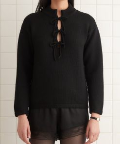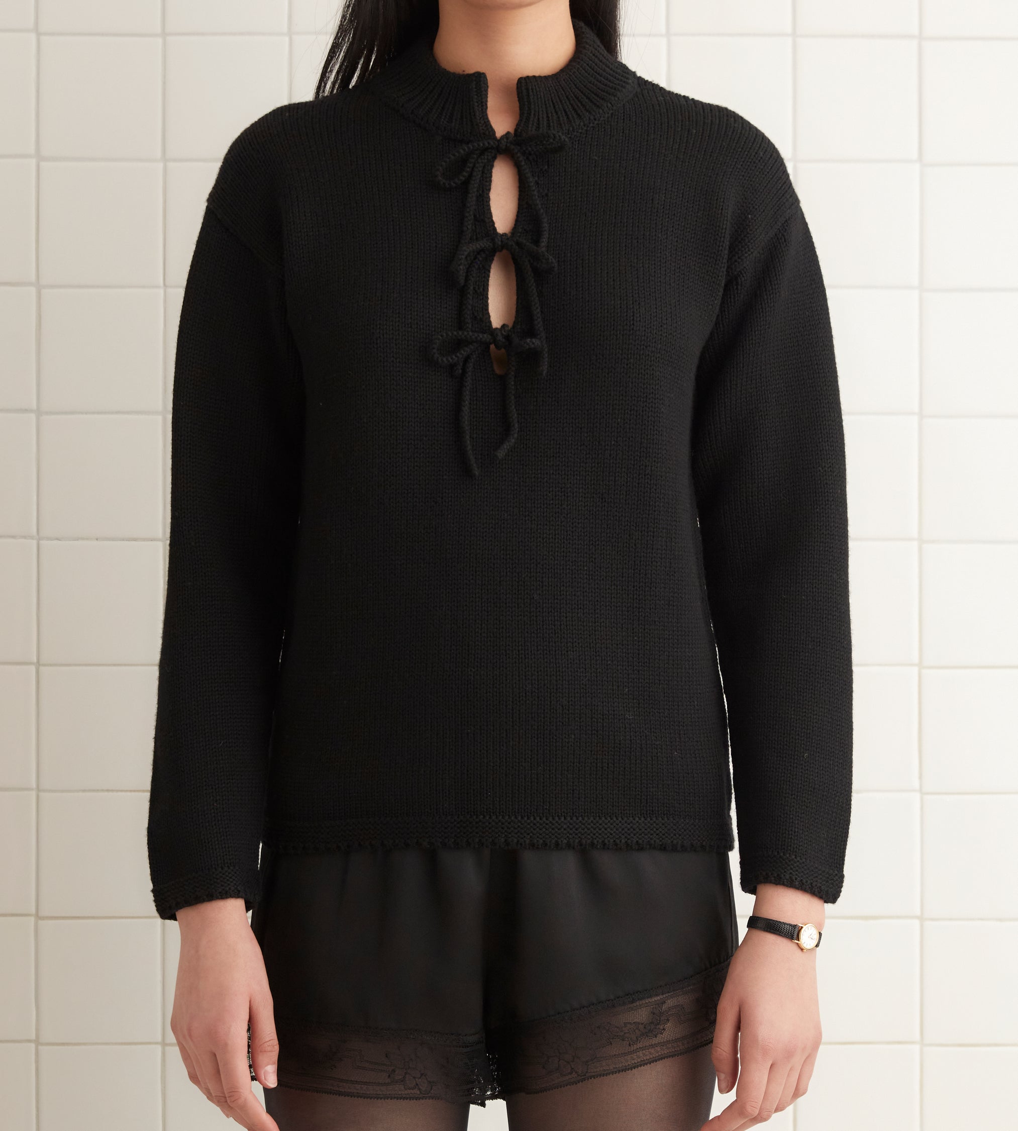 This sweater is inspired by a 1940s European fishermen’s pullover. Made from merino wool, it features three front ties at the collar.