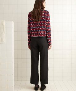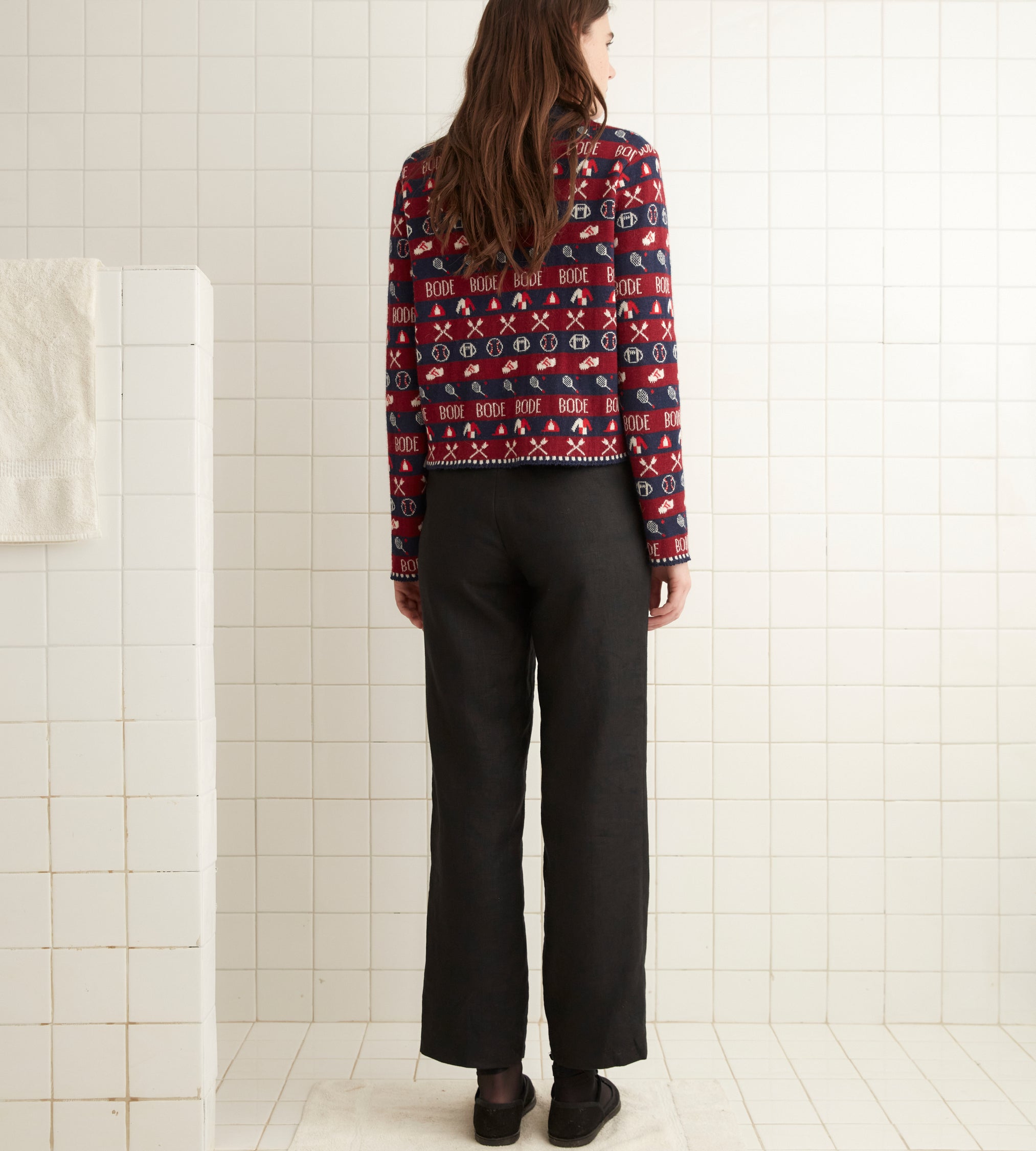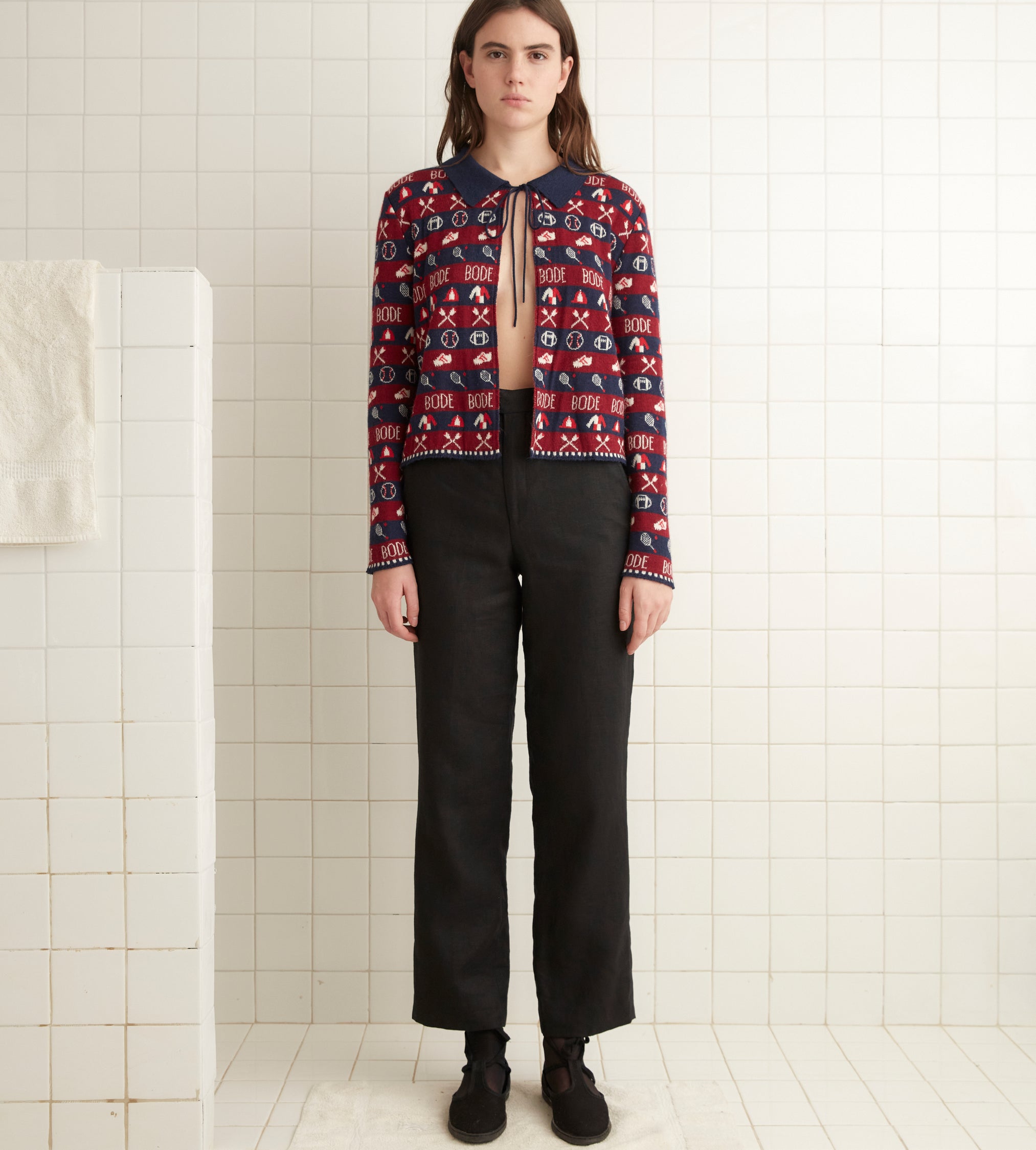 This cardigan is inspired by a jacquard-knit ski cap from the late 20th century. We reproduced the knit pattern for this style, incorporating sports motifs and the Bode logo into the stripes. The cardigan features a contrast collar and a tie-front detail.