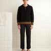 This cardigan is inspired by a jacquard-knit ski cap from the late 20th century. We reproduced the knit pattern for this style, incorporating sports motifs and the Bode logo into the stripes. The cardigan features a contrast collar and a tie-front detail.