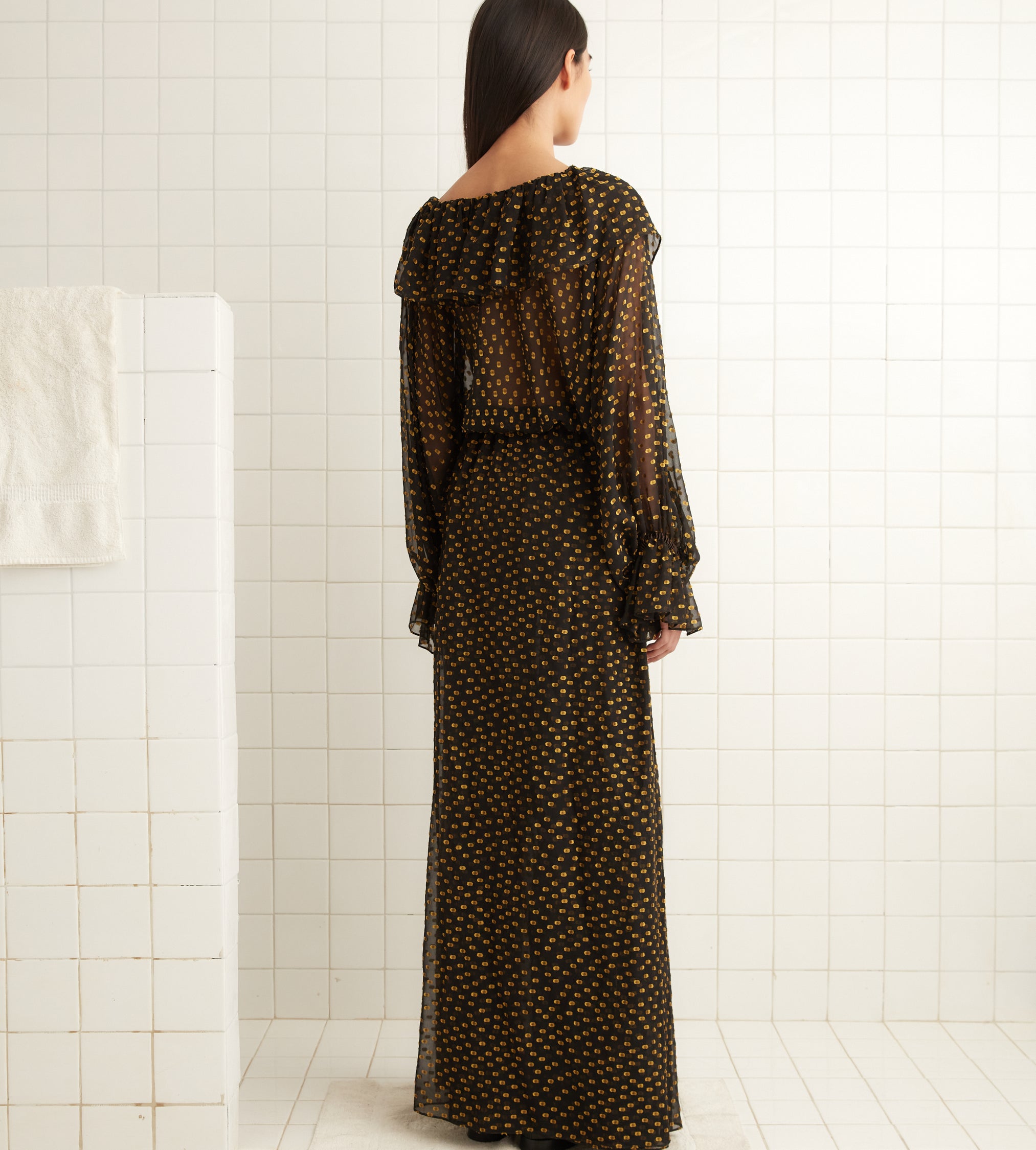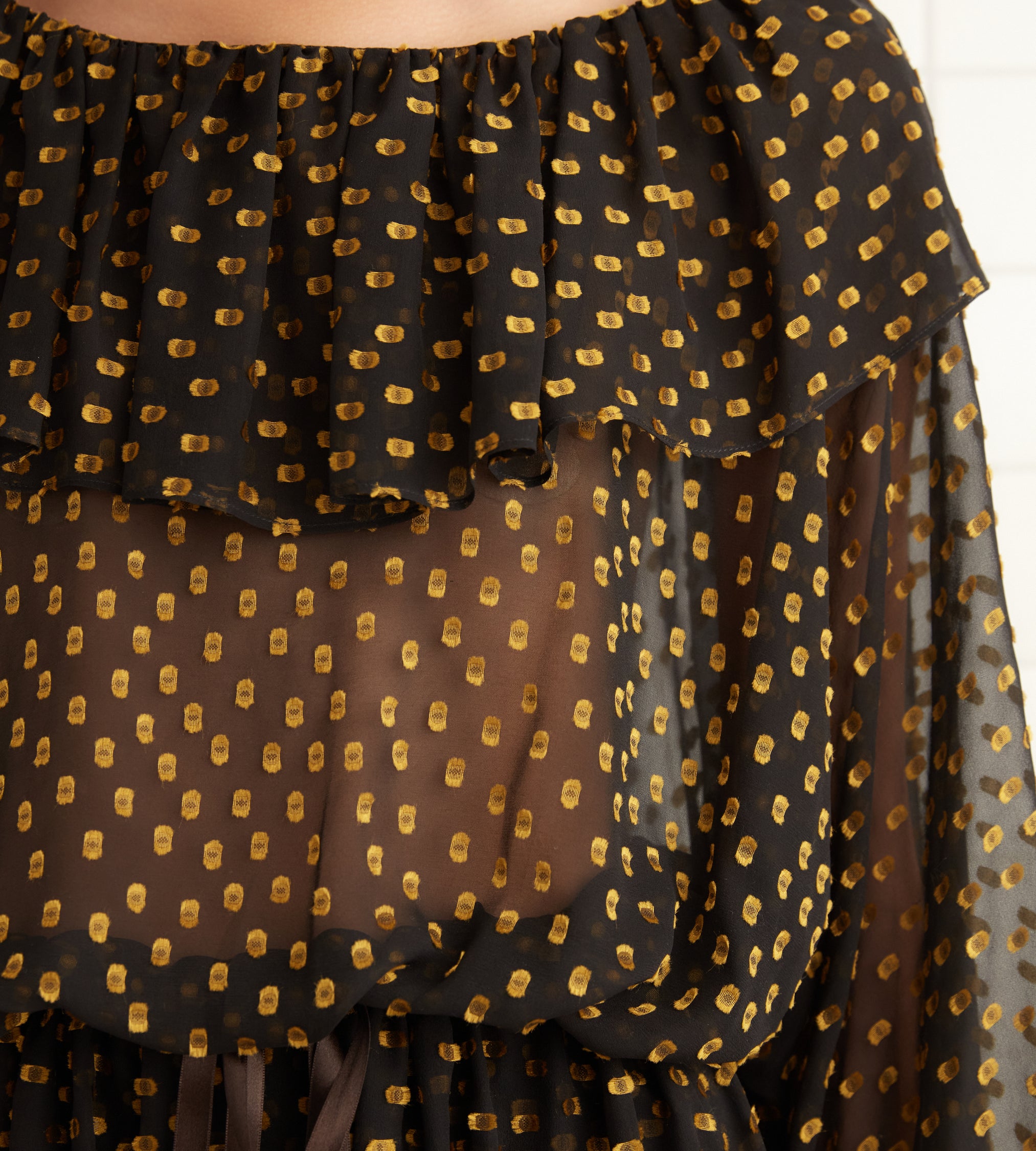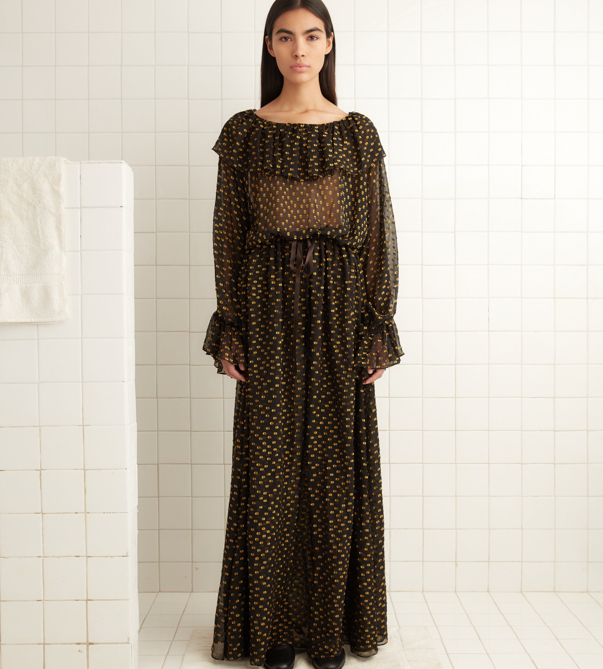 This dress is inspired by a French blouse from the late 1960s. It is made of sheer fil coupé—meaning “cut threads,” a style of jacquard weaving in which some of the fabric is cut away, leaving a raised, textured pattern. The dress features wide ruffles at the collar and cuffs and can be cinched at the waist.