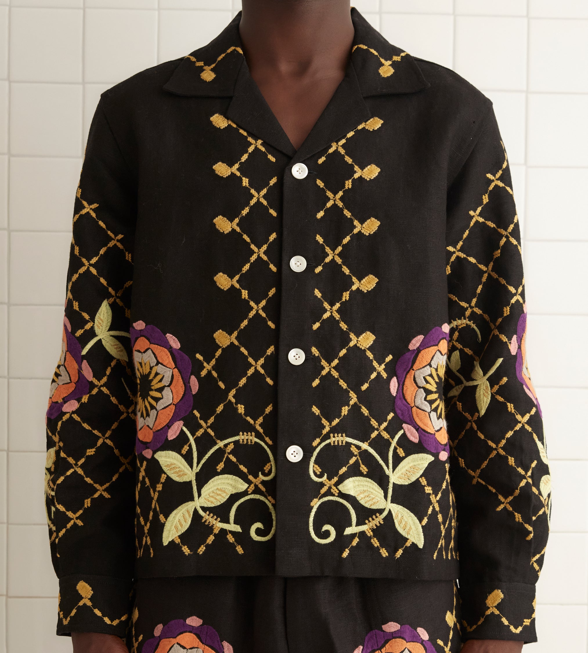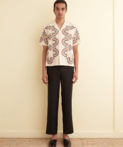Pantalon en coton denim bleu avec des poches brodées d’une guirlande de fleurs bleues et volantées sur le pourtour.