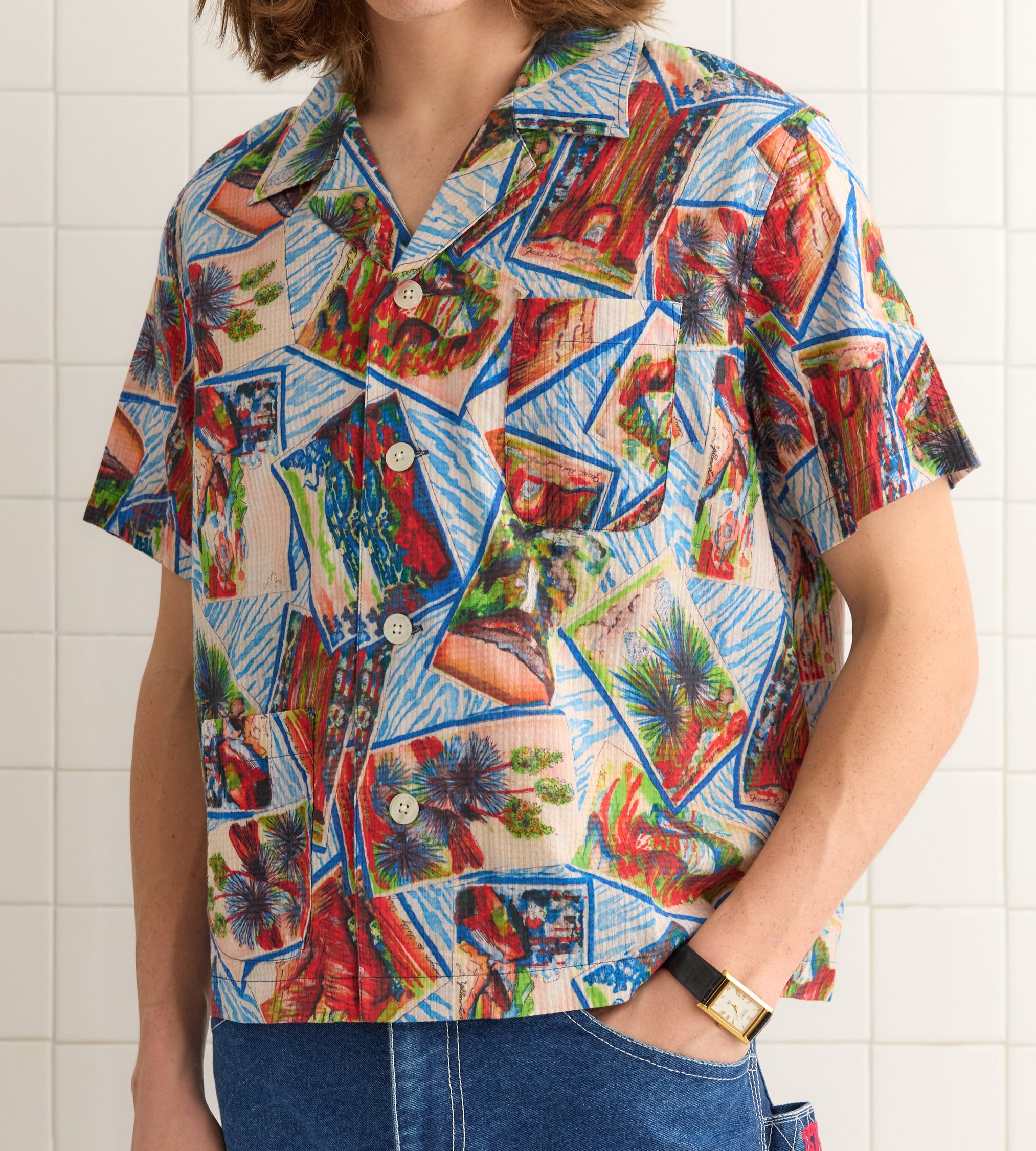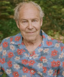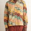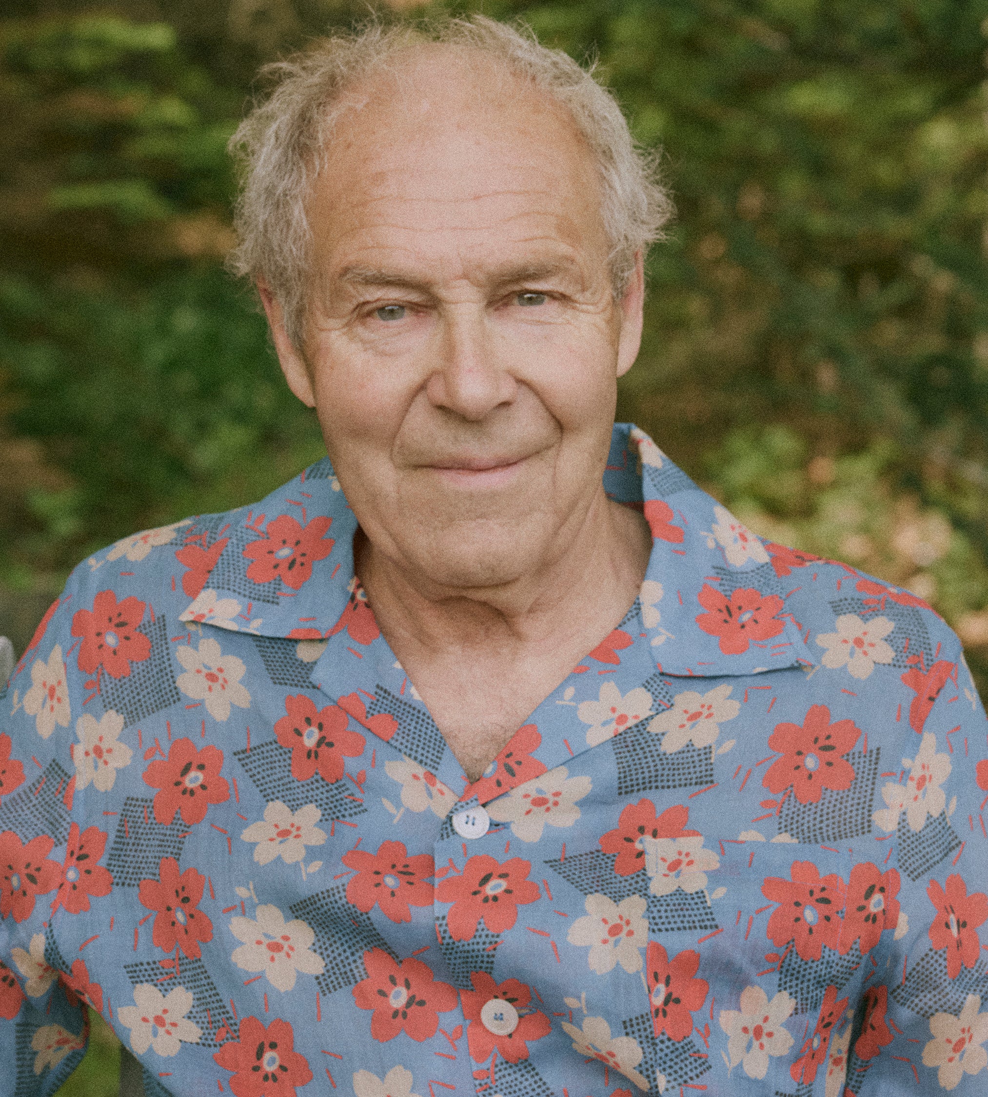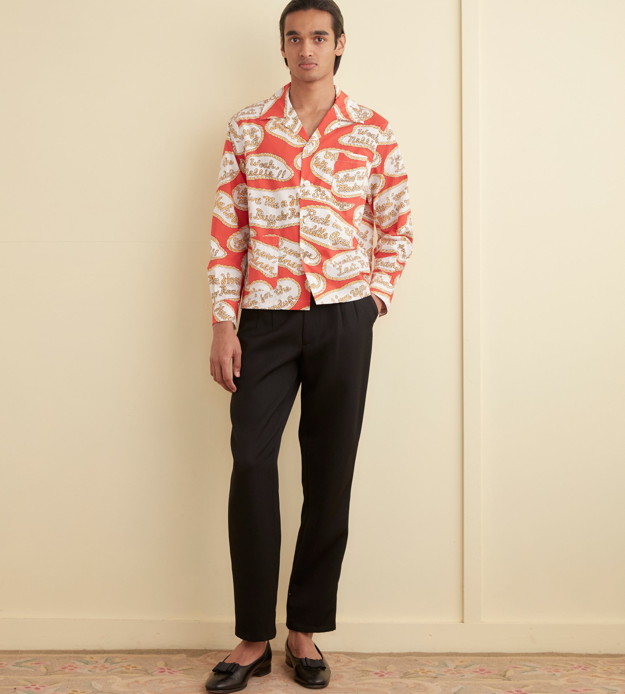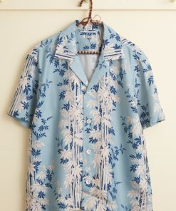 Blouse à manches longues en coton et soie imprimée de fleurs beiges sur fond noir.