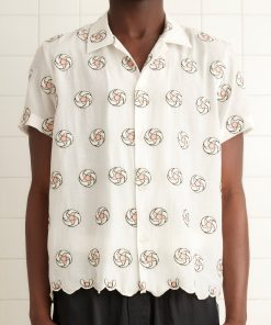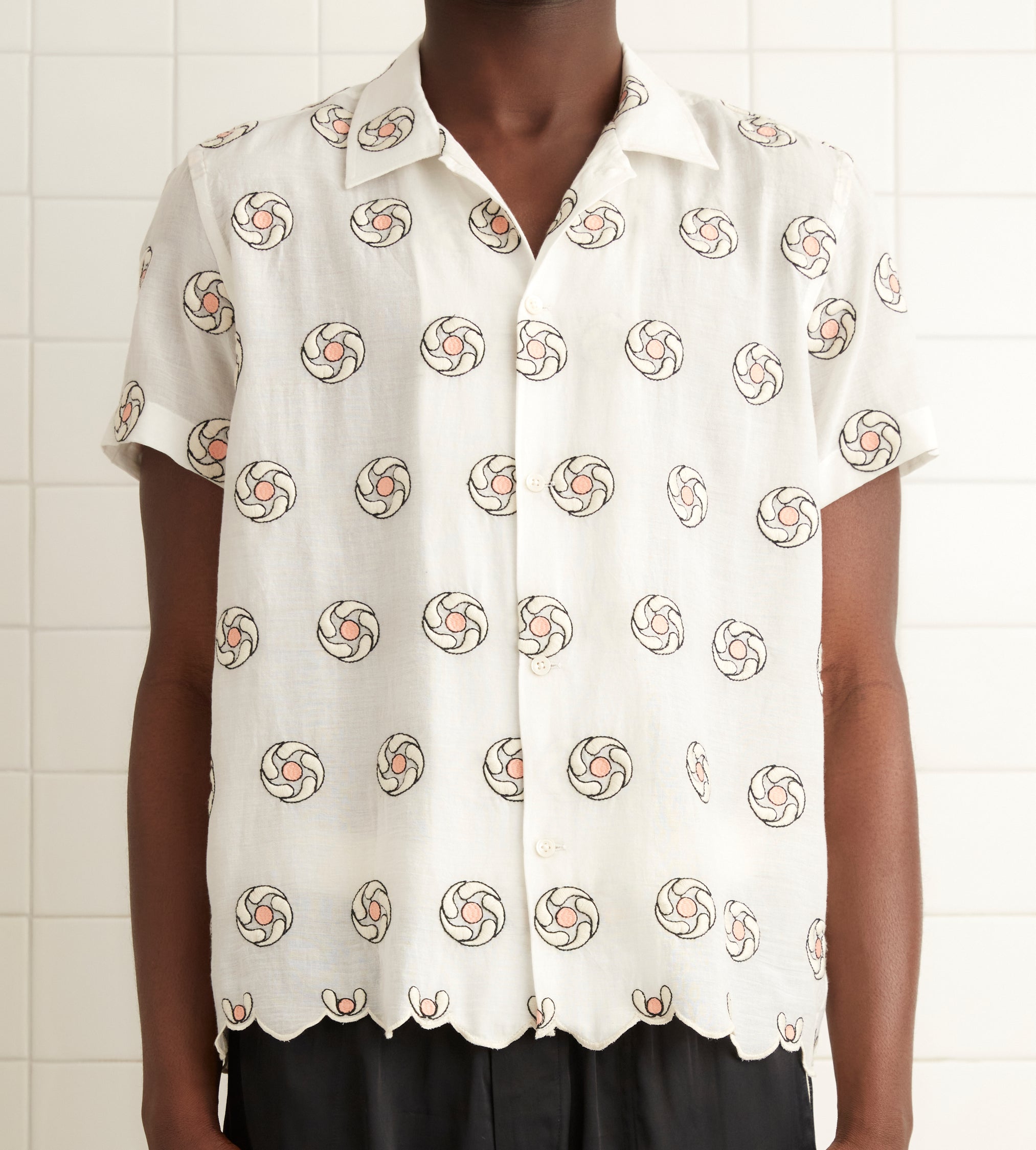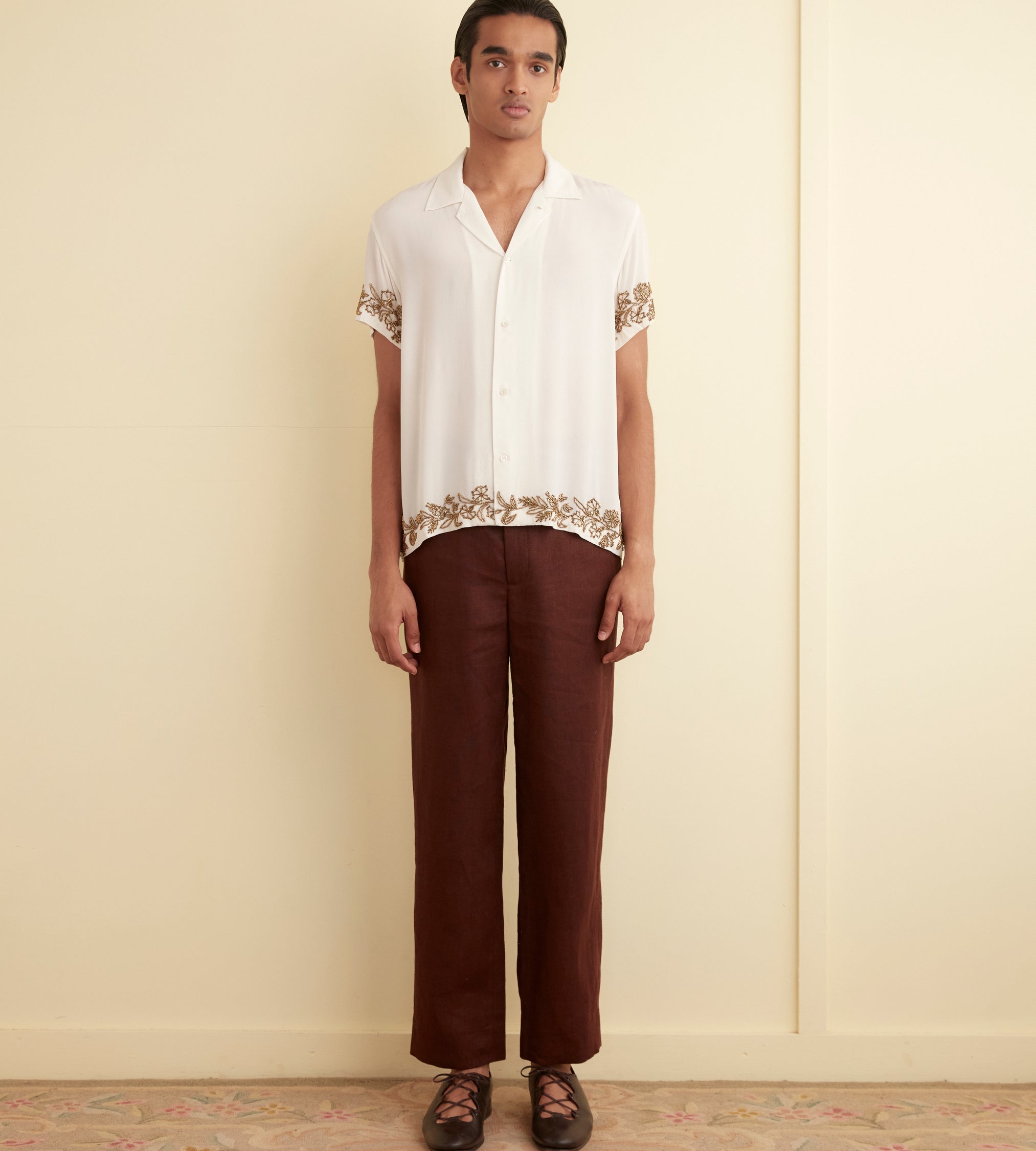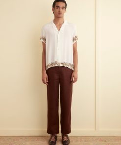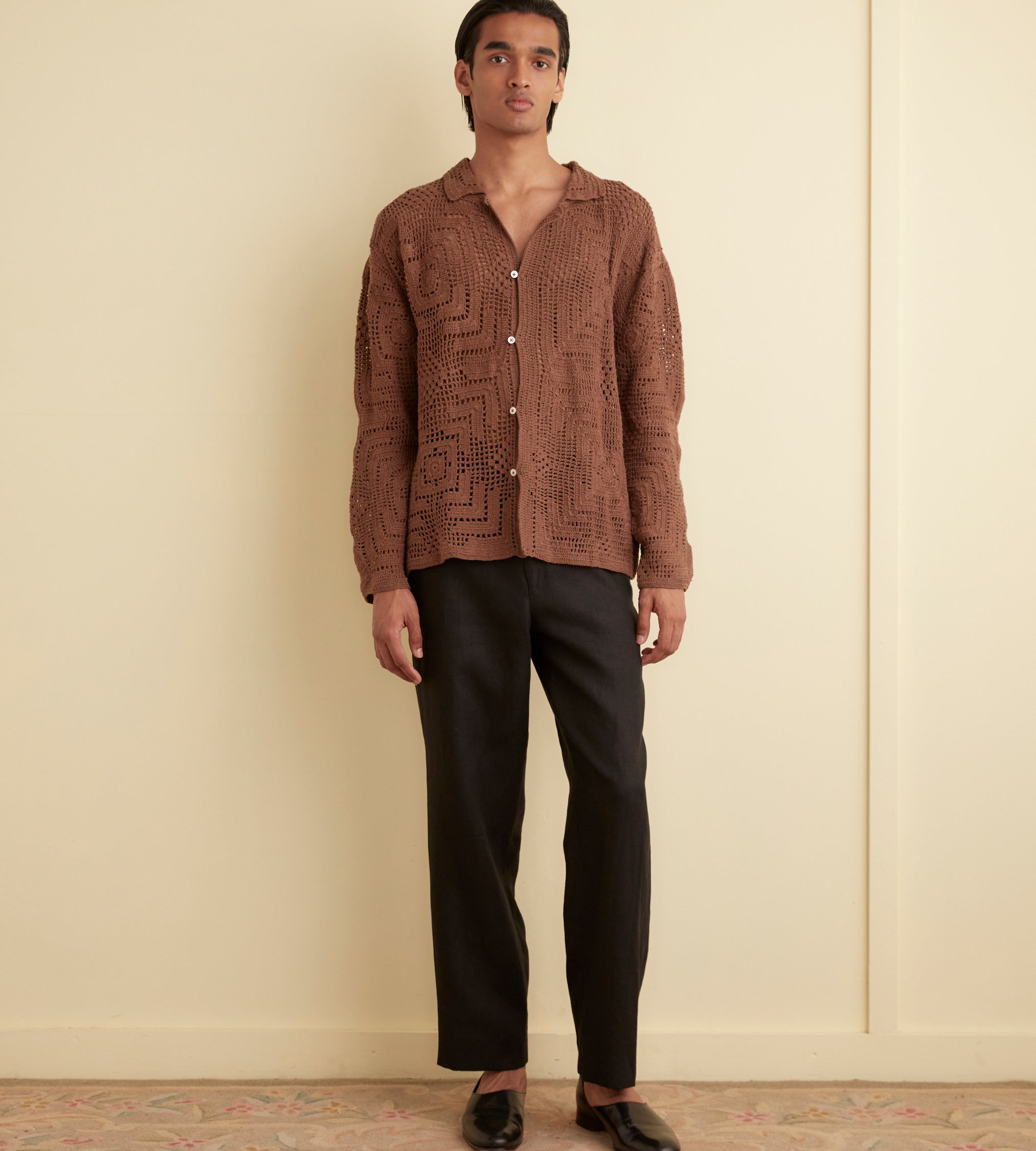 Blouse en coton, d’une douceur incroyable, brique. Une blouse qui tire sa délicatesse des inserts de dentelles et de jours échelle, des plis couchés sur les manches et du galon brodé autour des manchettes et de l’encolure.